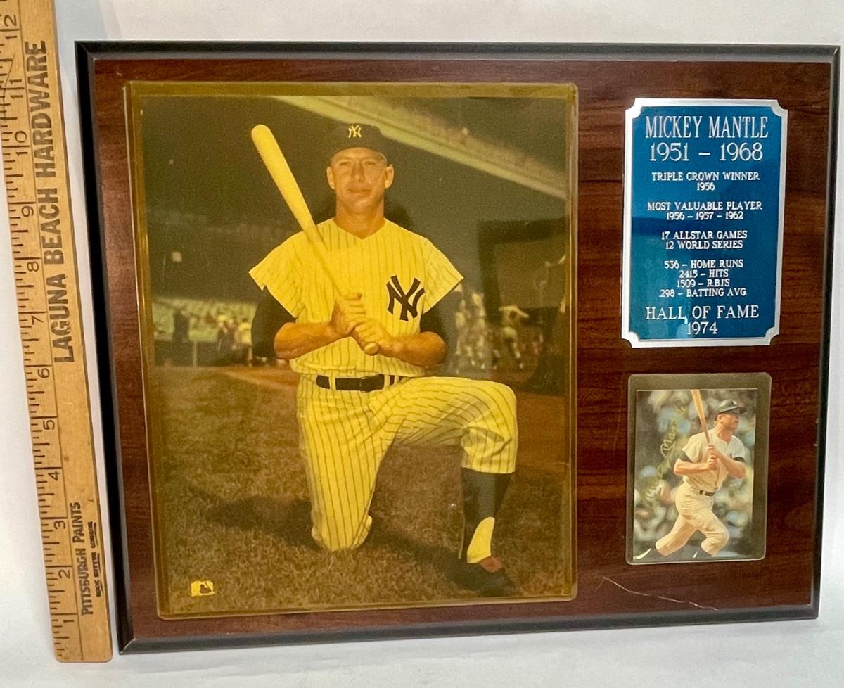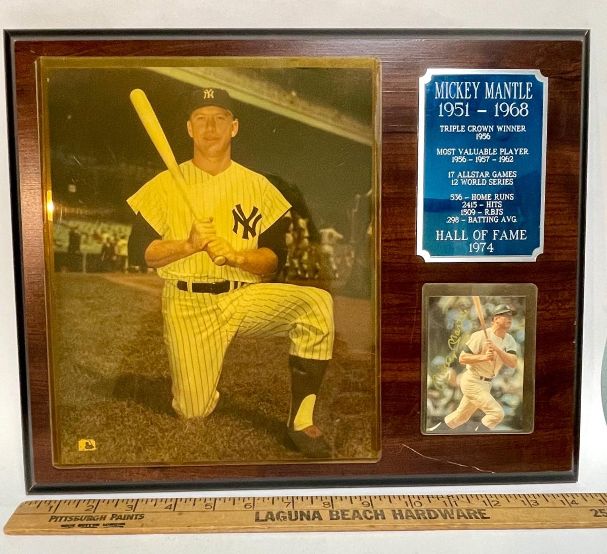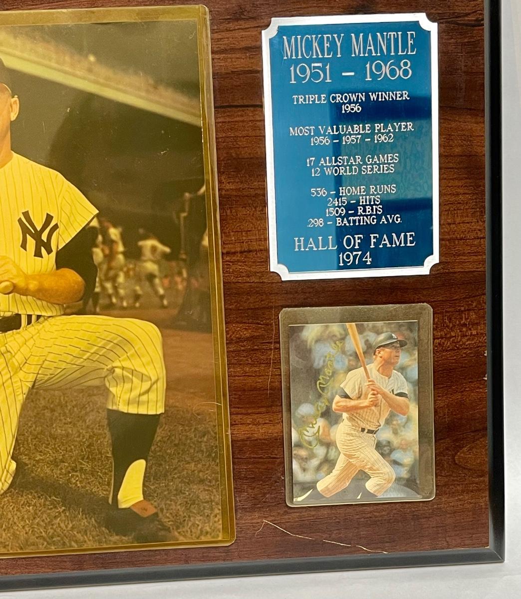 NY Yankees Baseball Player mickey Mantle plaque, has a player photo, autographed baseball card and selected career stats from his playing days 1951-1968, and election to the Hall of Fame in 1974.