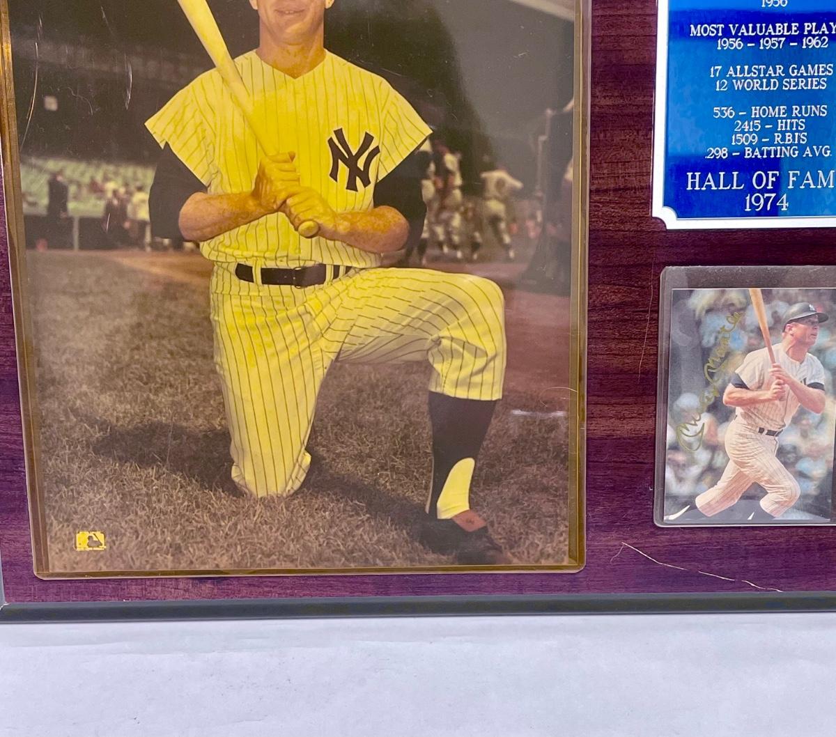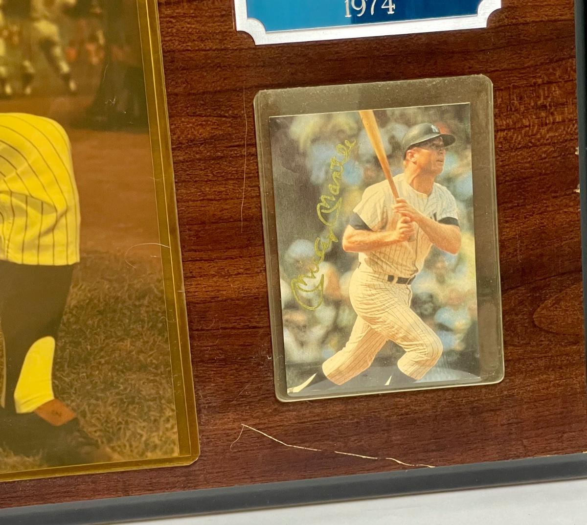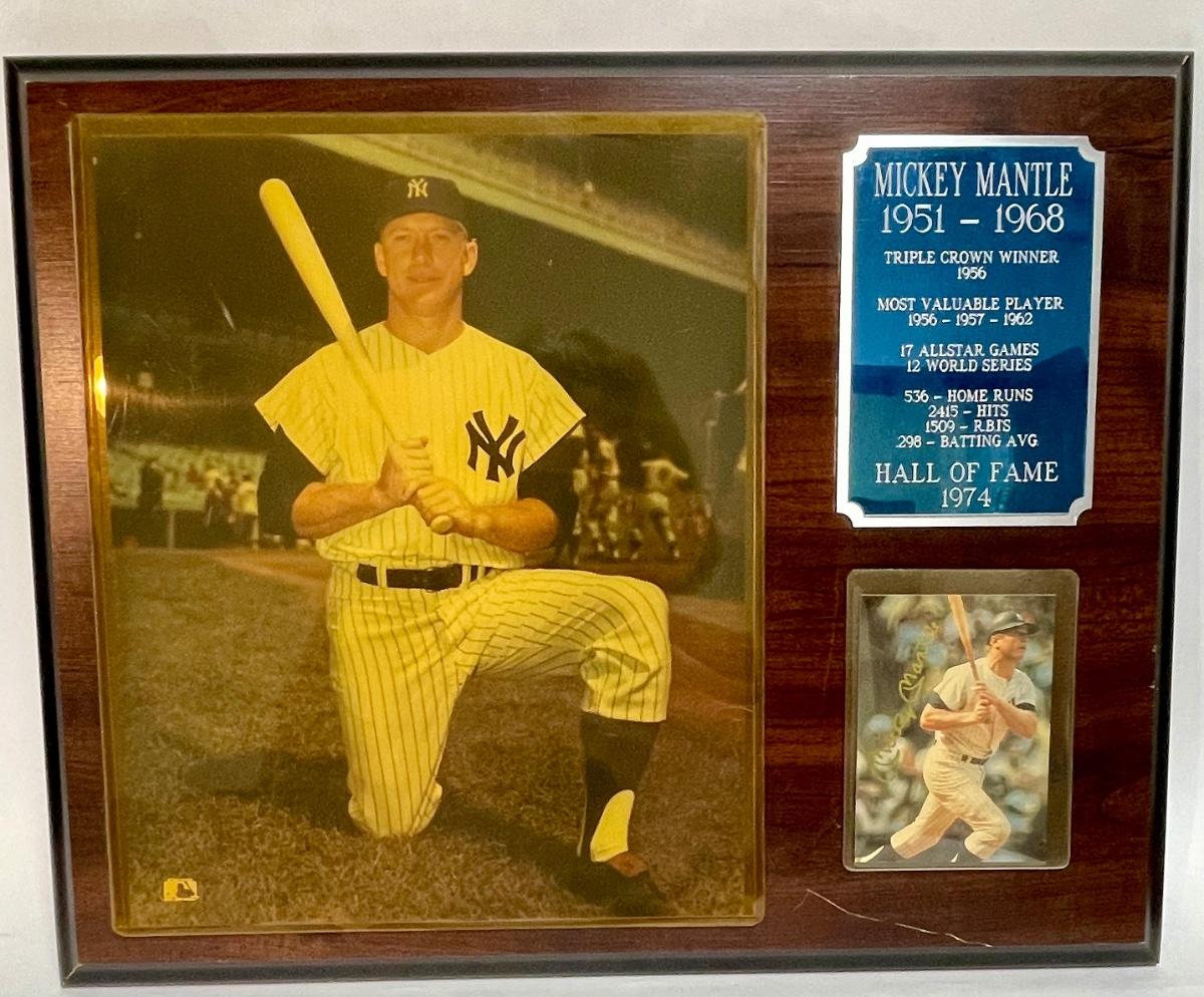 NY Yankees Baseball Player mickey Mantle plaque, has a player photo, autographed baseball card and selected career stats from his playing days 1951-1968, and election to the Hall of Fame in 1974.