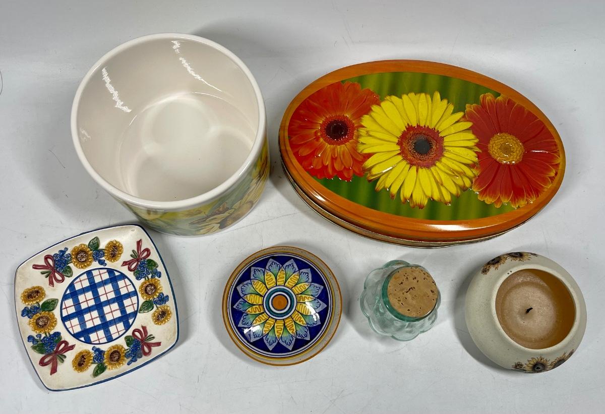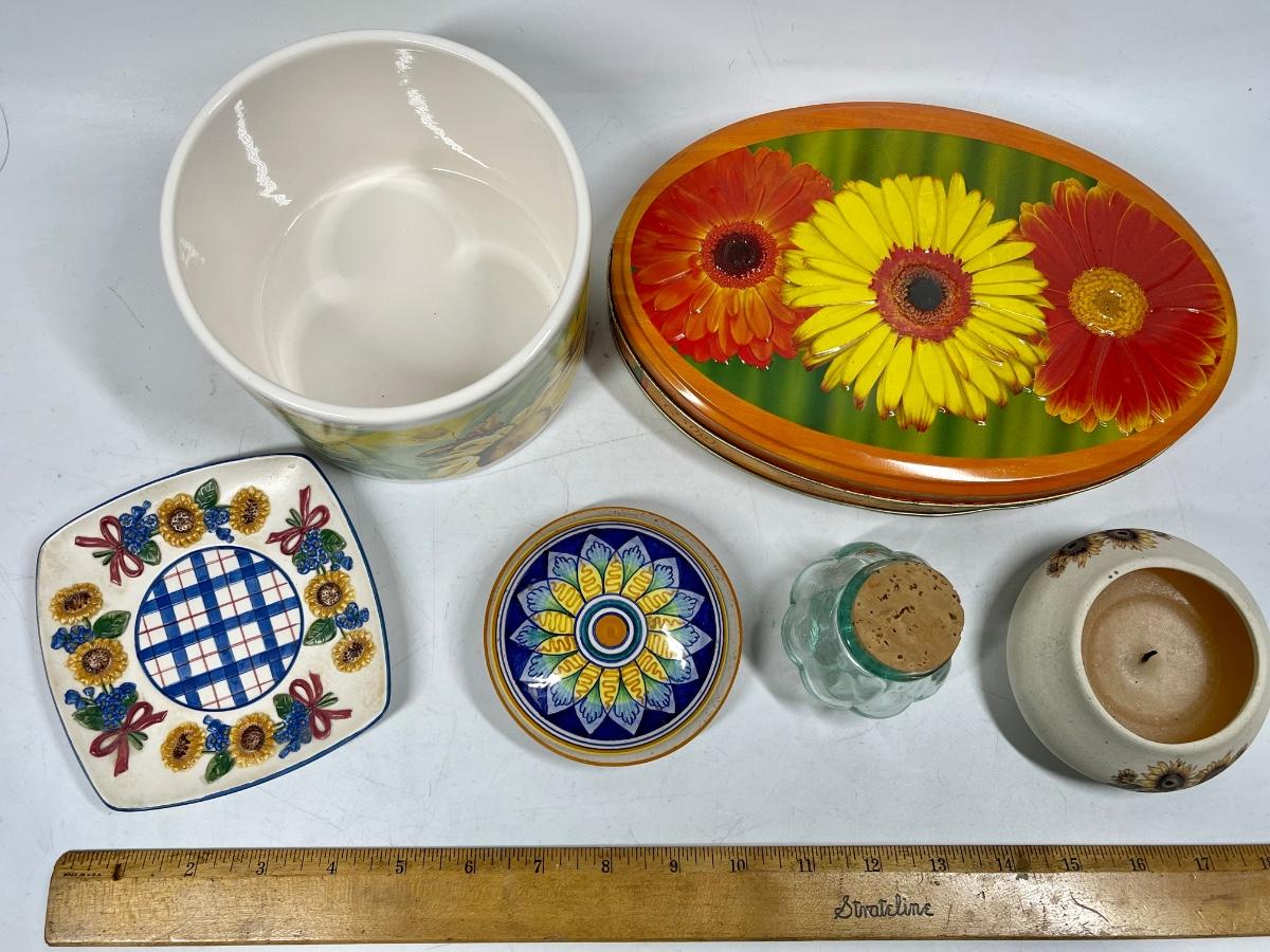 Mixed Lot of Colorful Floral Ceramic Pieces, Tin, & Glass Jar