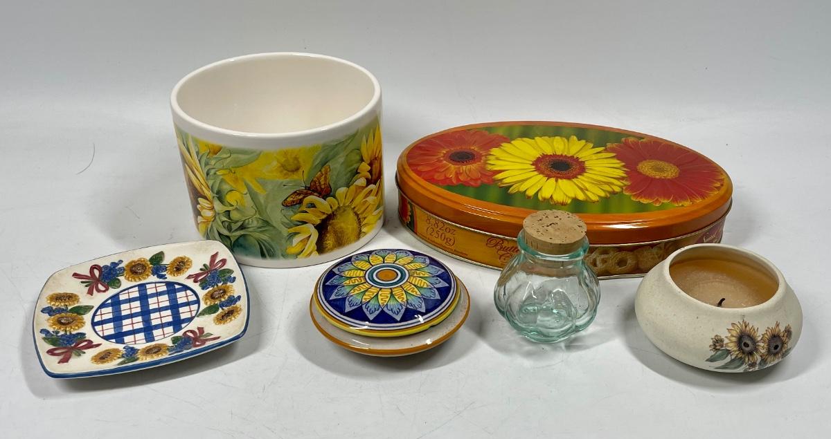 Mixed Lot of Colorful Floral Ceramic Pieces, Tin, & Glass Jar. Multiple decor pieces with floral patterns. In displayable condition. See photos.