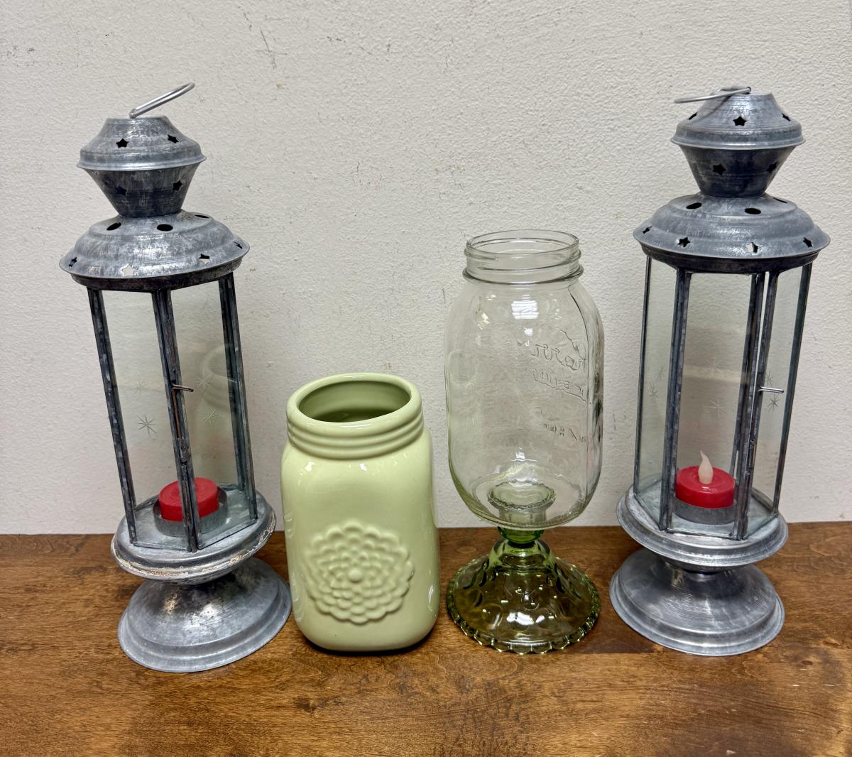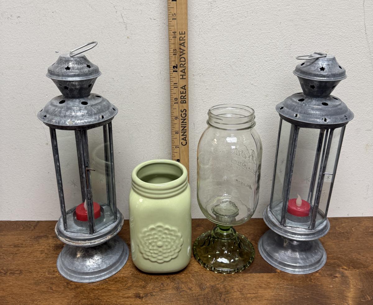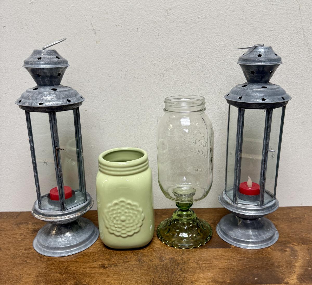 Garden Patio Decor Lot - 2 lanterns, 2 candleholder jars