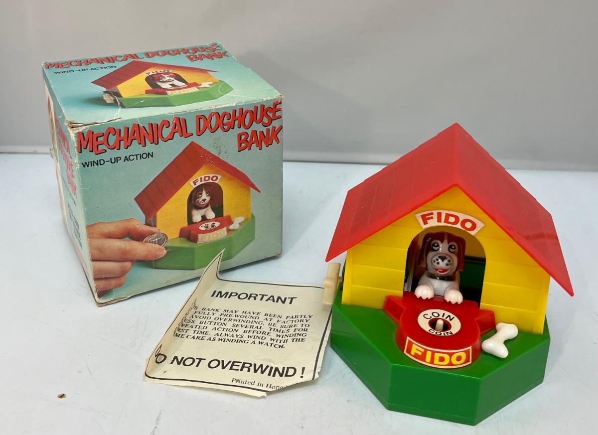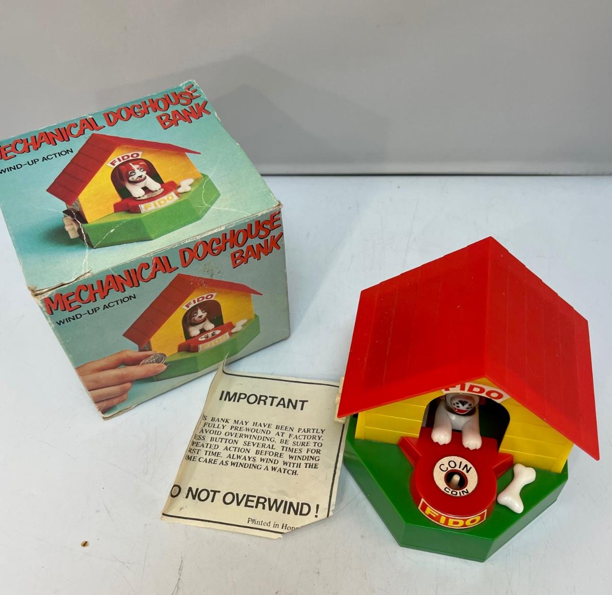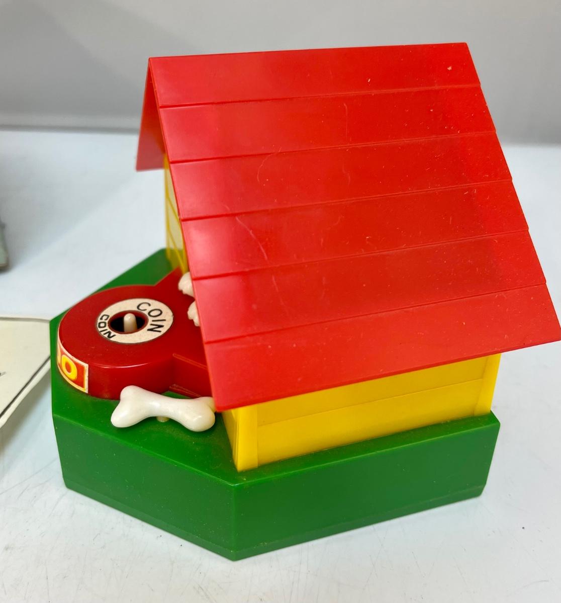 Retro Plastic Mechanical Doghouse Coin Bank with Box. In displayable condition. Untested.