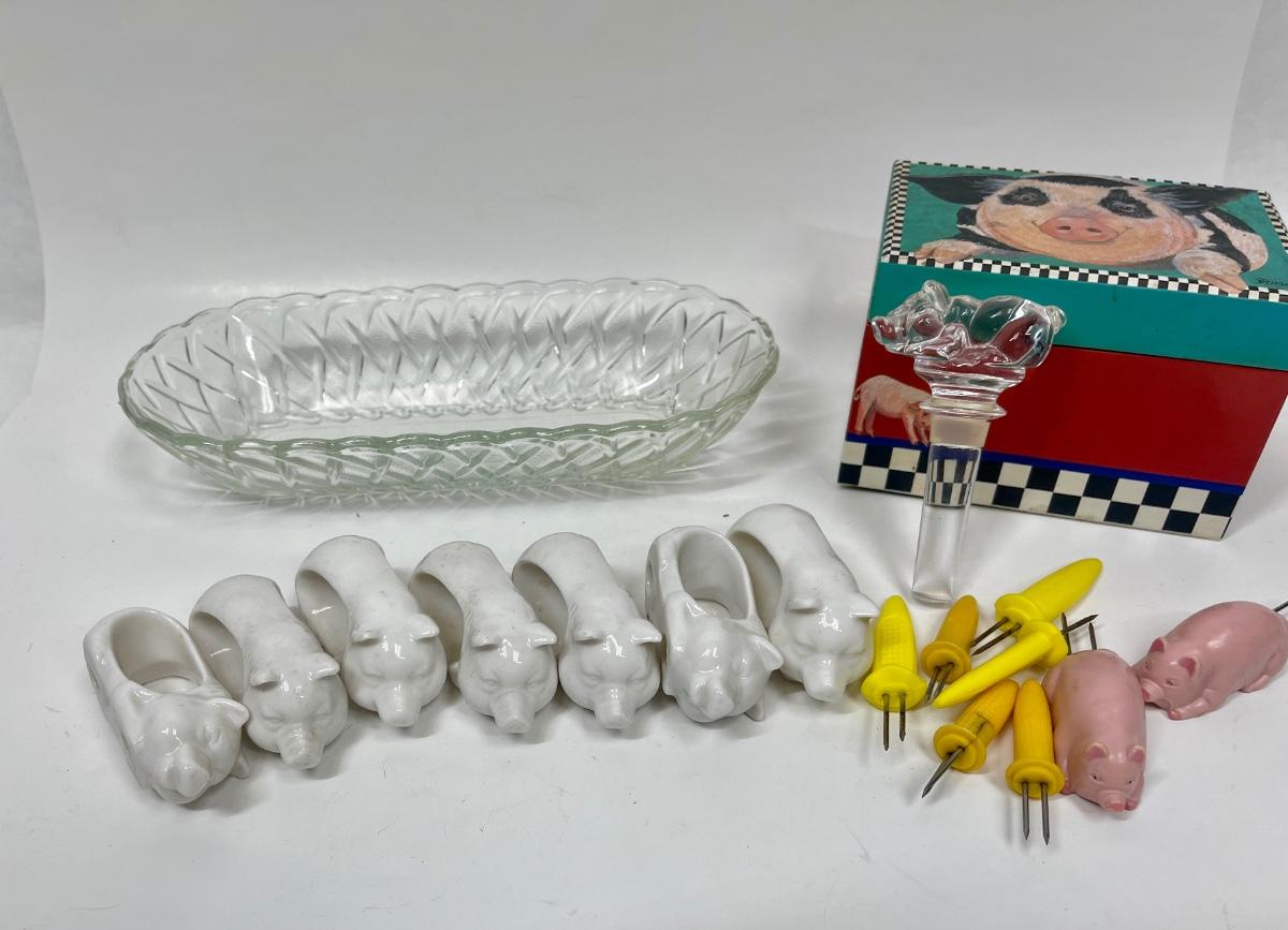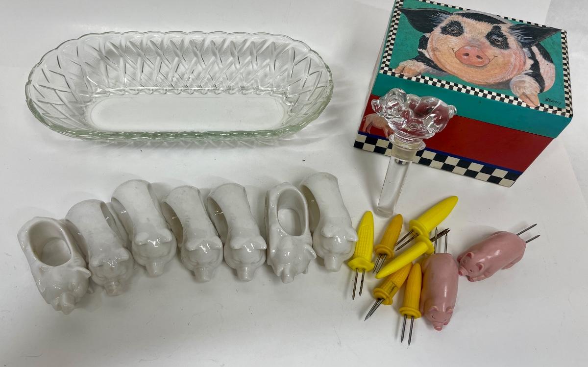 Collectible Pig Lot - Kitchen Recipe Box Corn Stabbers Napkin rings wine stopper