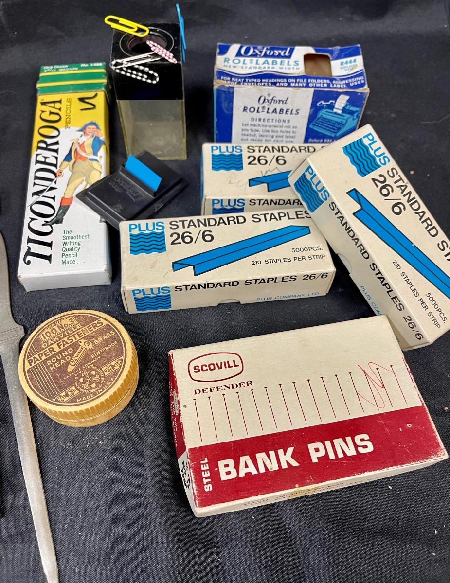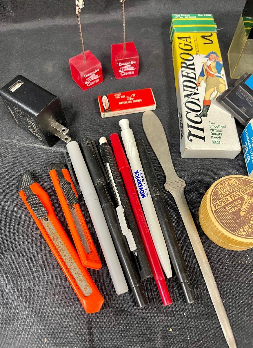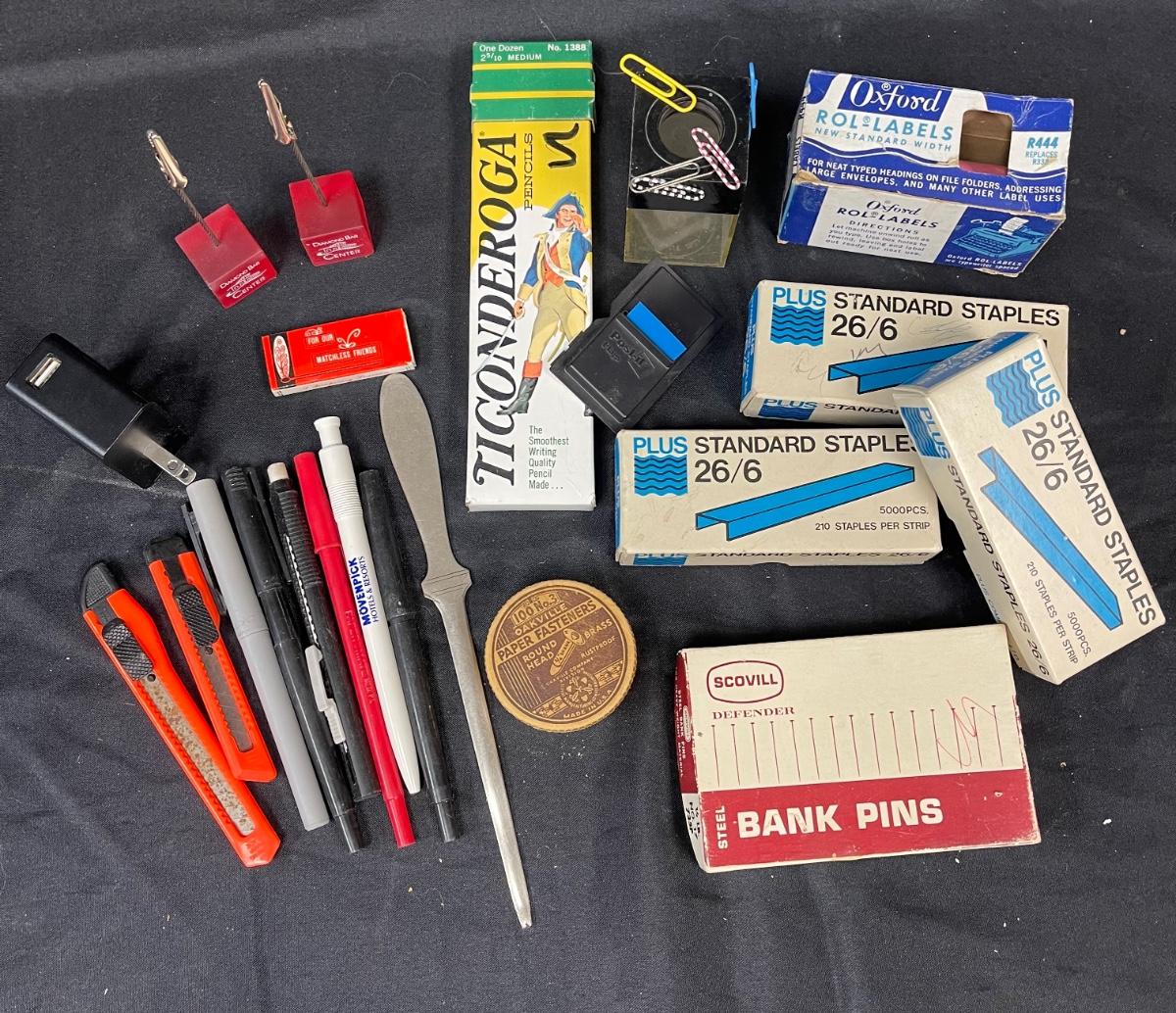 Lot of Miscellaneous Supplies Standard Staples, Pens, Box Cutters, Paper Fasteners & More