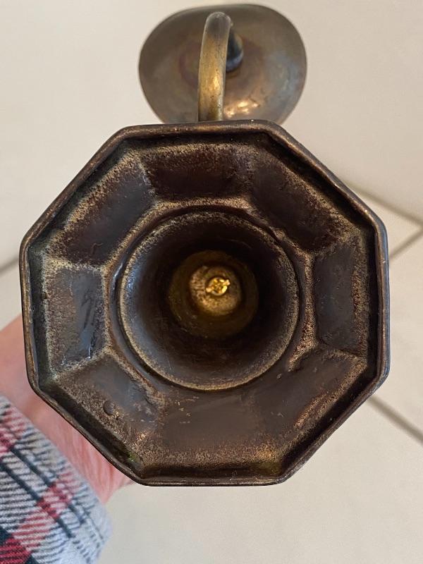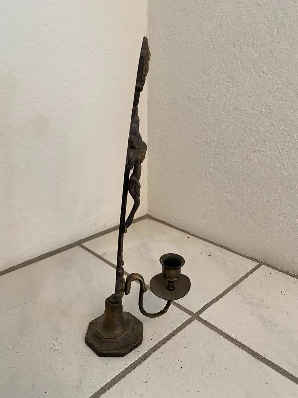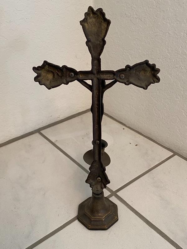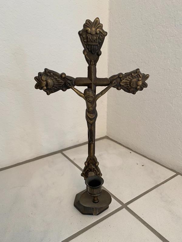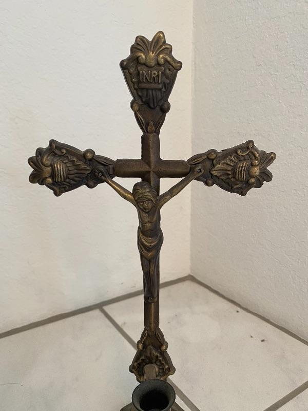 Brass crucifix candle holder. Has a screw in bottom that needs to be tightened. Good condition. About 12"