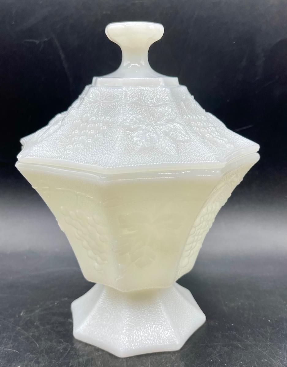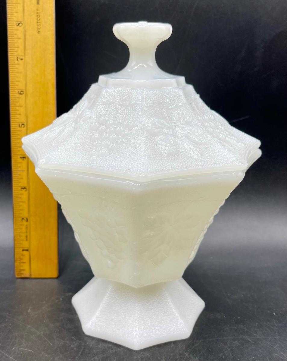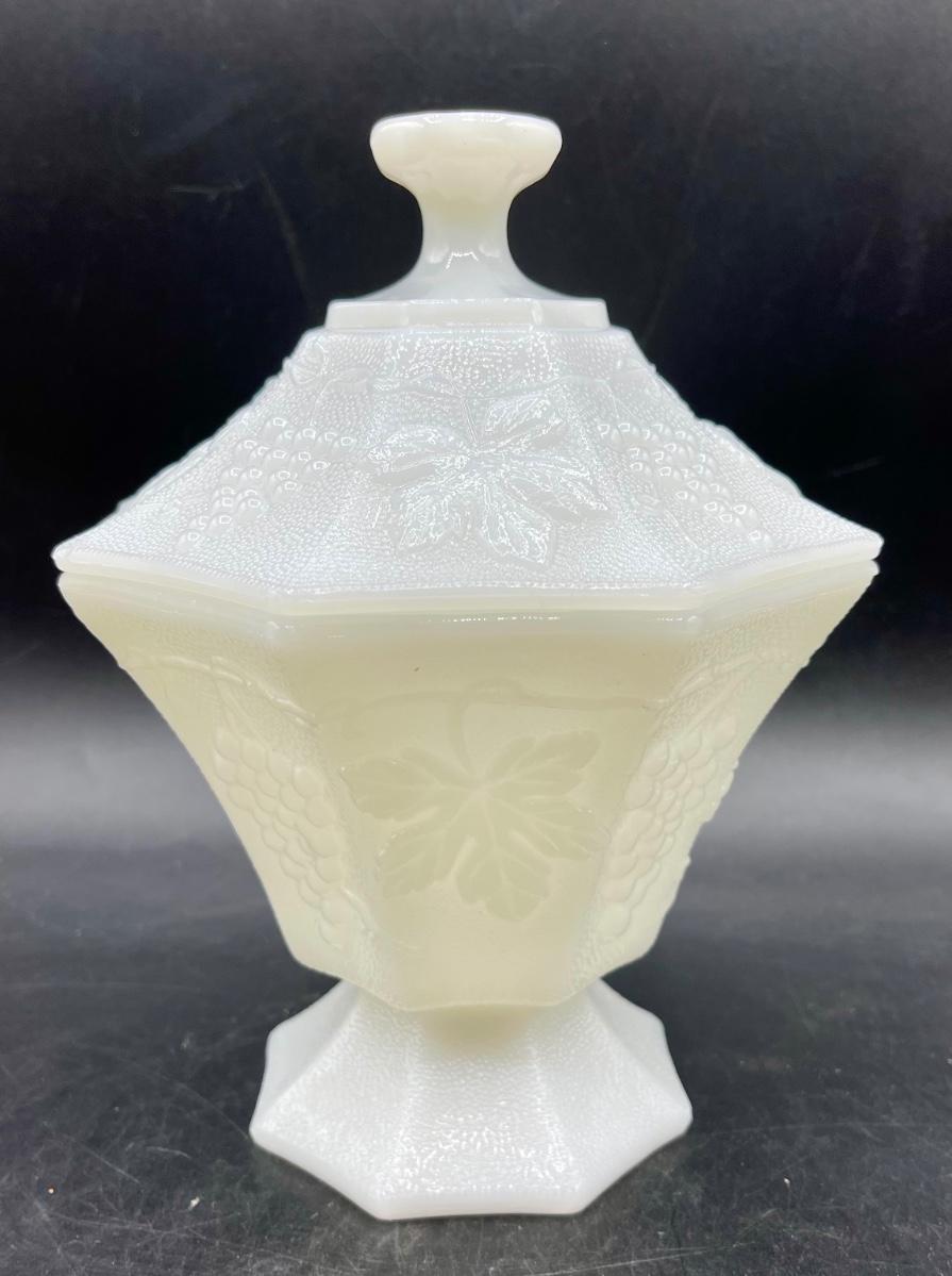 Anchor Hocking Milk Glass Pedestal Cand Dish lidded Grapes Vines