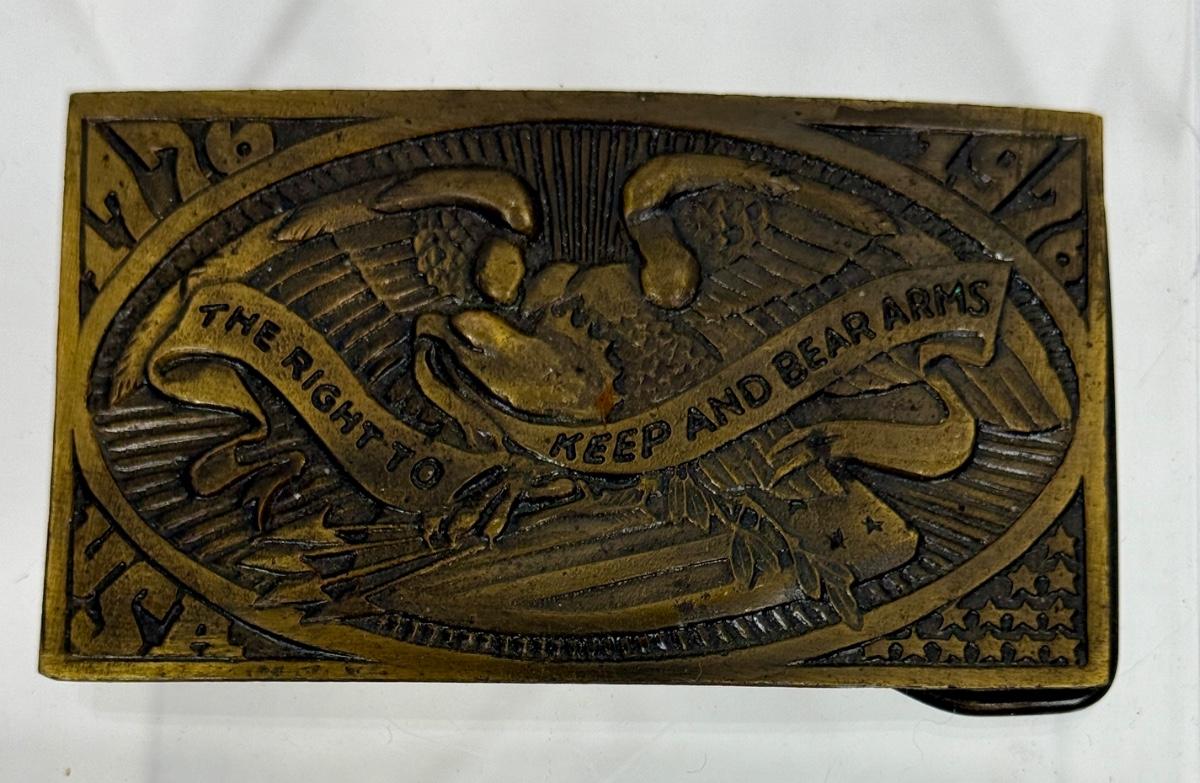 Vintage Brass Belt Buckle 1976 eagle with ribbon **The Right to Keep and Bear Arms"