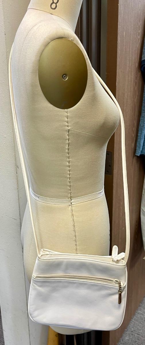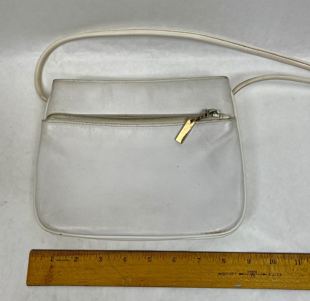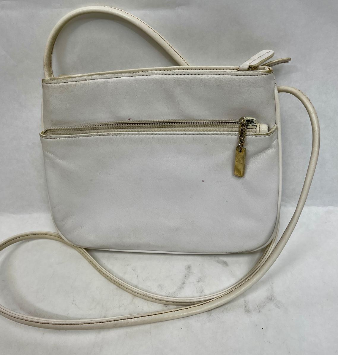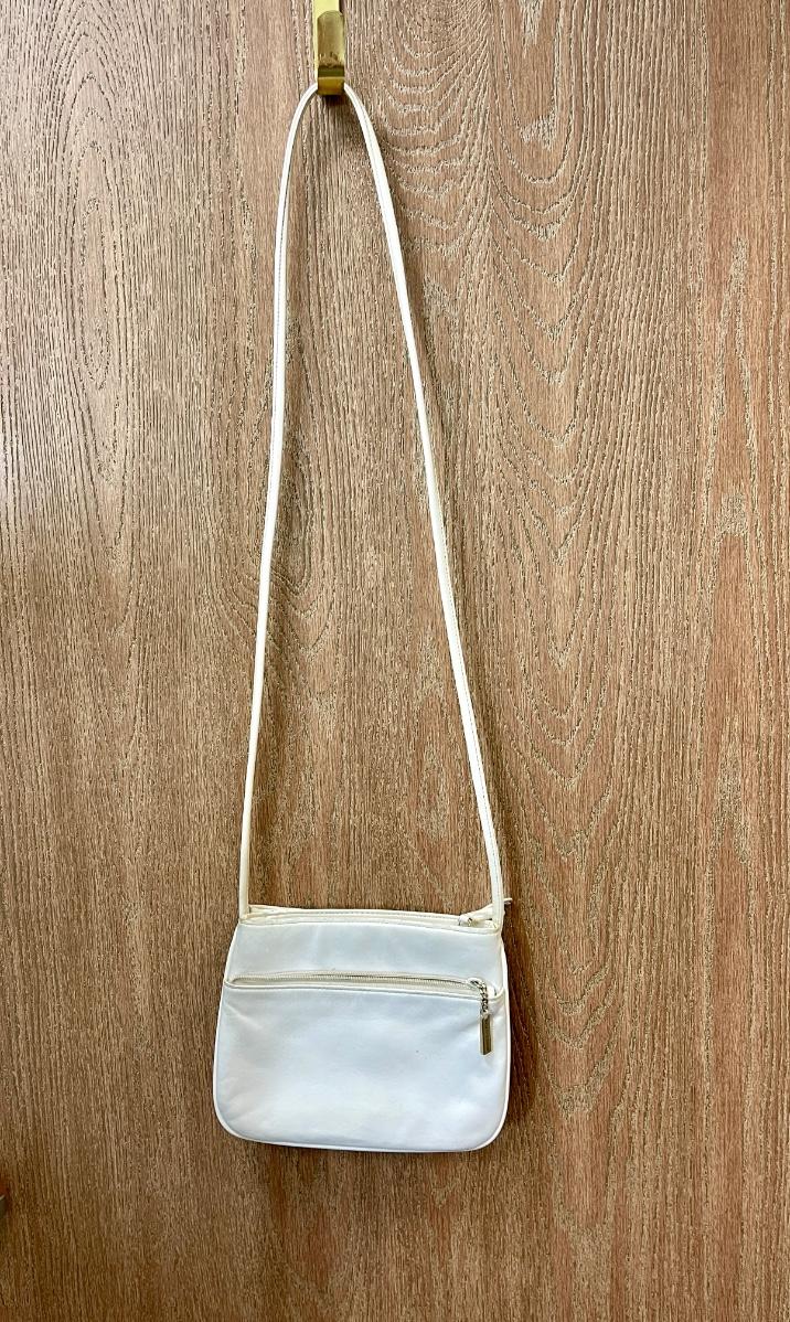 Leather-like material. Long shoulder strap. Red nail polish stain inside. Otherwise good condition.