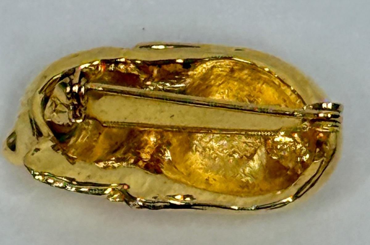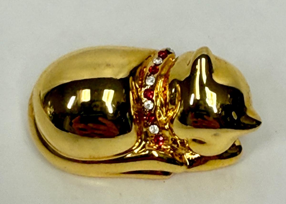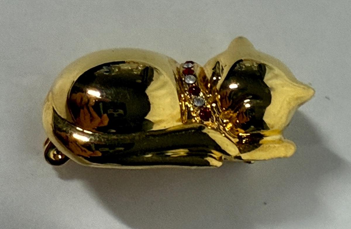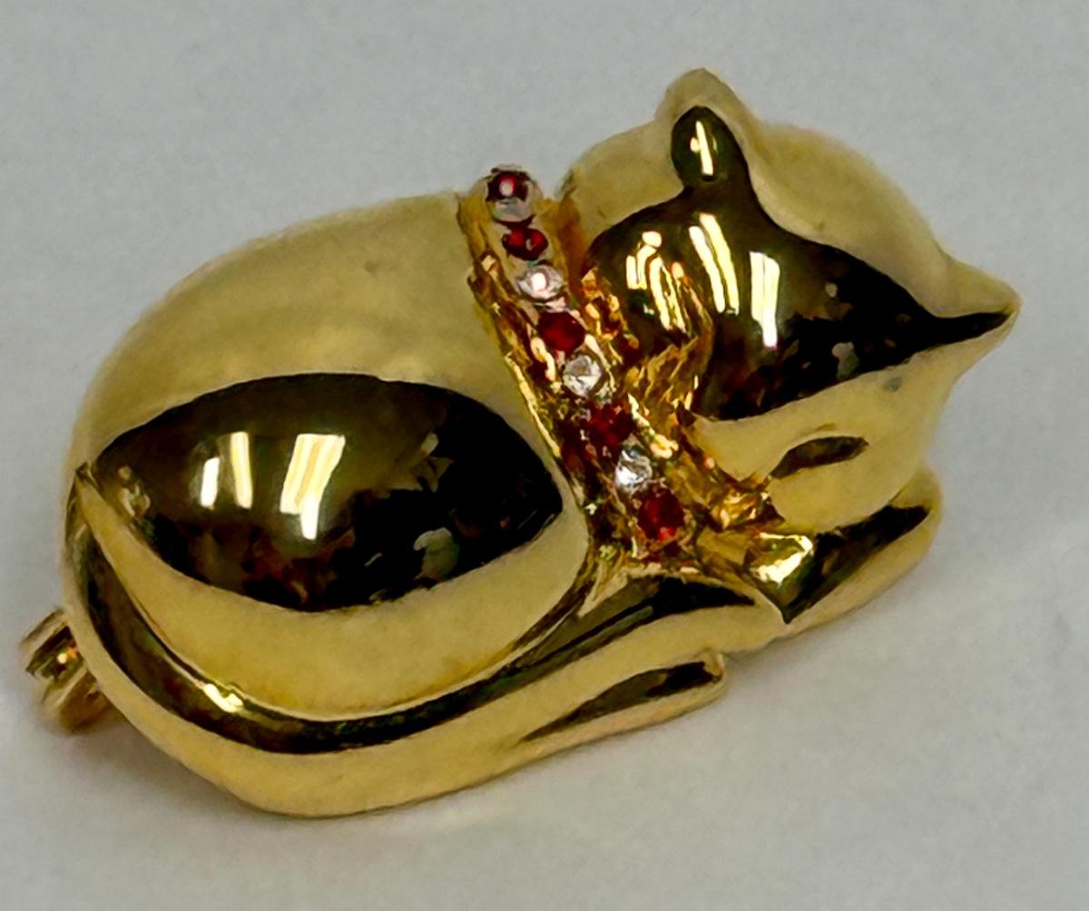 Costume Jewelry Gold Sleeping Curled Up Kitty Cat with red & clear Rhinestone collar