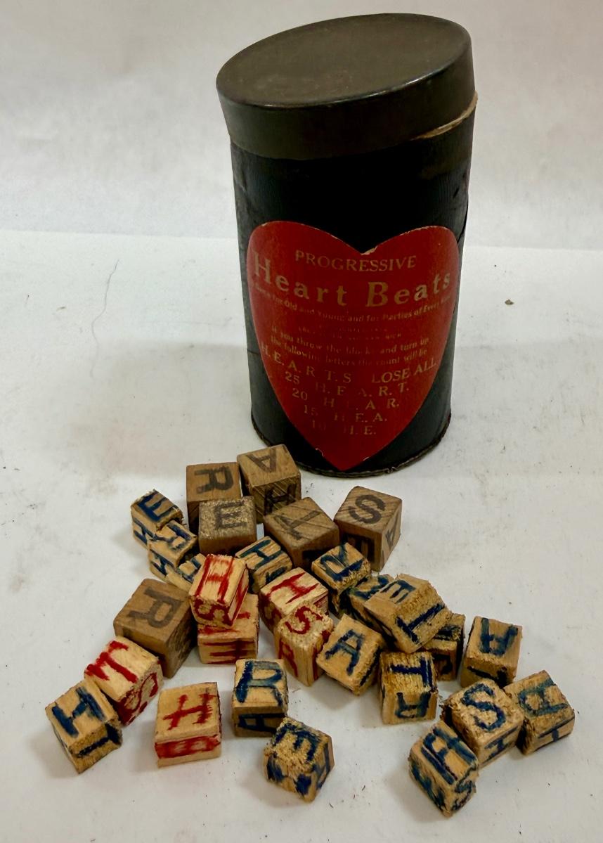 HEART BEATS antique game wooden spelling blocks in can 1916 LOCTAALDEN Saginaw Michigan