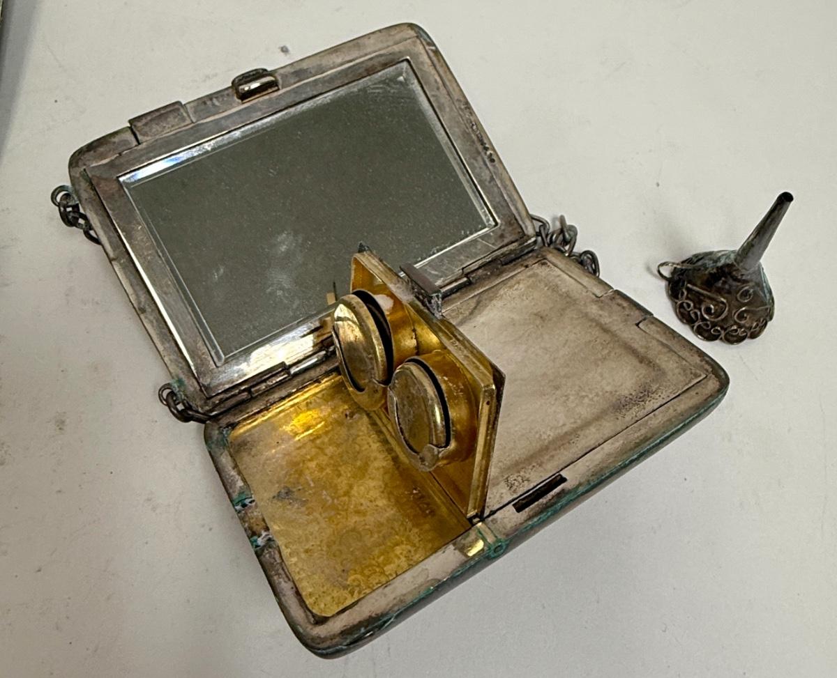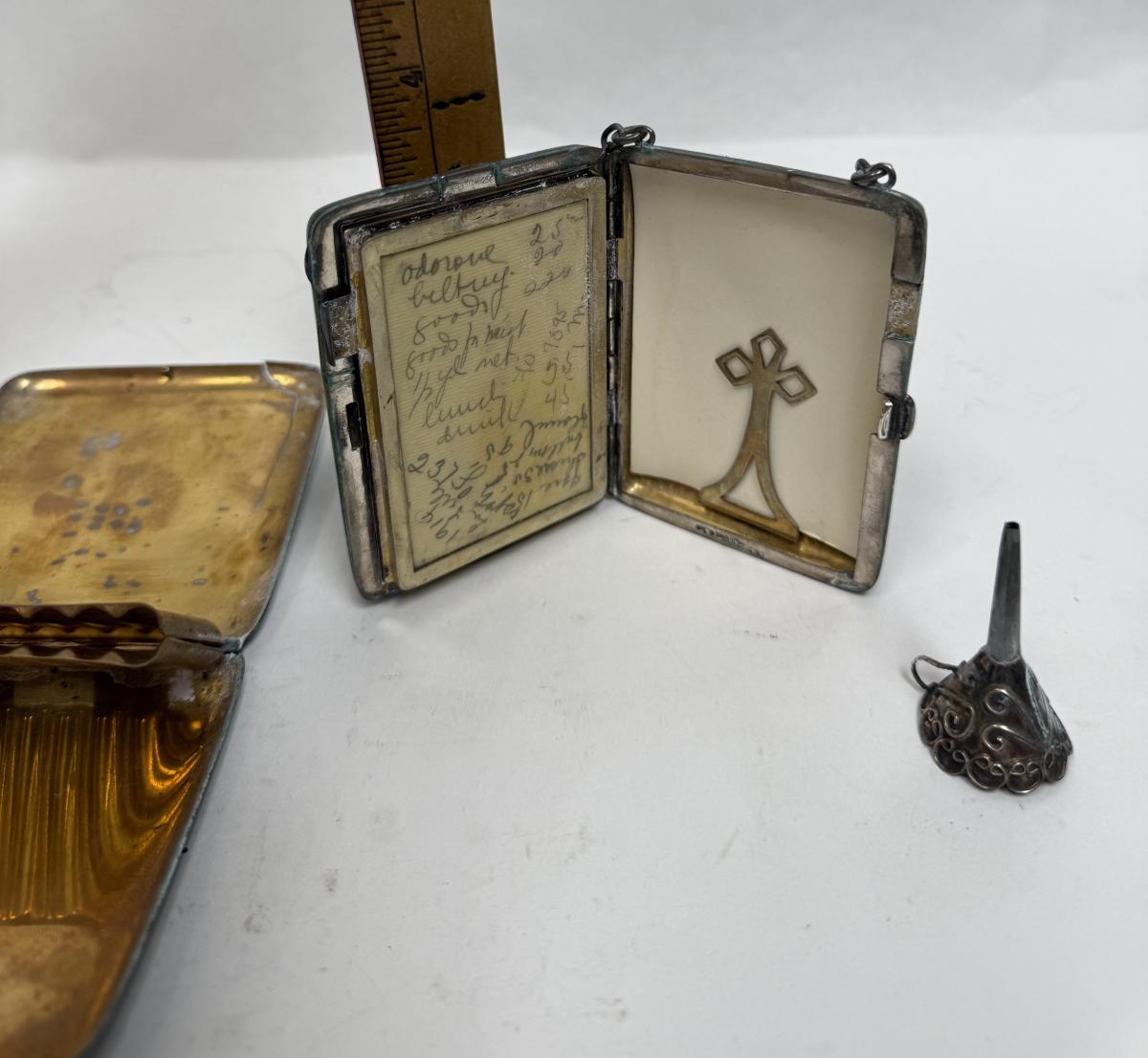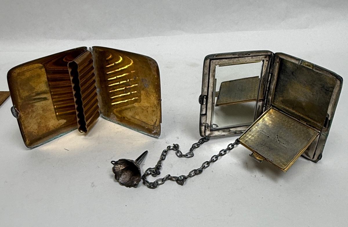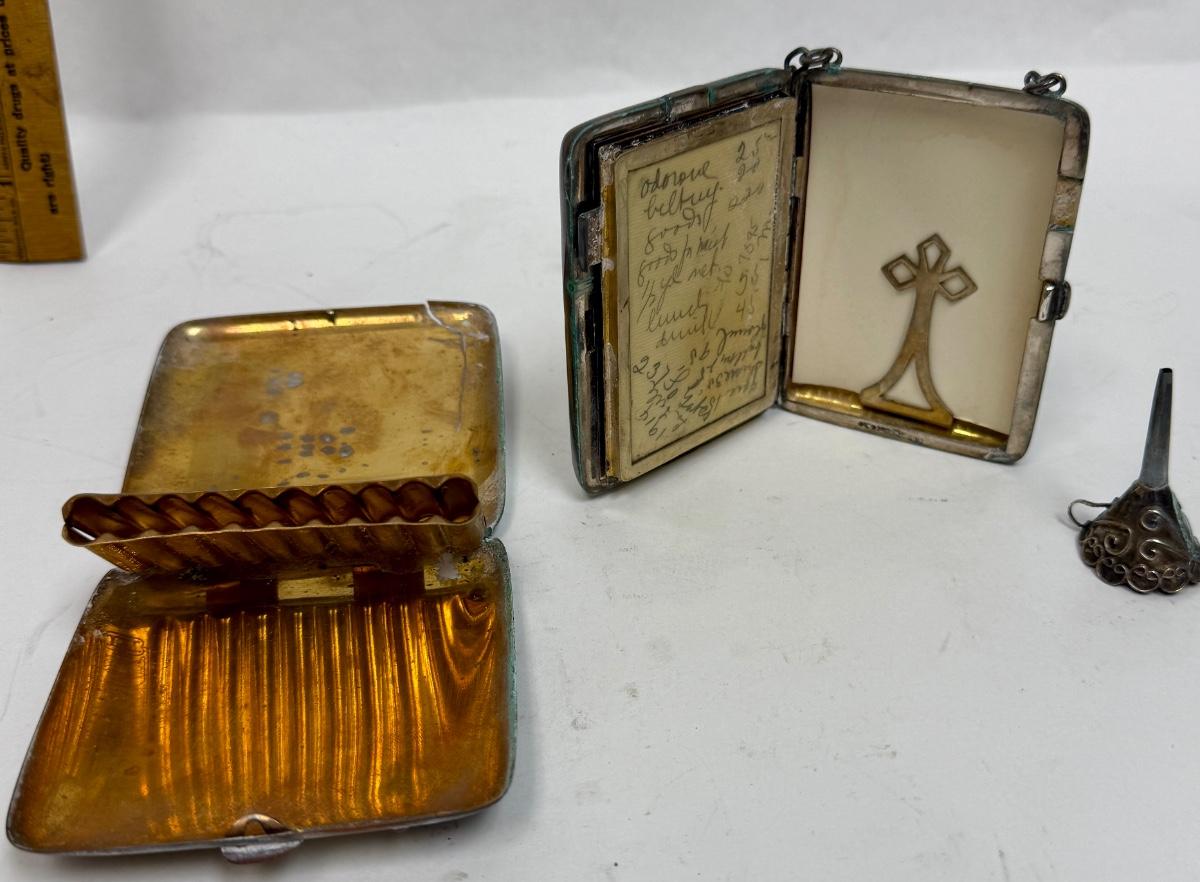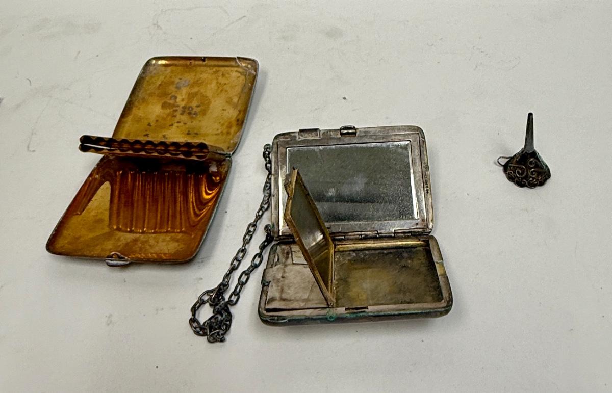 3 piece silver plate lot - tiny funnel, cigarette case, hidden panel purse