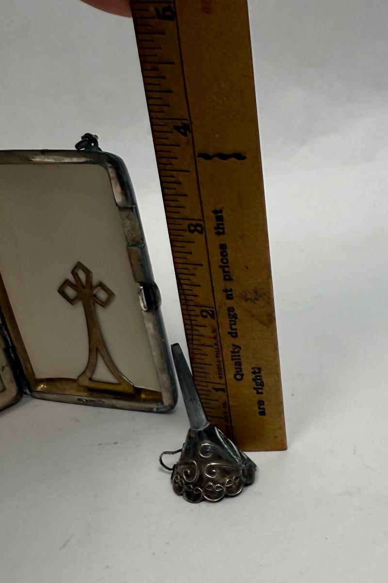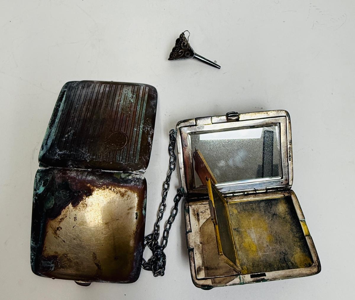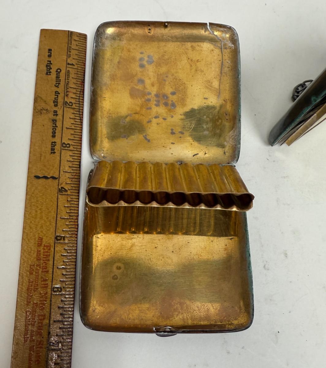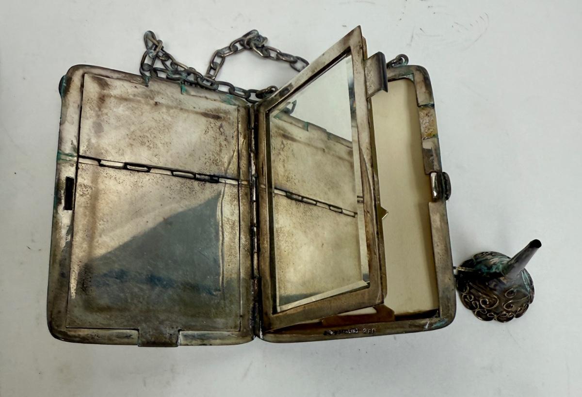 3 piece silver plate lot - tiny funnel, cigarette case, hidden panel purse