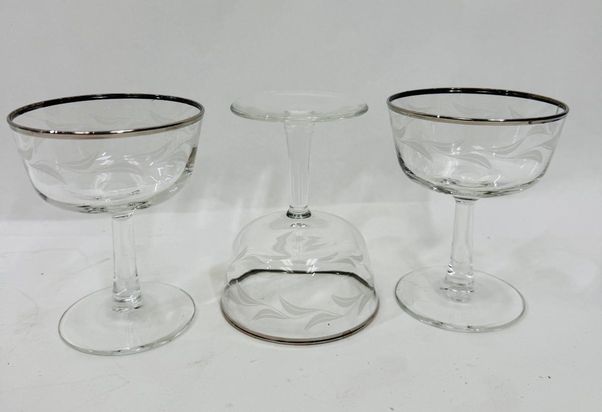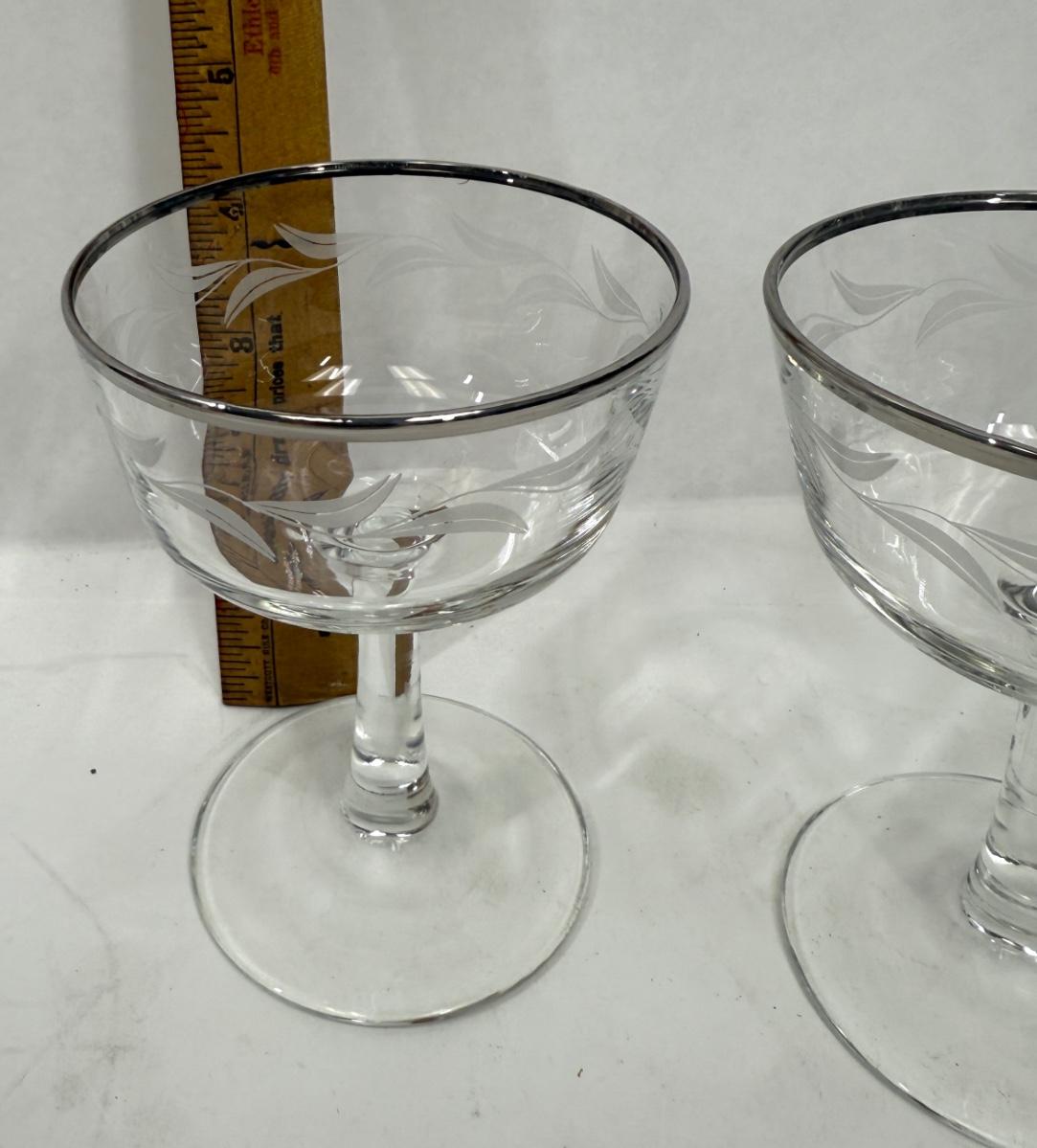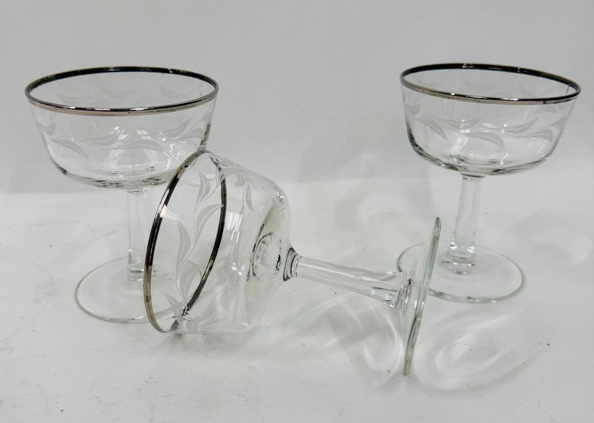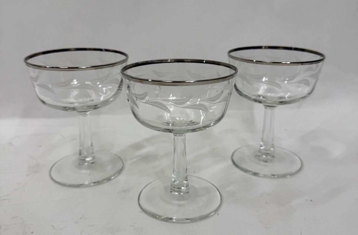 Set of 3, frosted etched leaves around the body of the glass. Good condition, approx. 4.5” tall