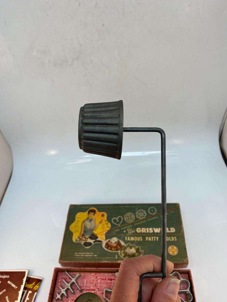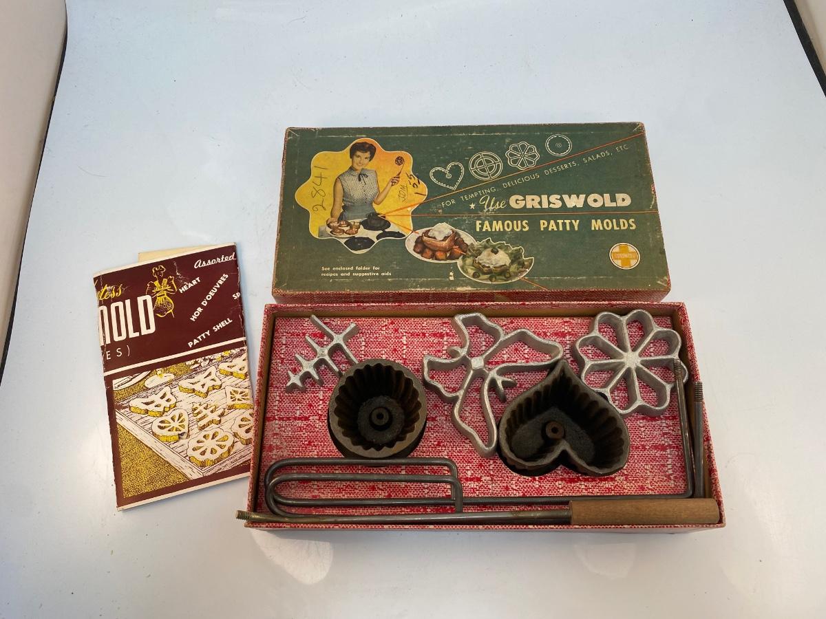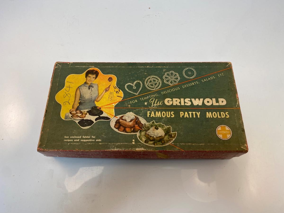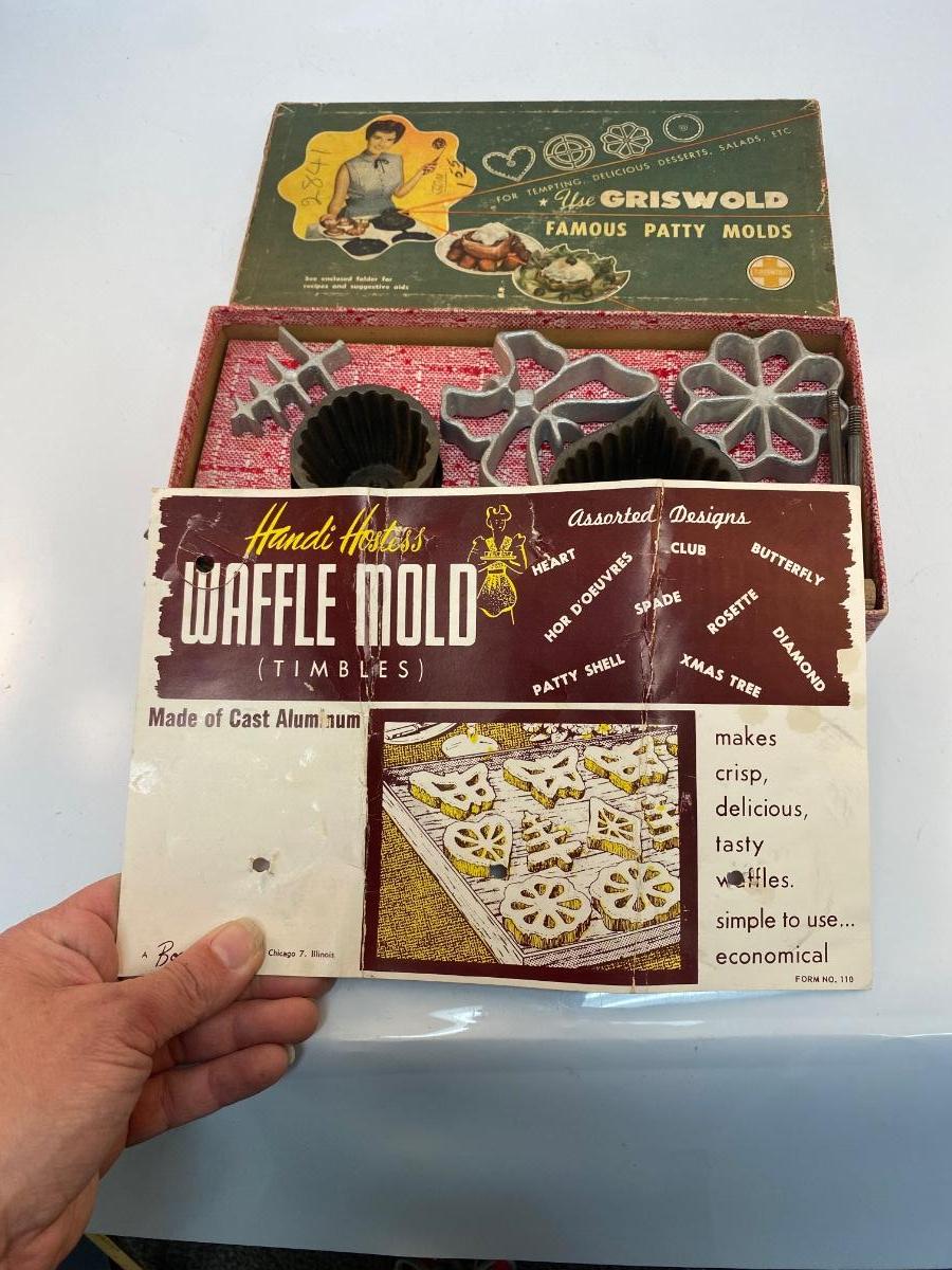 Vintage Griswold Famous Patty Molds & Waffle Mold Sets. Two different sets in one box. The patty mold set does not have instructions.