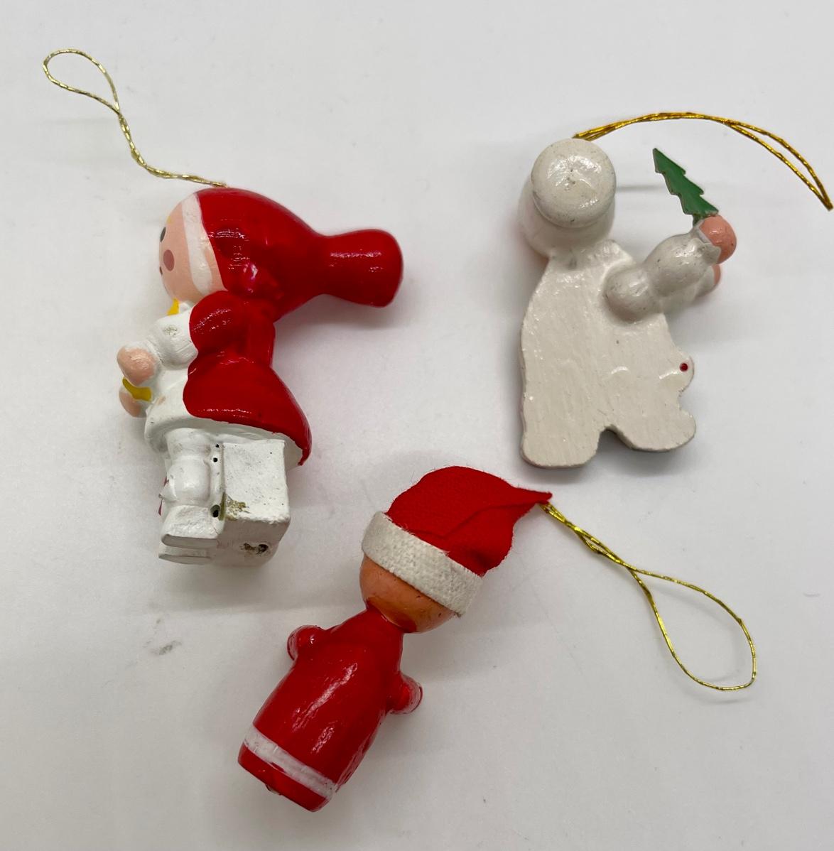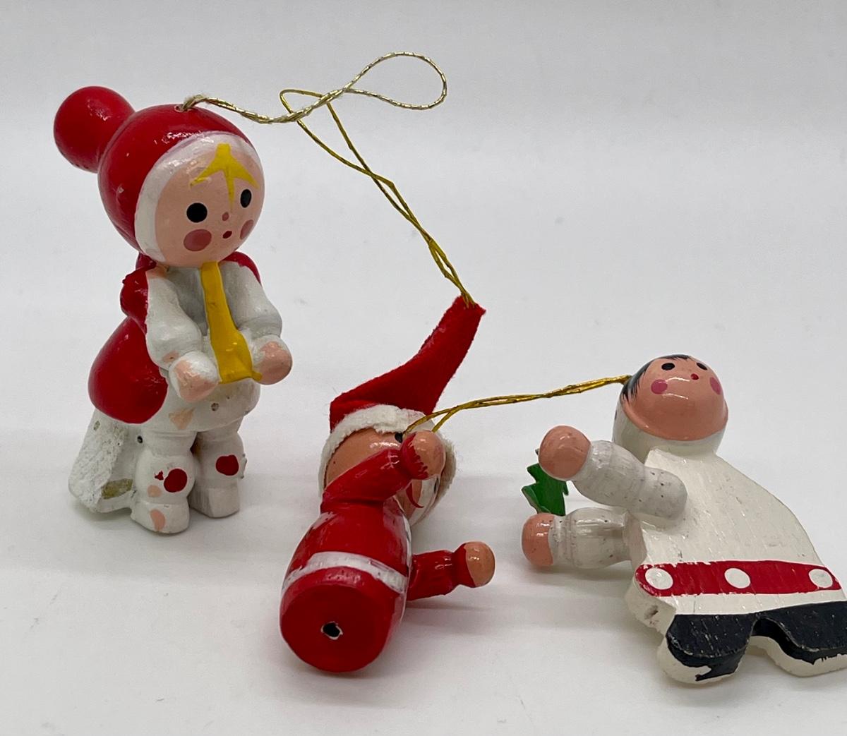 Set of Three Vintage Tiny Hand Painted Wood Christmas Holiday Ornaments. In good vintage condition.