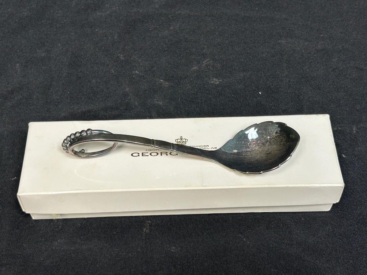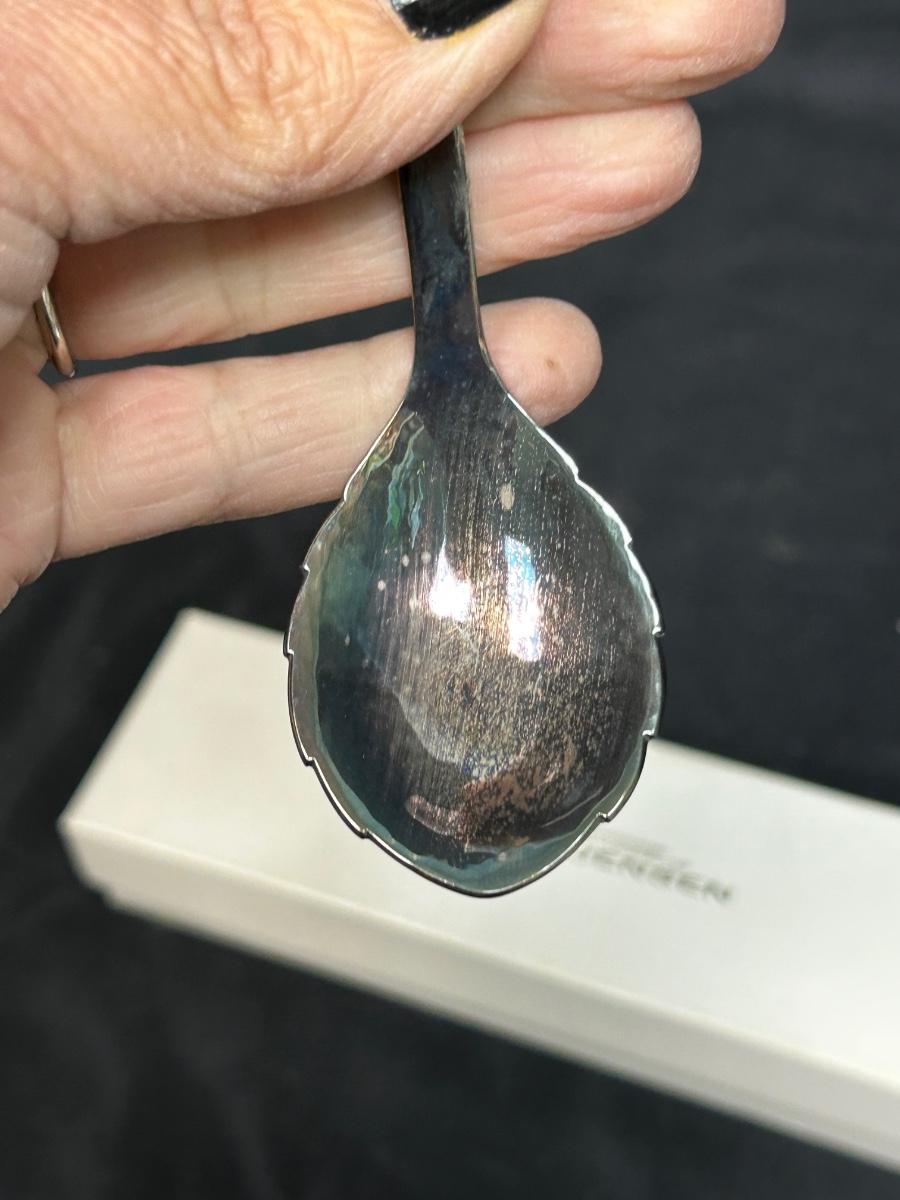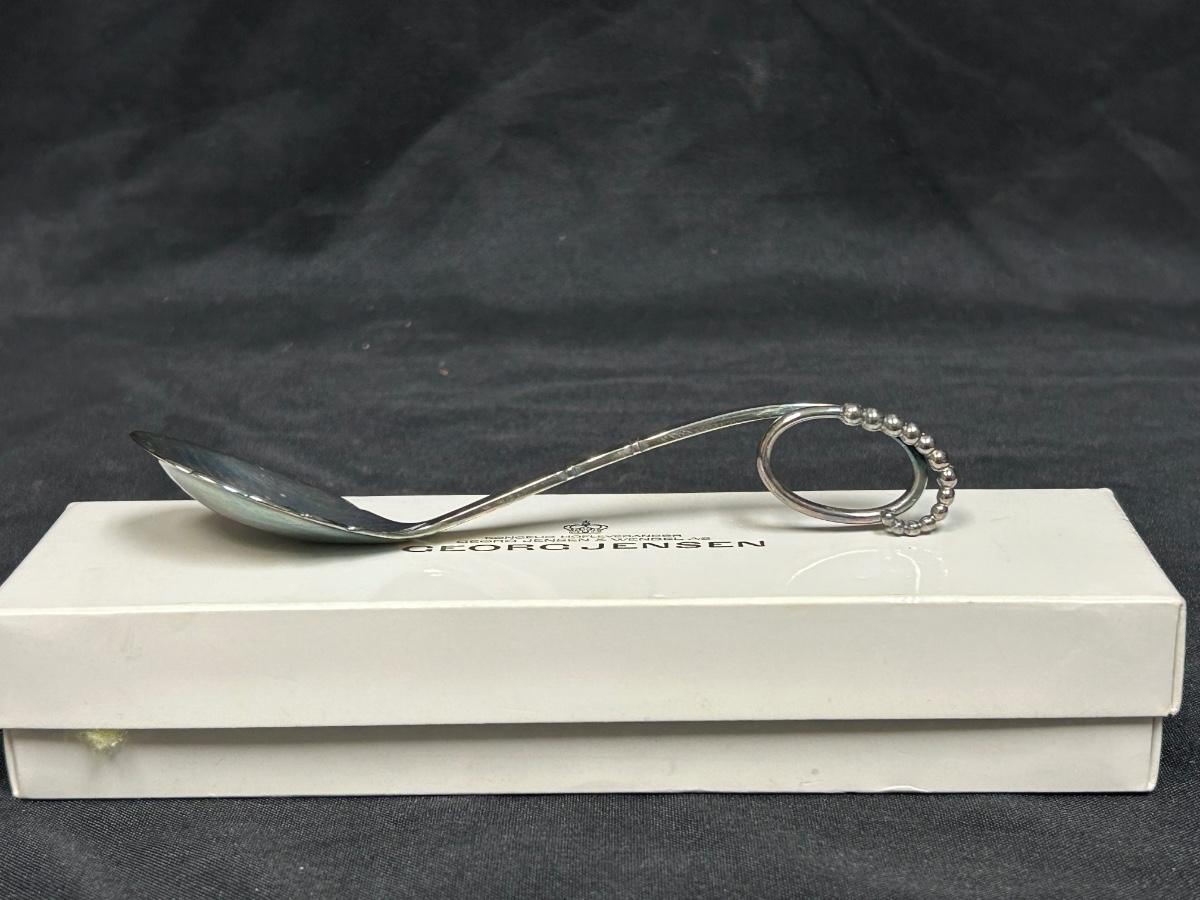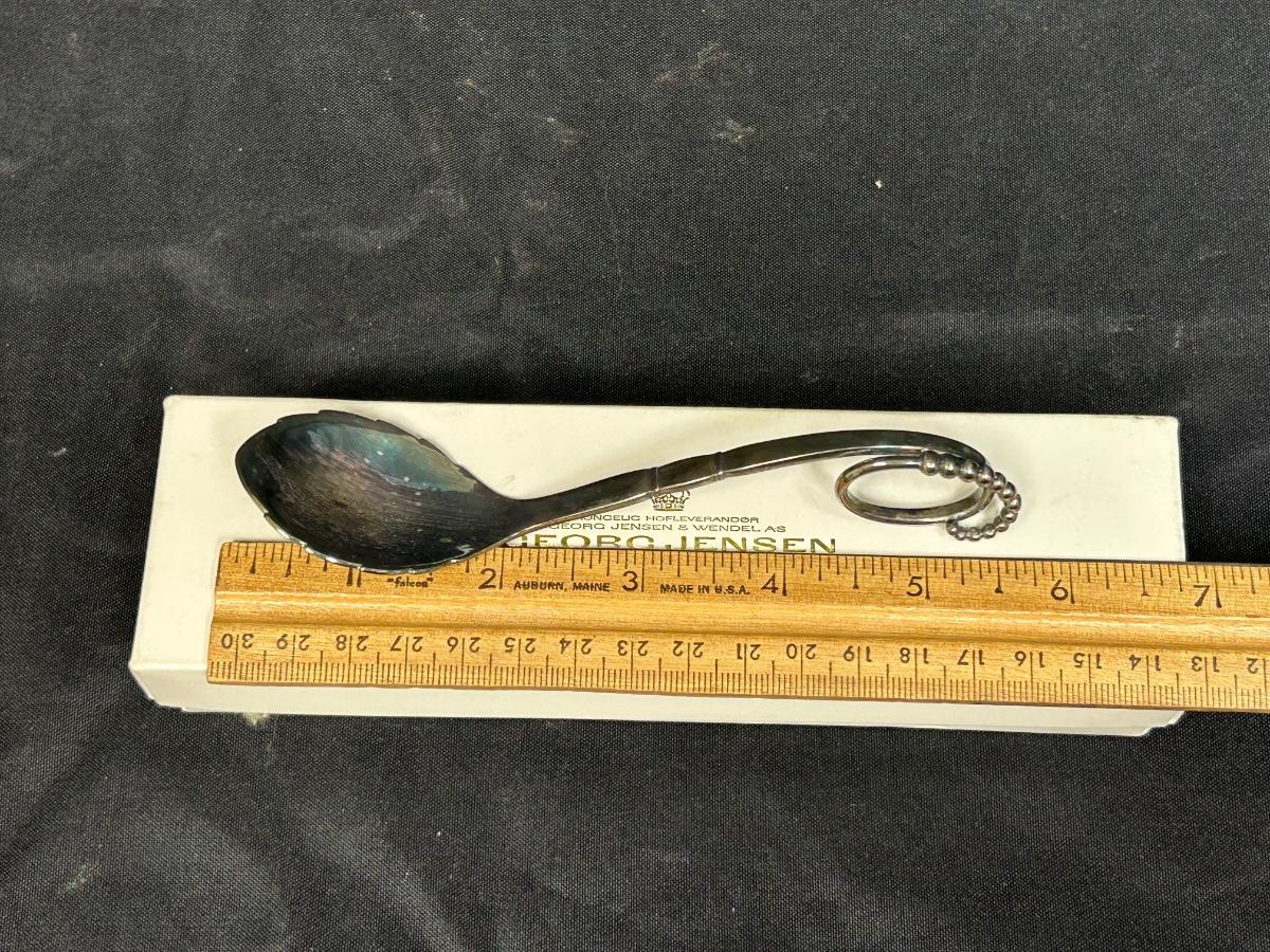 Sterling Silver Leaf Edge Small Ladle Spoon for Sauce Relish Jam Jelly. Almost 6" size. Marked sterling on the back of spoon. Box says it is from Georg Jensen & Wendel. and is considered a pea pod spoon.