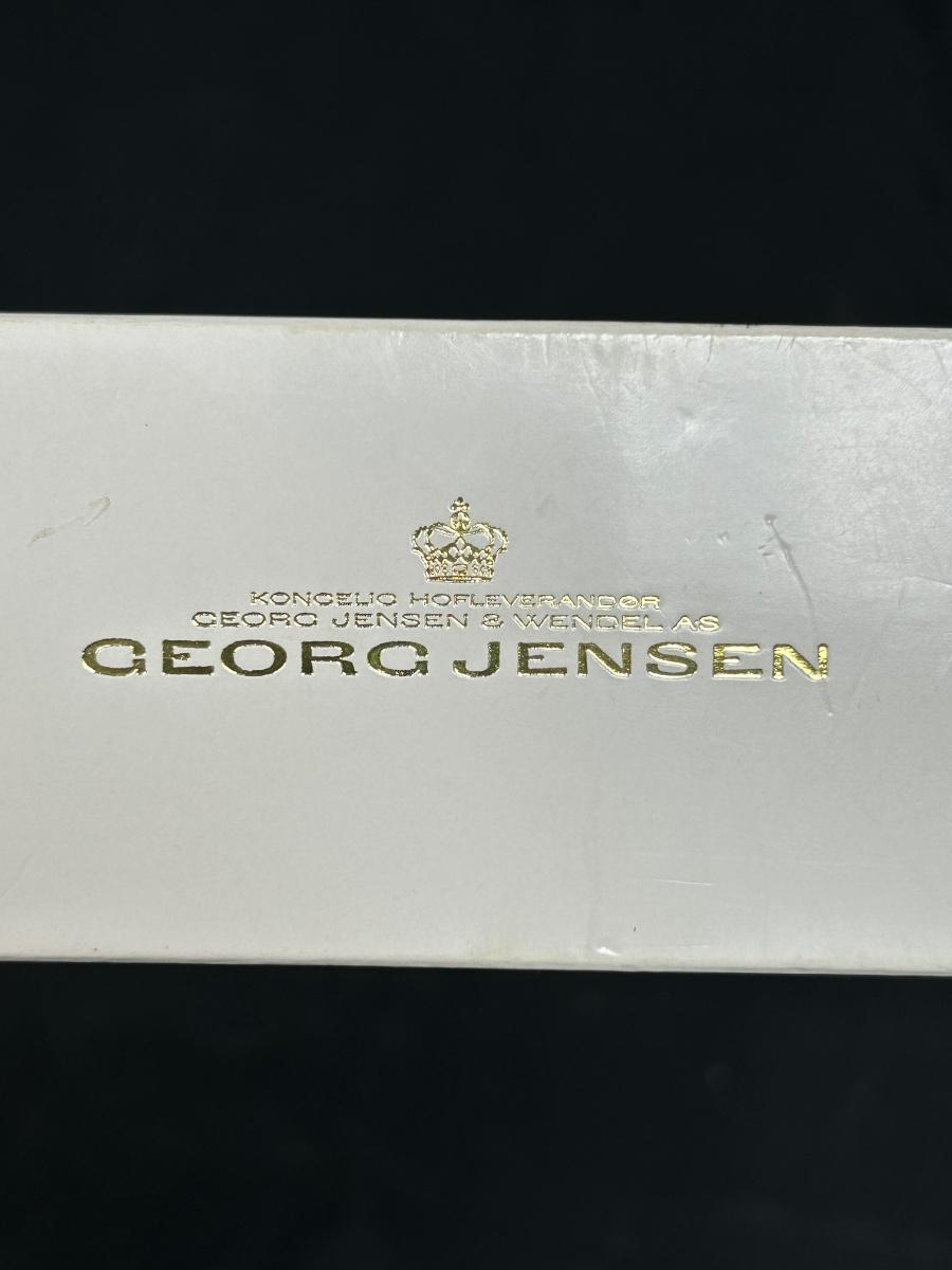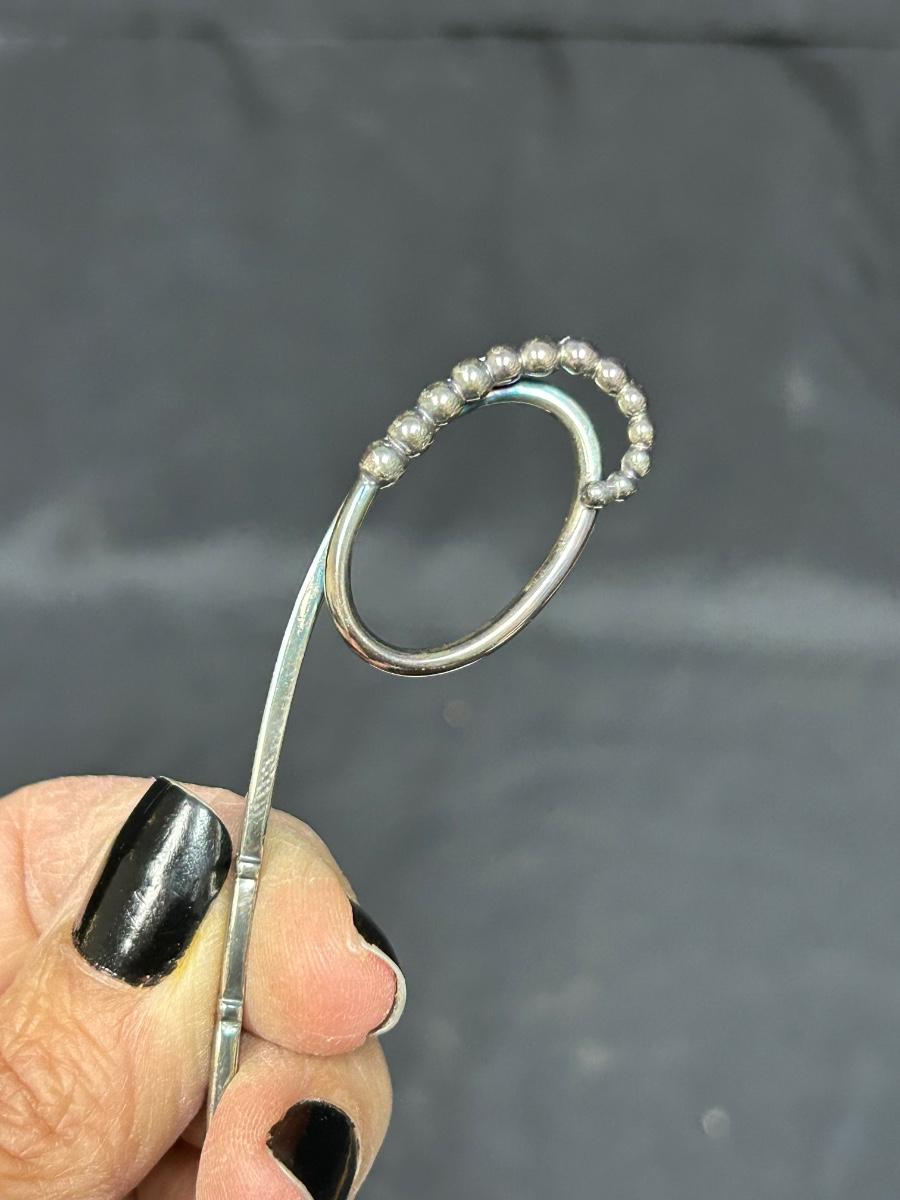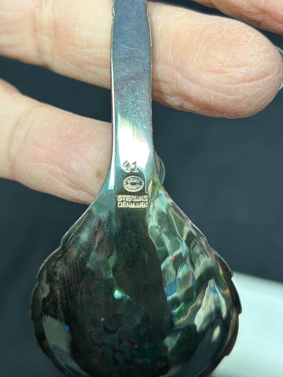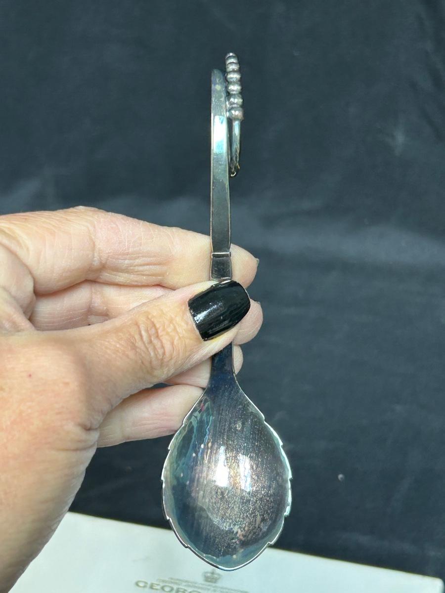 Sterling Silver Leaf Edge Small Ladle Spoon for Sauce Relish Jam Jelly. Almost 6" size. Marked sterling on the back of spoon. Box says it is from Georg Jensen & Wendel. and is considered a pea pod spoon.