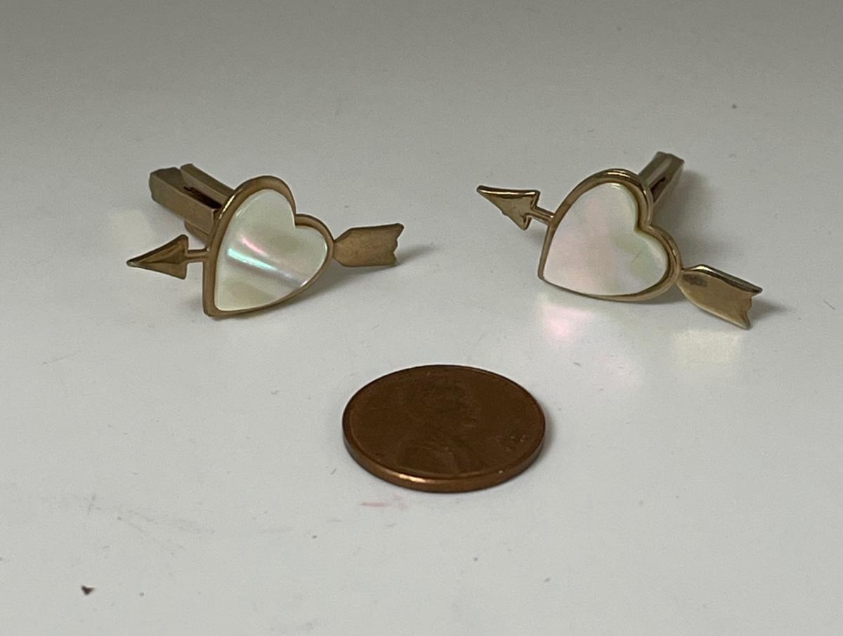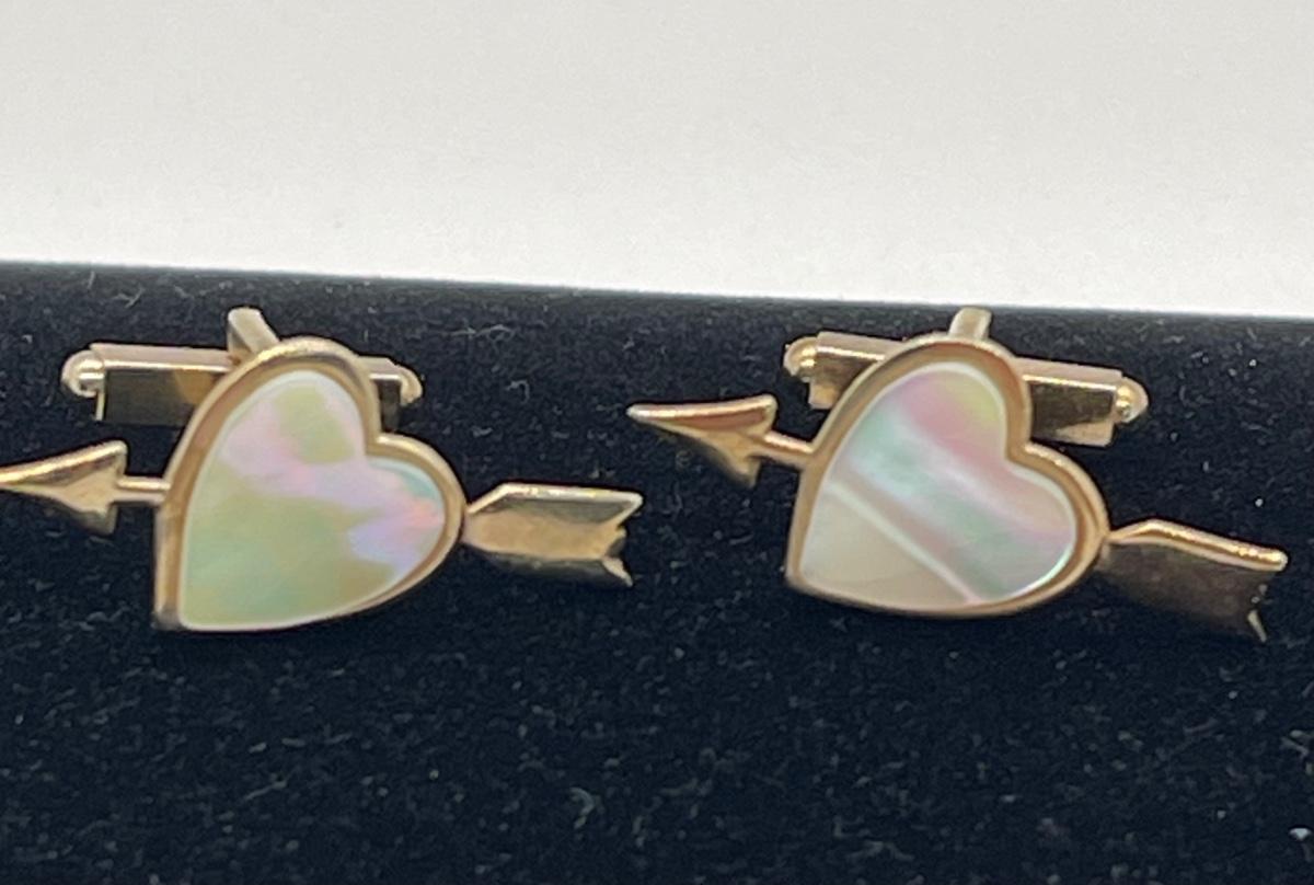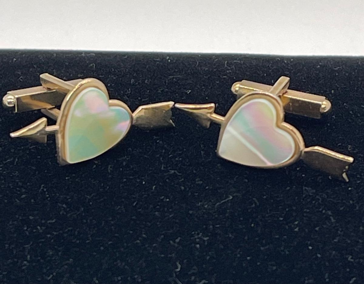 Heart with piercing arrow shaped cuff links with iridescint stones