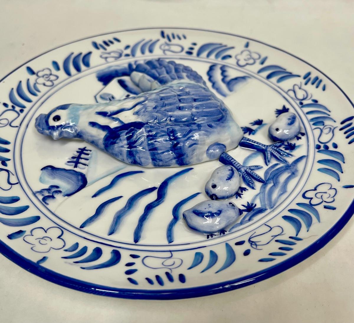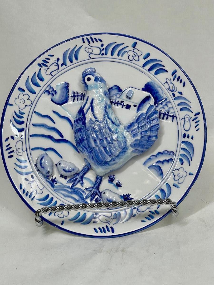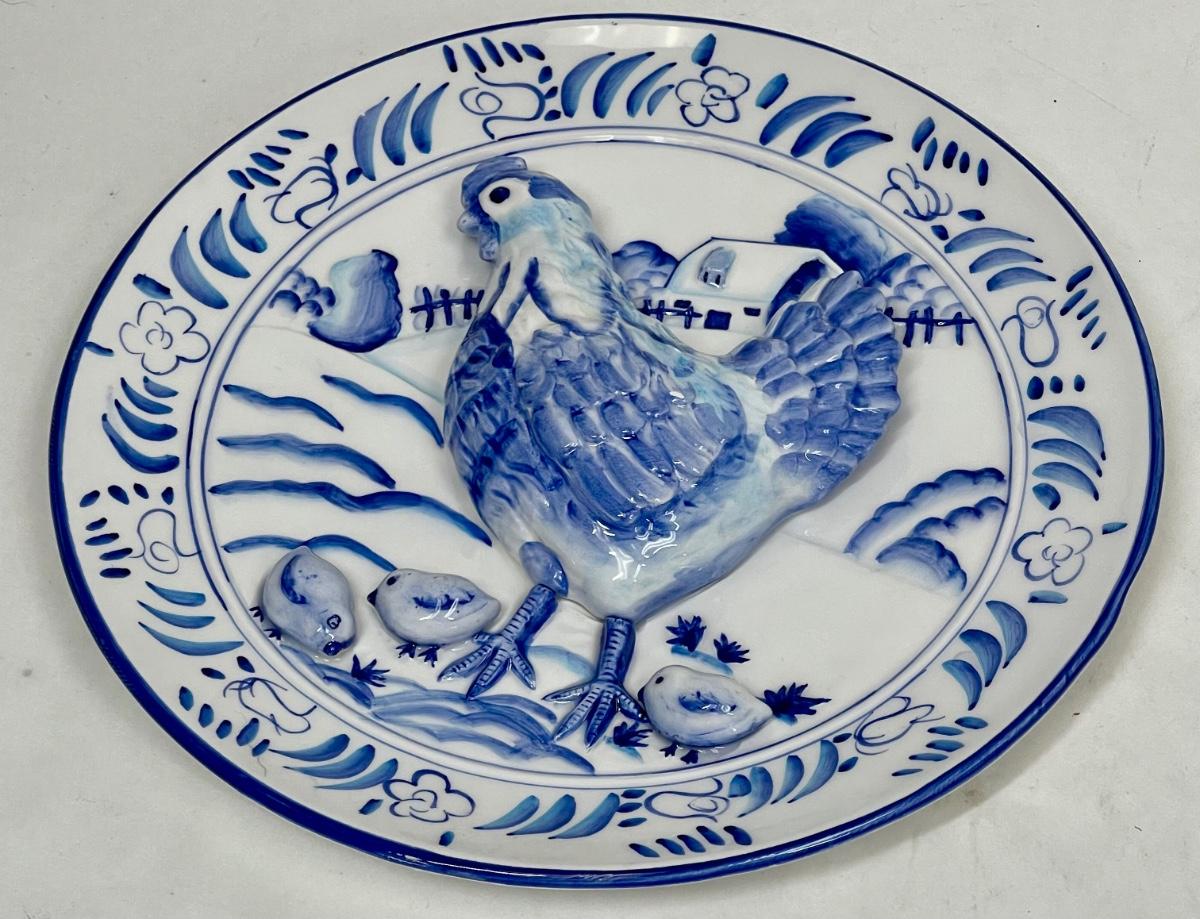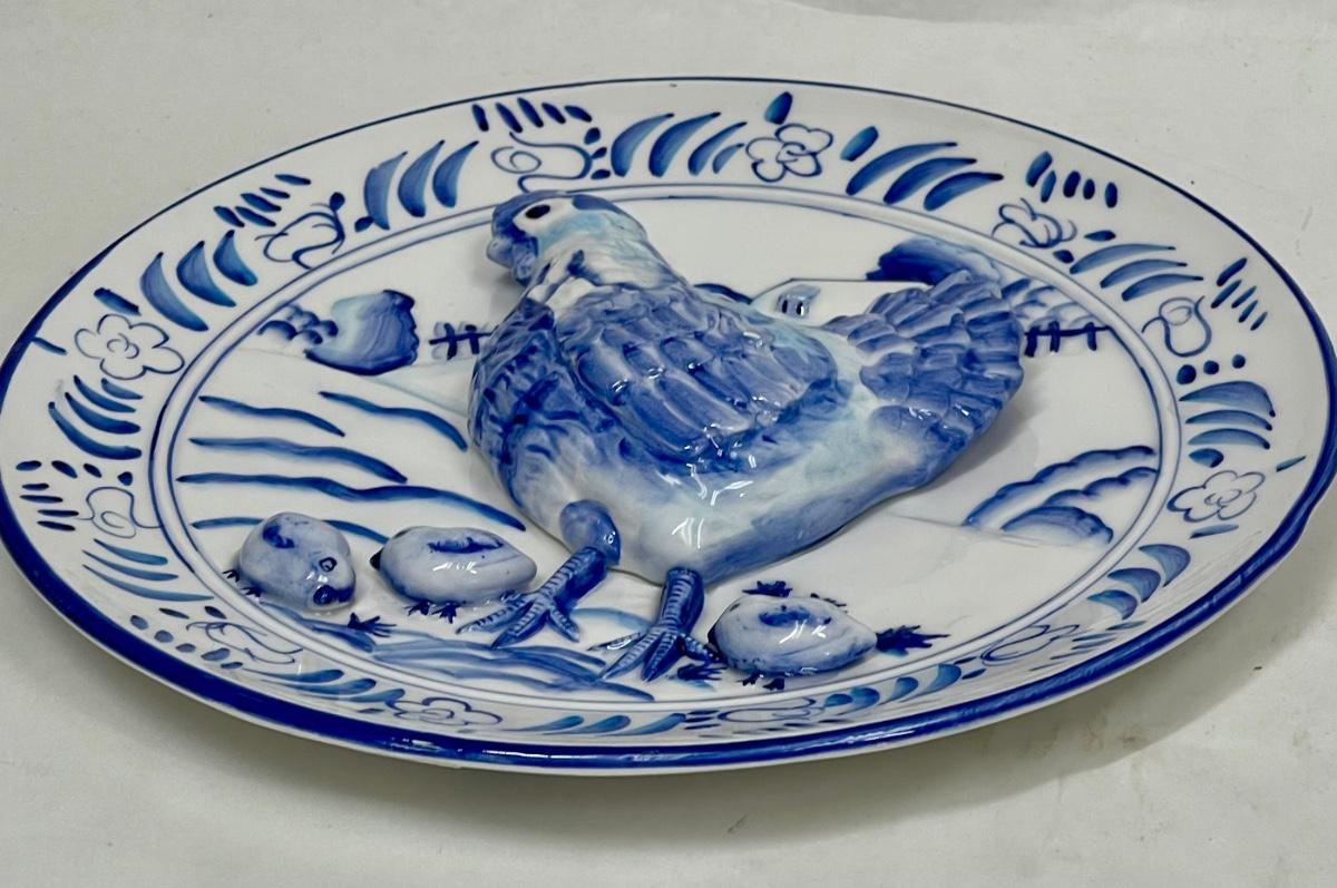 Blue & White Porcelain 3D Chicken Hen with baby chicks Wall Plate Pottery Farmhouse Decor Bella Casa by Ganz