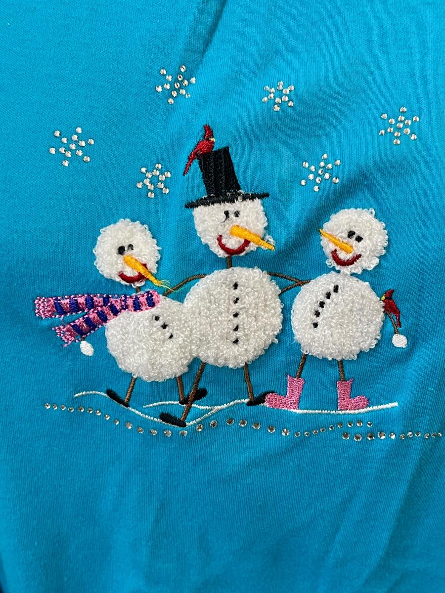 Cartoon images of 3 Snowmen on the front. By M&C Sportswear, 60/40 Cotton-polyester. Good condition.