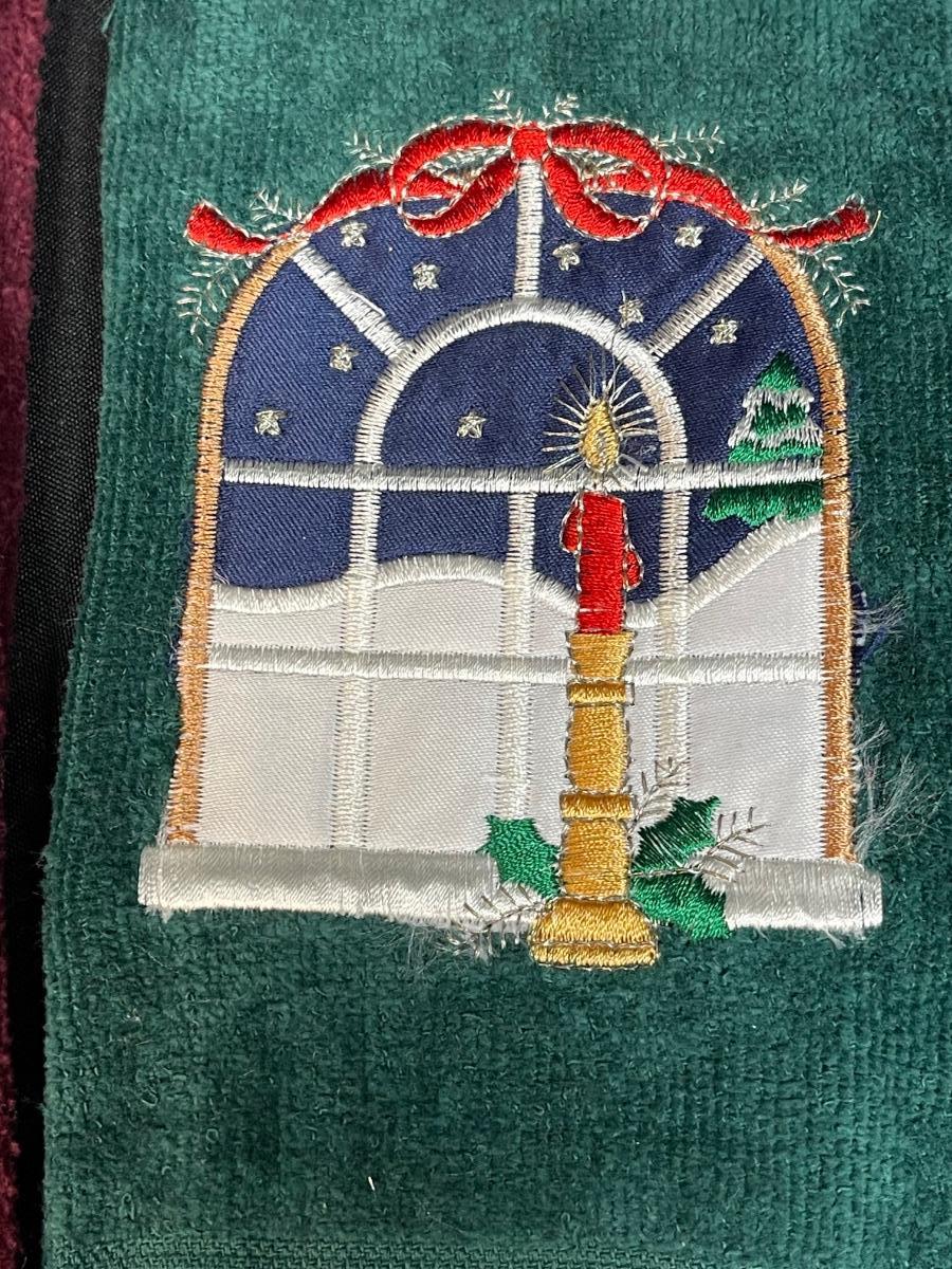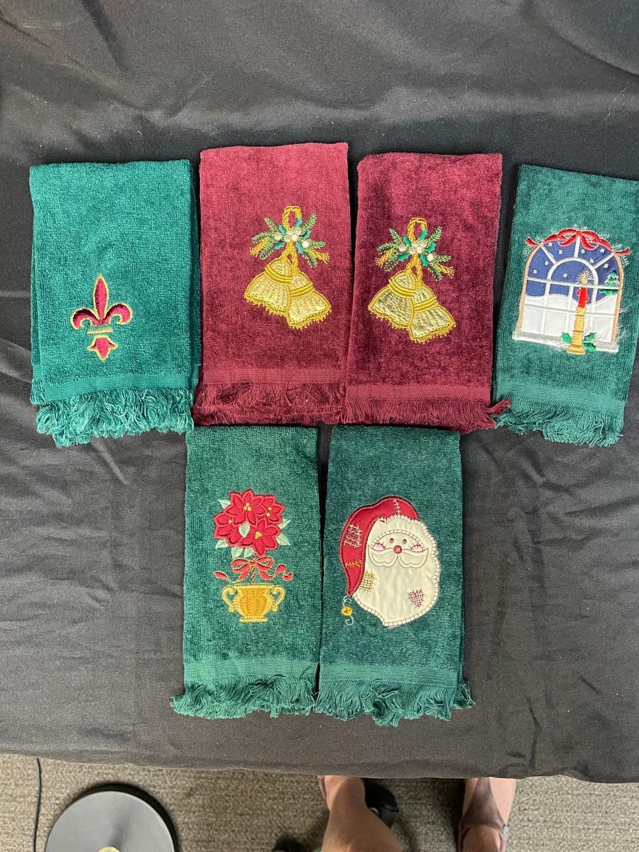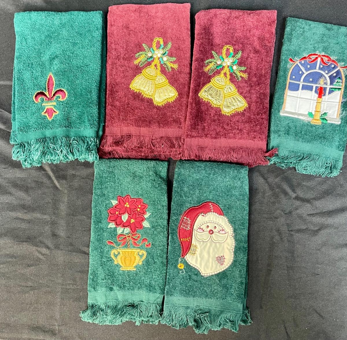 Set of 6 Red and Green Christmas Holiday Applique Fingertip Hand Towels. In good condition.