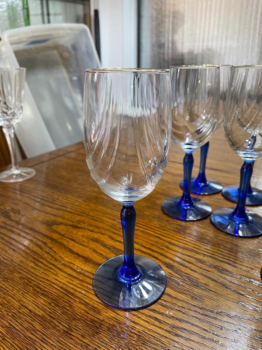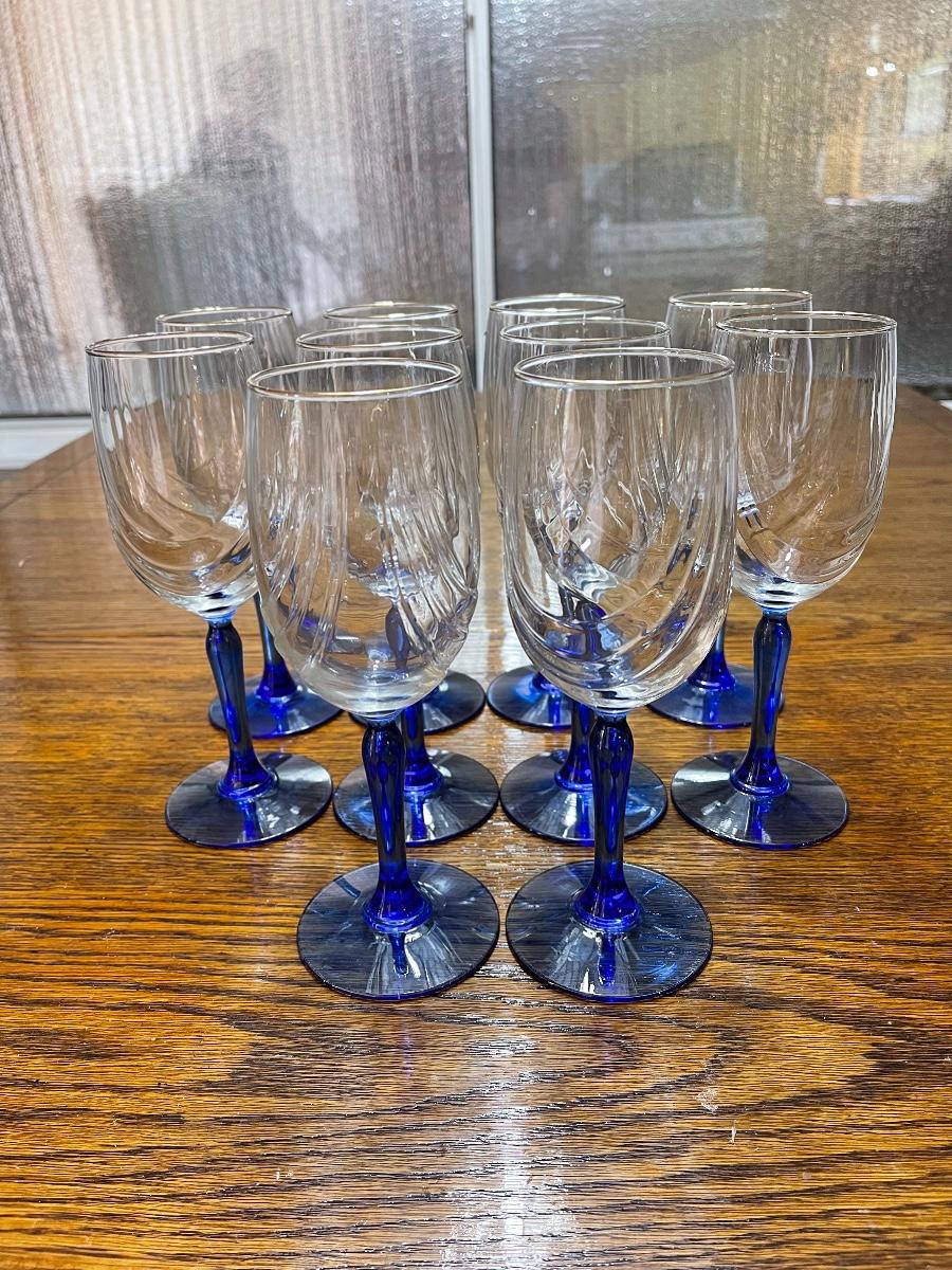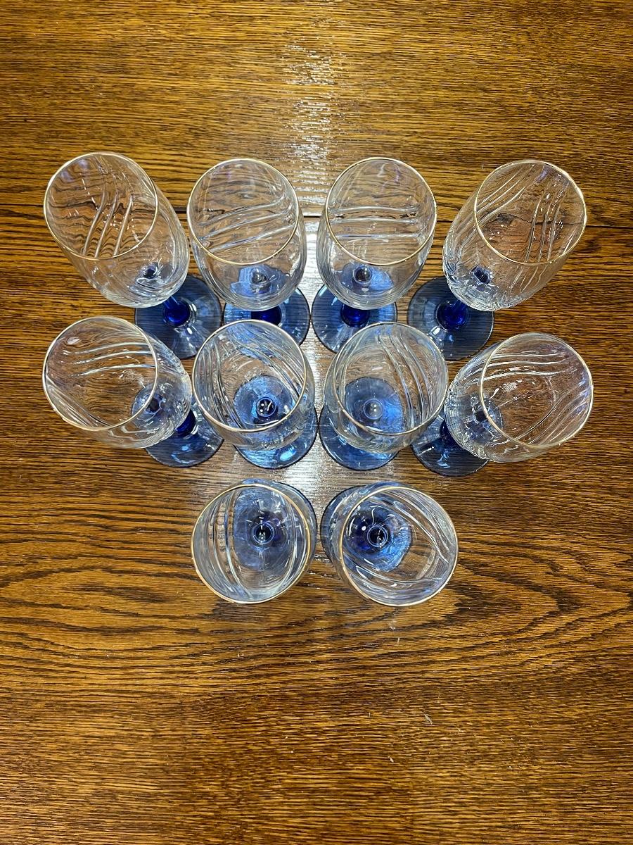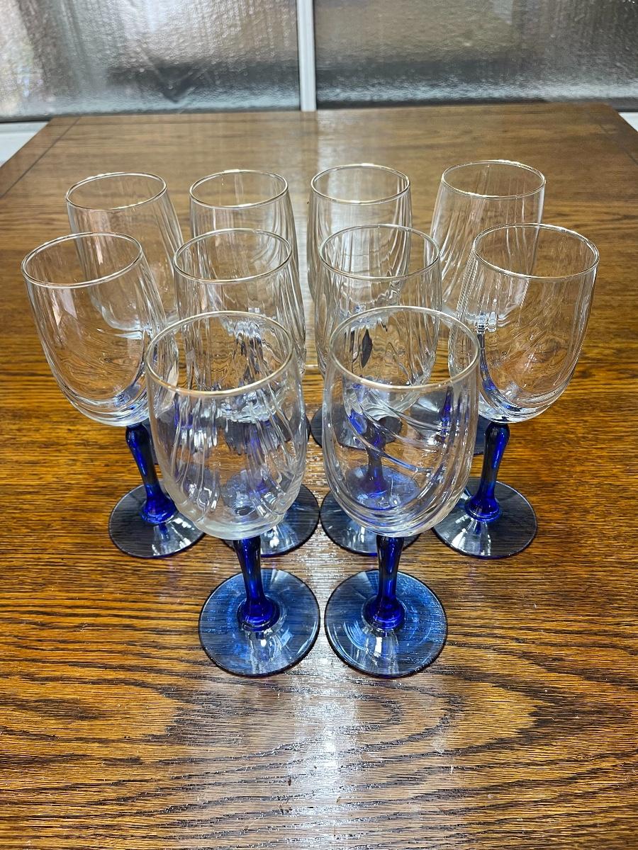 Set of 10 blue stem wine glasses. Good condition, no chips. LOCAL PICK UP ANGELUS OAKS.