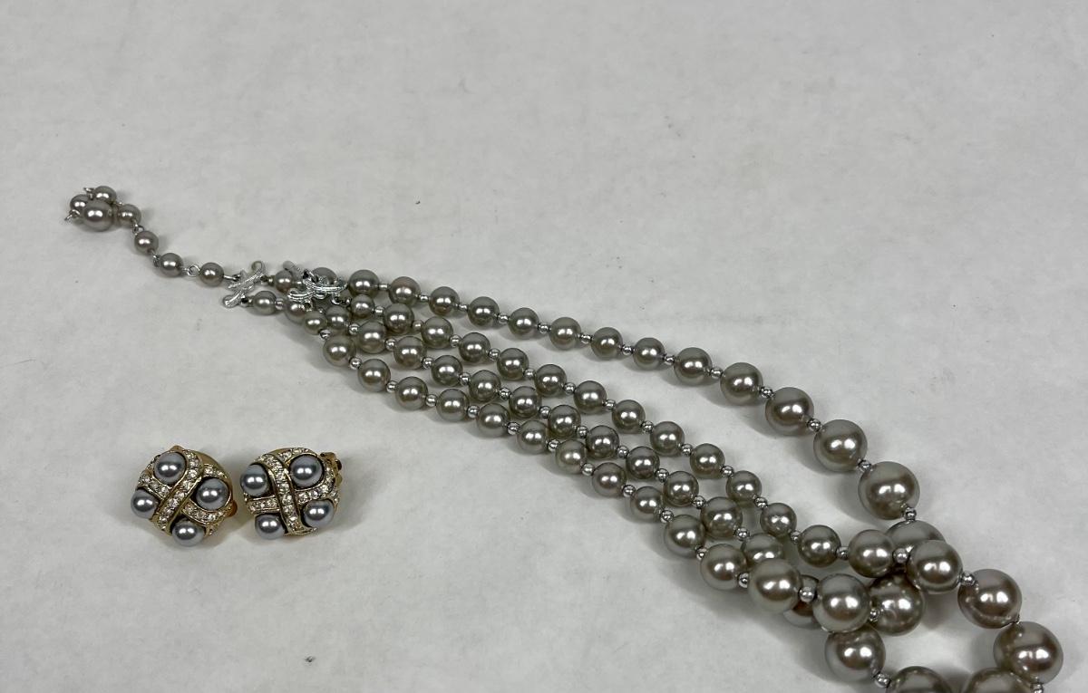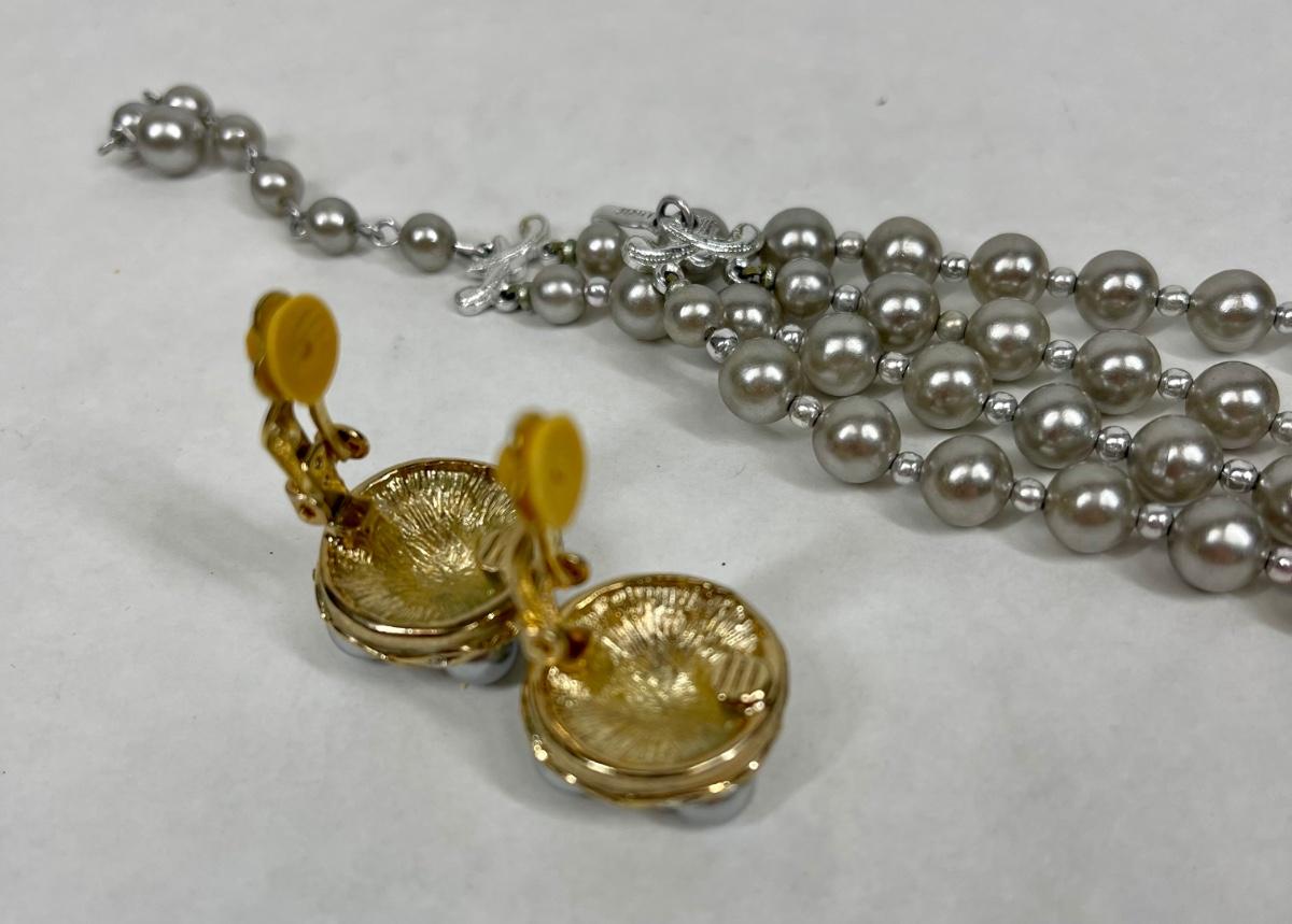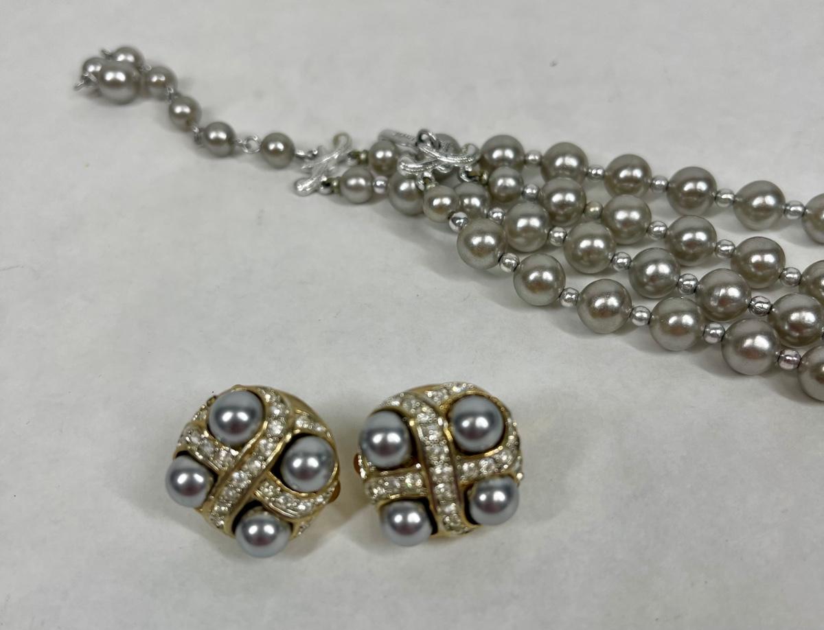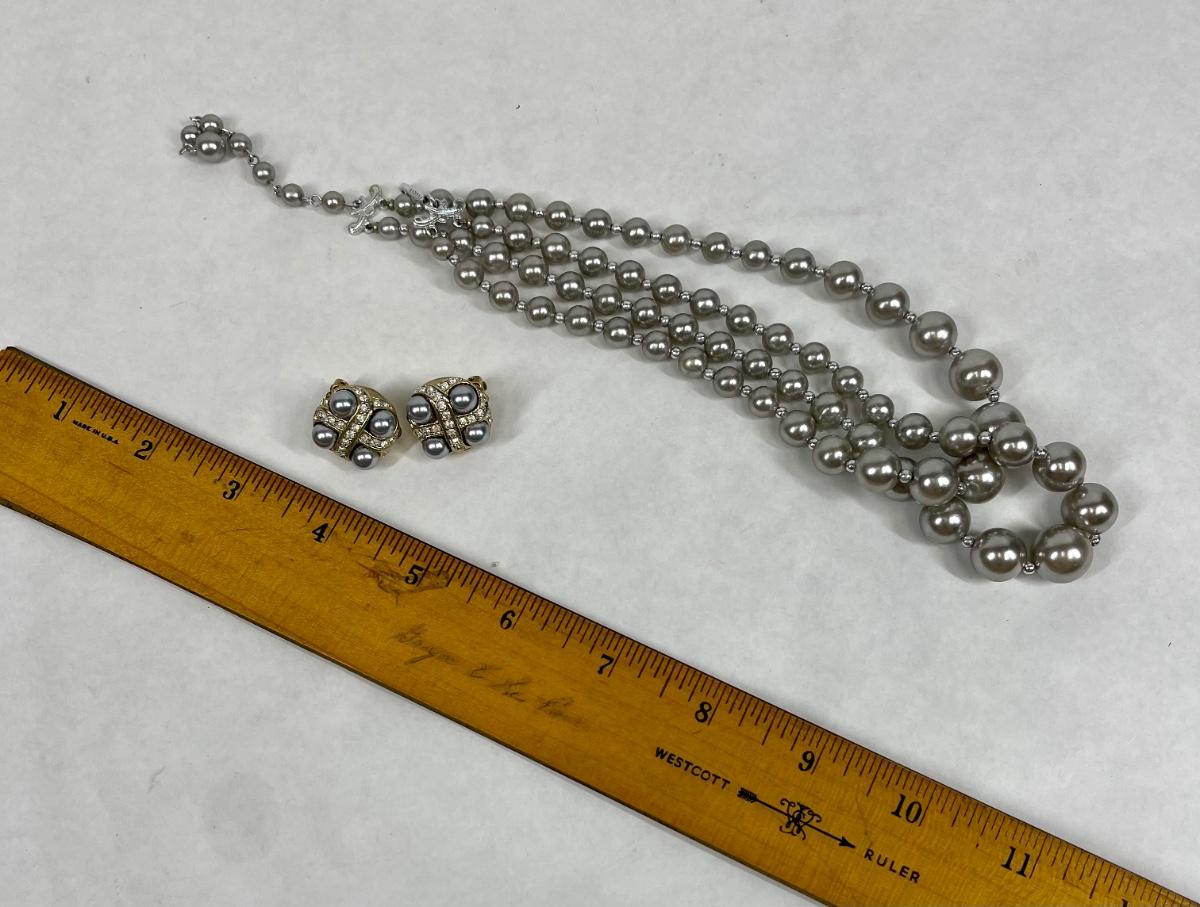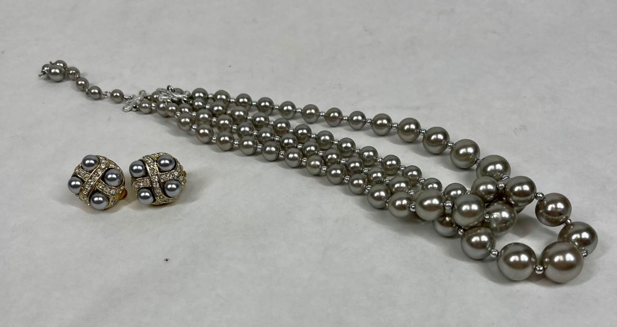Vintage Jewelry Gray Pearls with Crystal Accents Necklace & Clip-on Earring Set