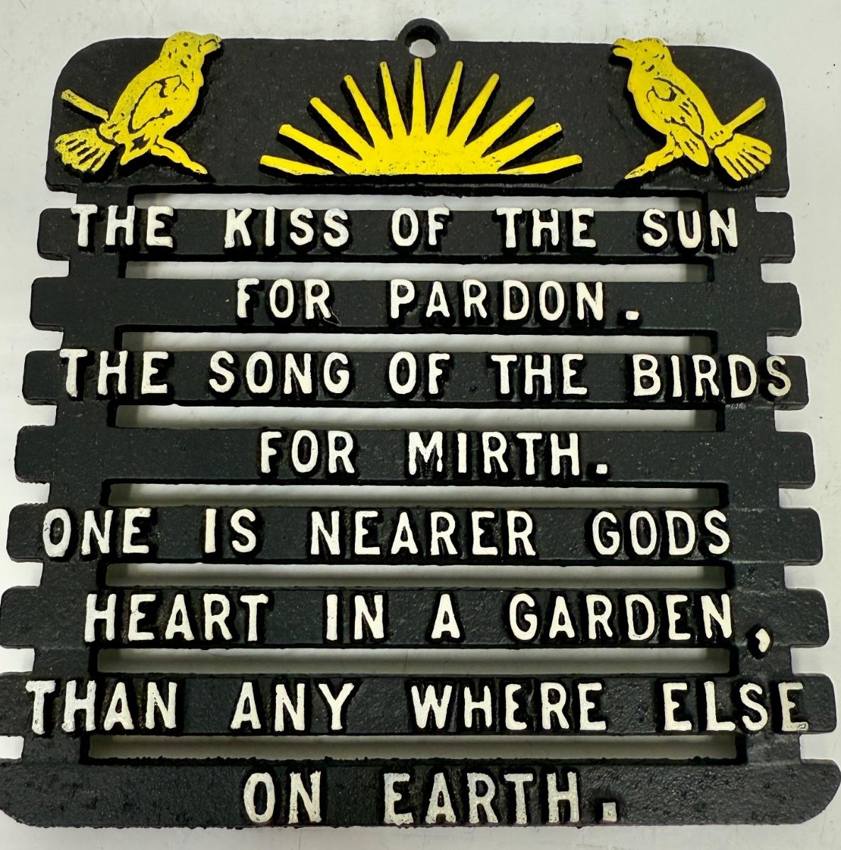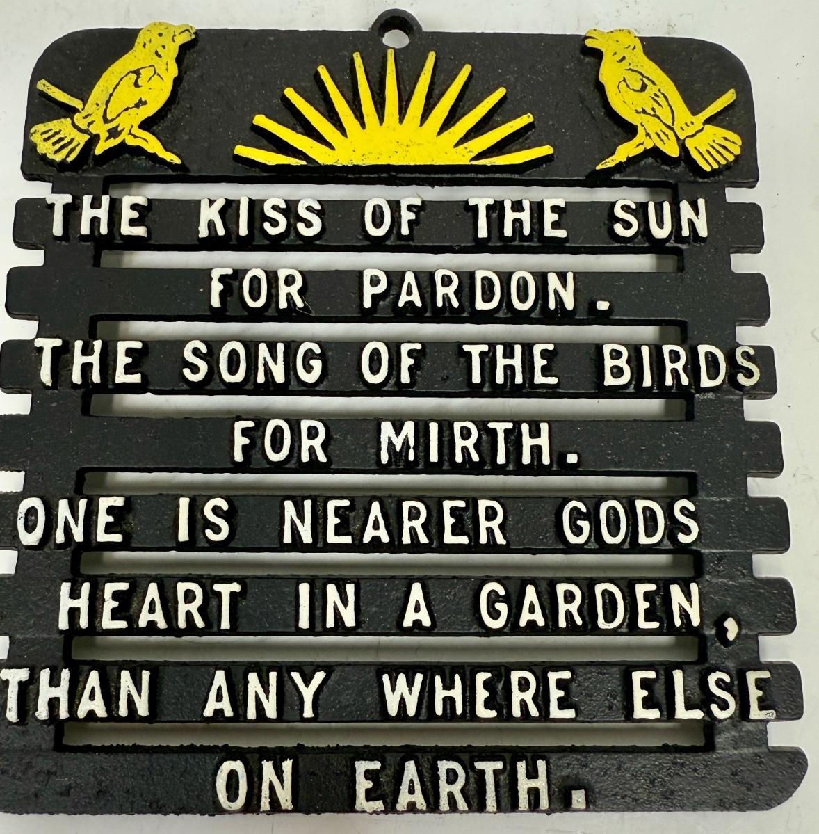 Metal Trivet or wall hanging. The phrase "The kiss of the sun for pardon, The song of the birds for mirth, One is nearer God's heart in a garden Than anywhere else on earth" is a well-known quote from the poem "God's Garden" by Dorothy Frances Gurney. The poem, published in 1913, uses the imagery of a garden to express a sense of peace, closeness to God, and finding solace in nature.