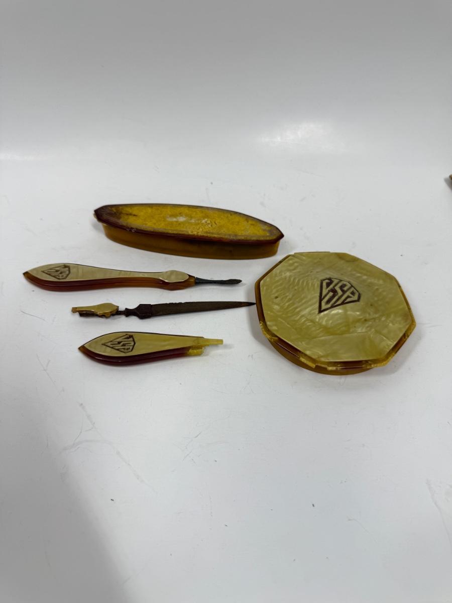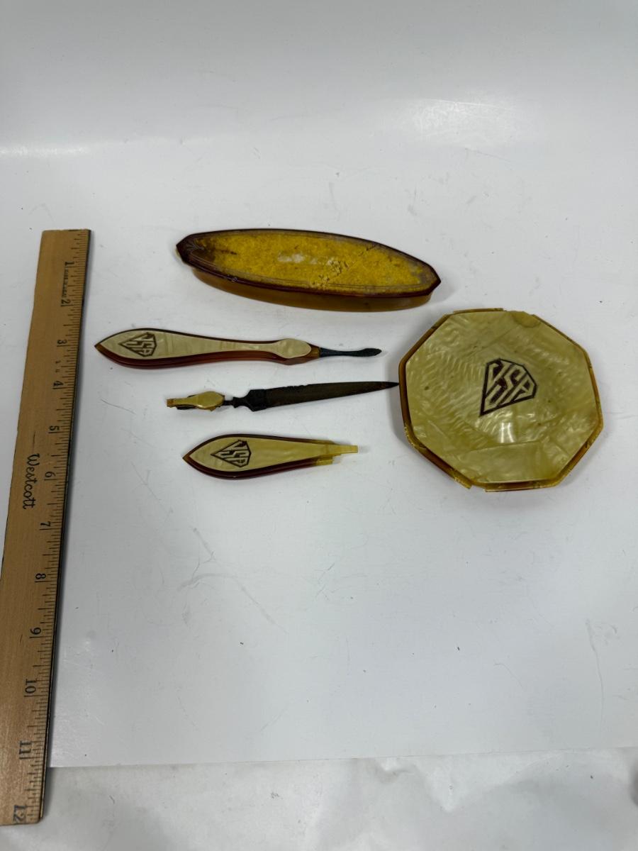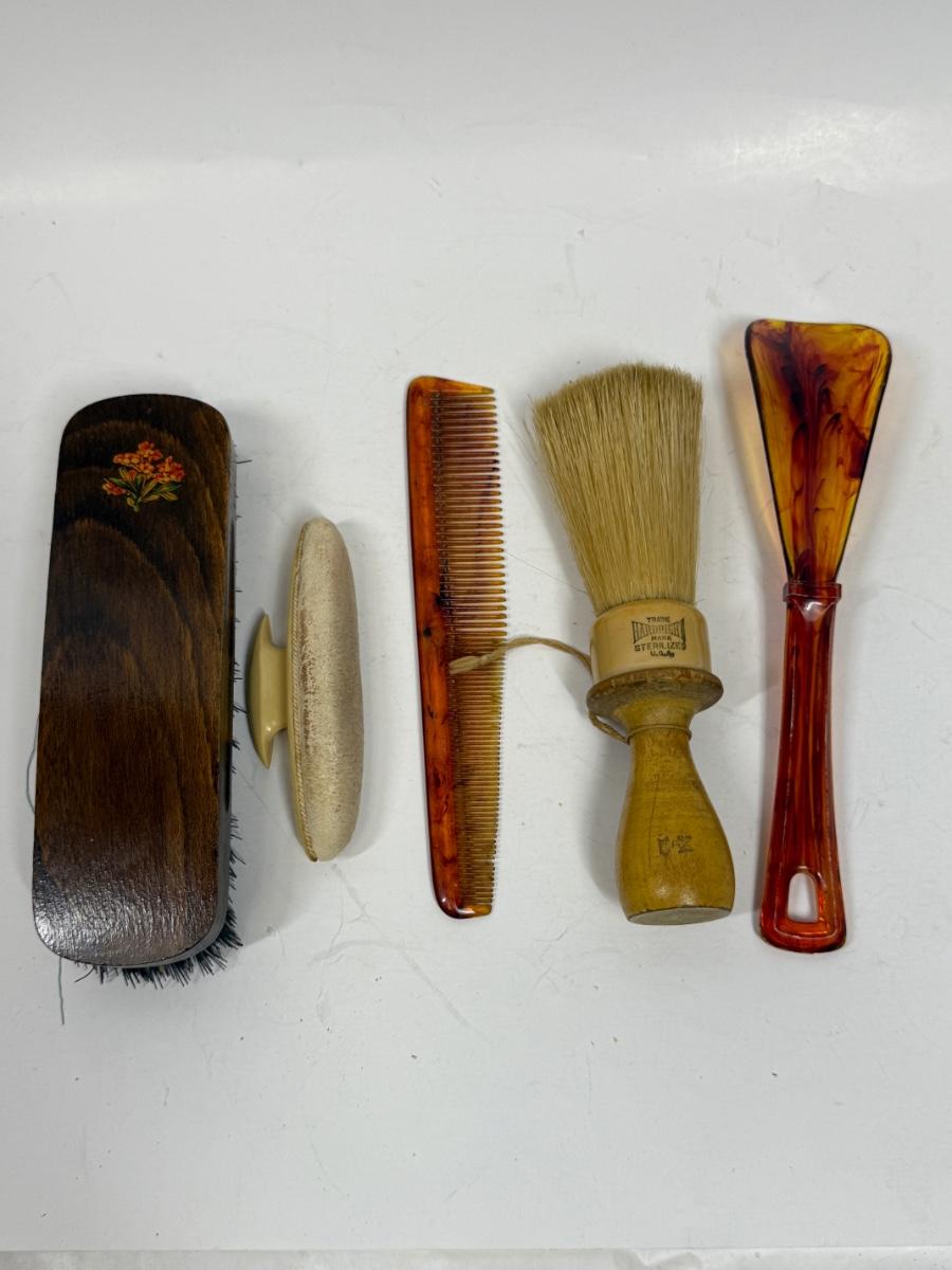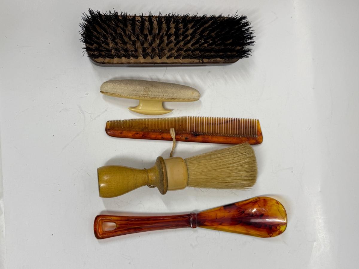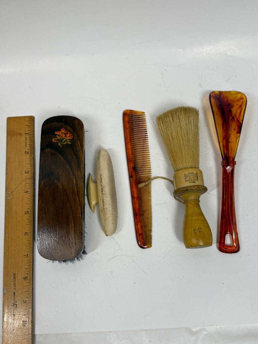 Vintage lot of Grooming Tools - shoe brush, face brush, nail buff, comb, shoe horn wood and early plastics