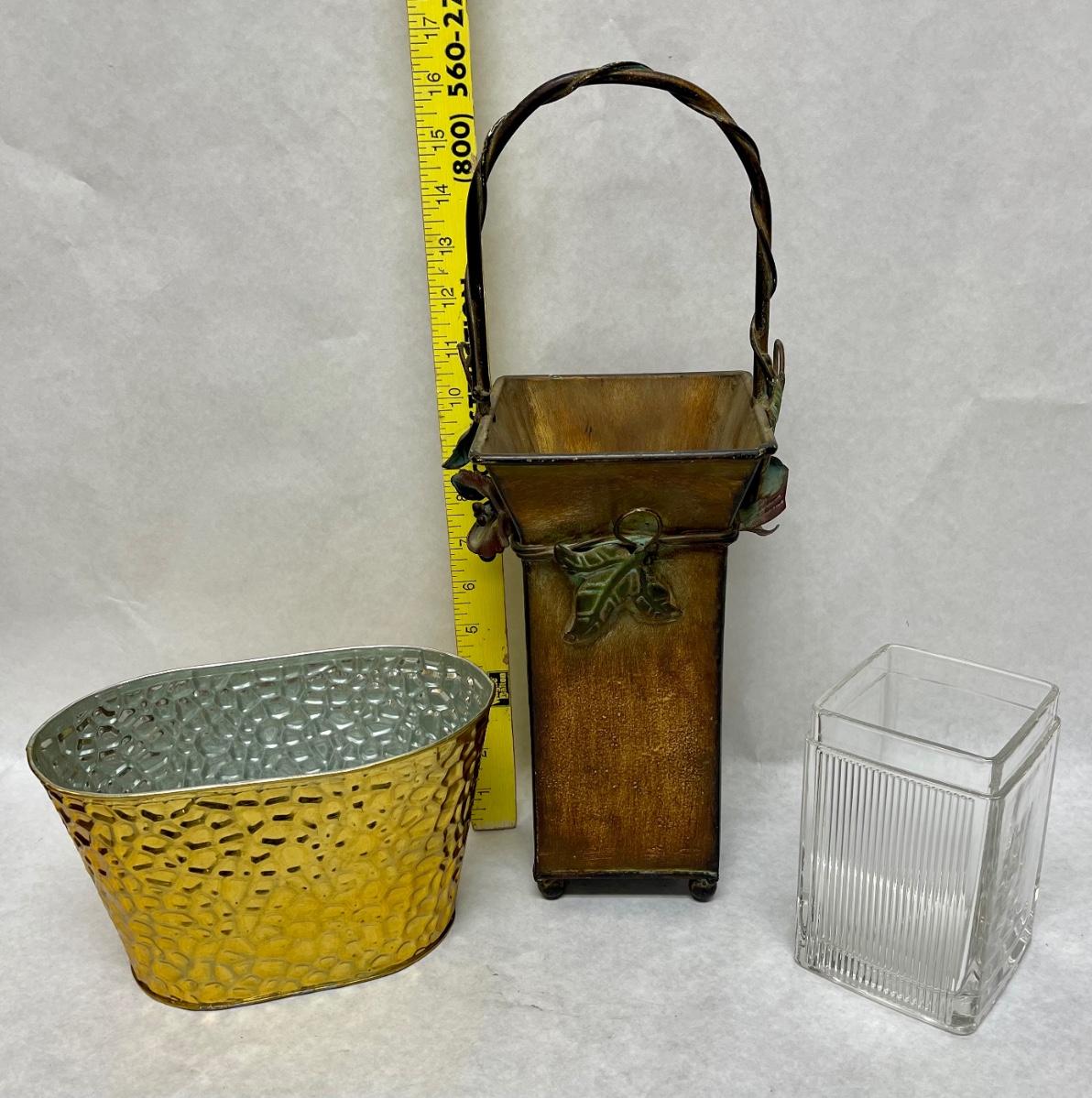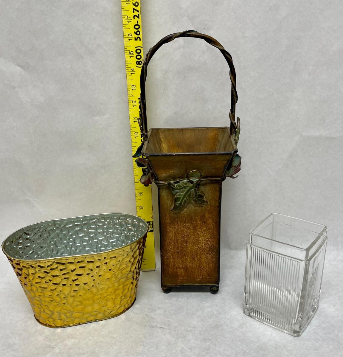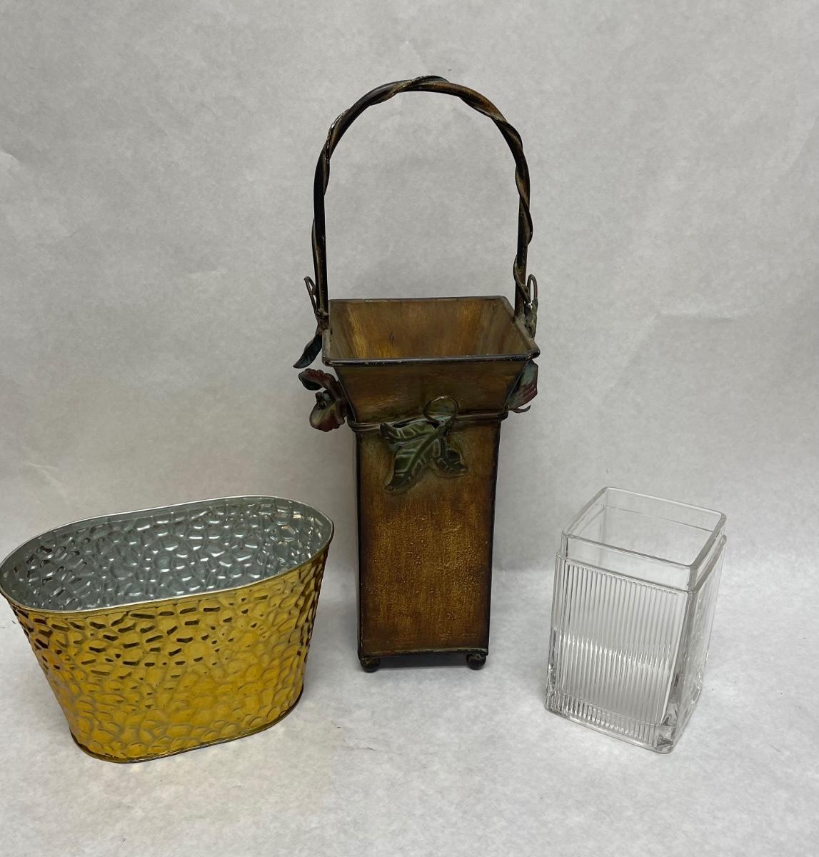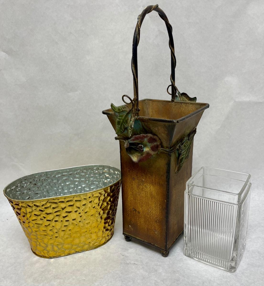Misc Containers Lot - oval gold tin pail, Metal wine bottle holder with handle, square class vase