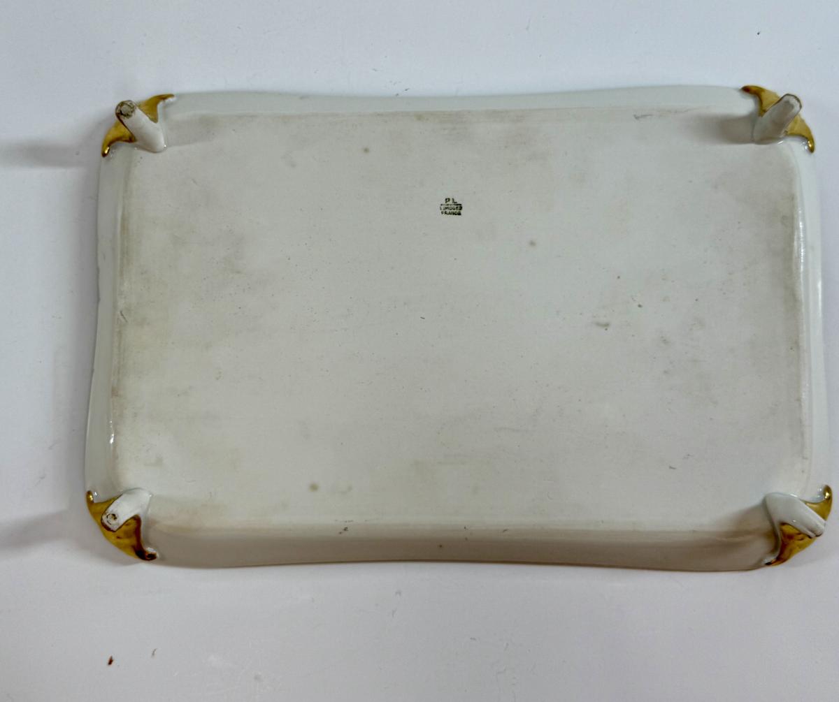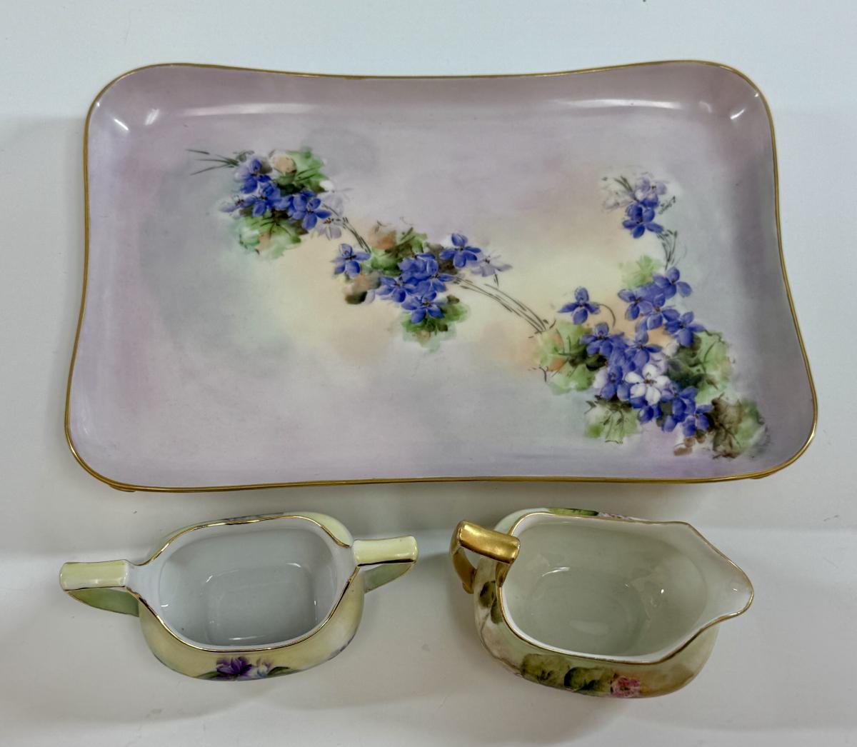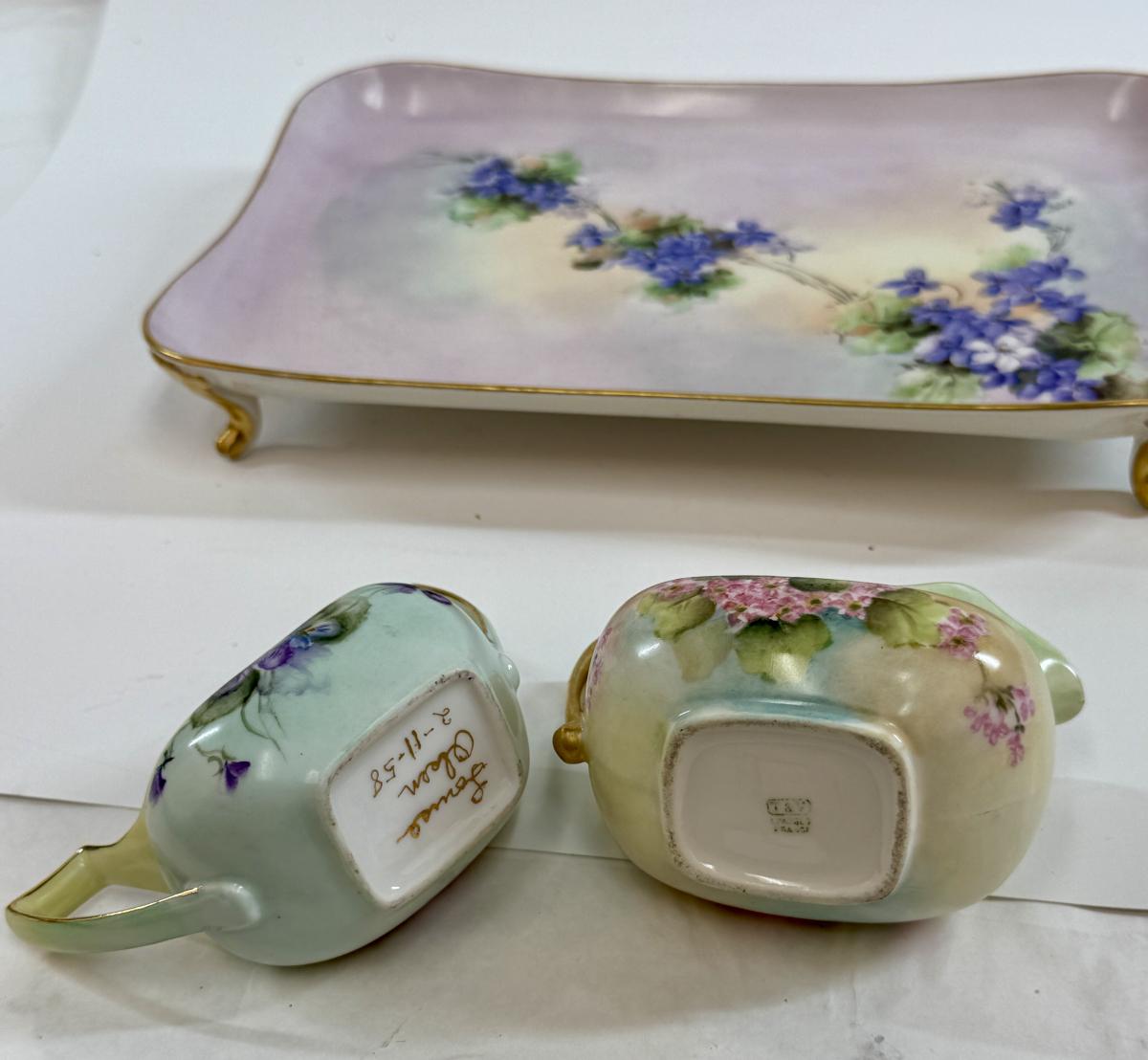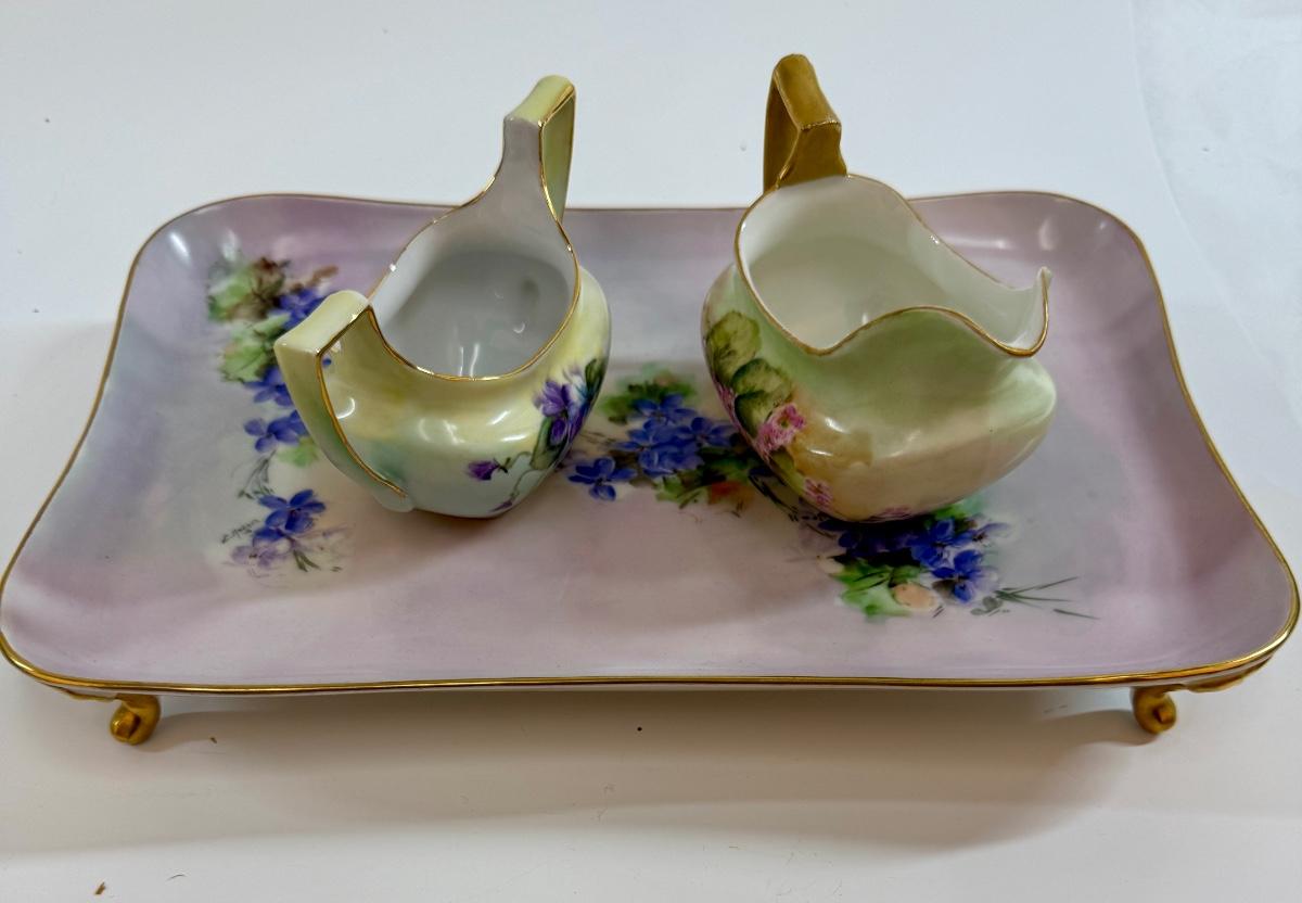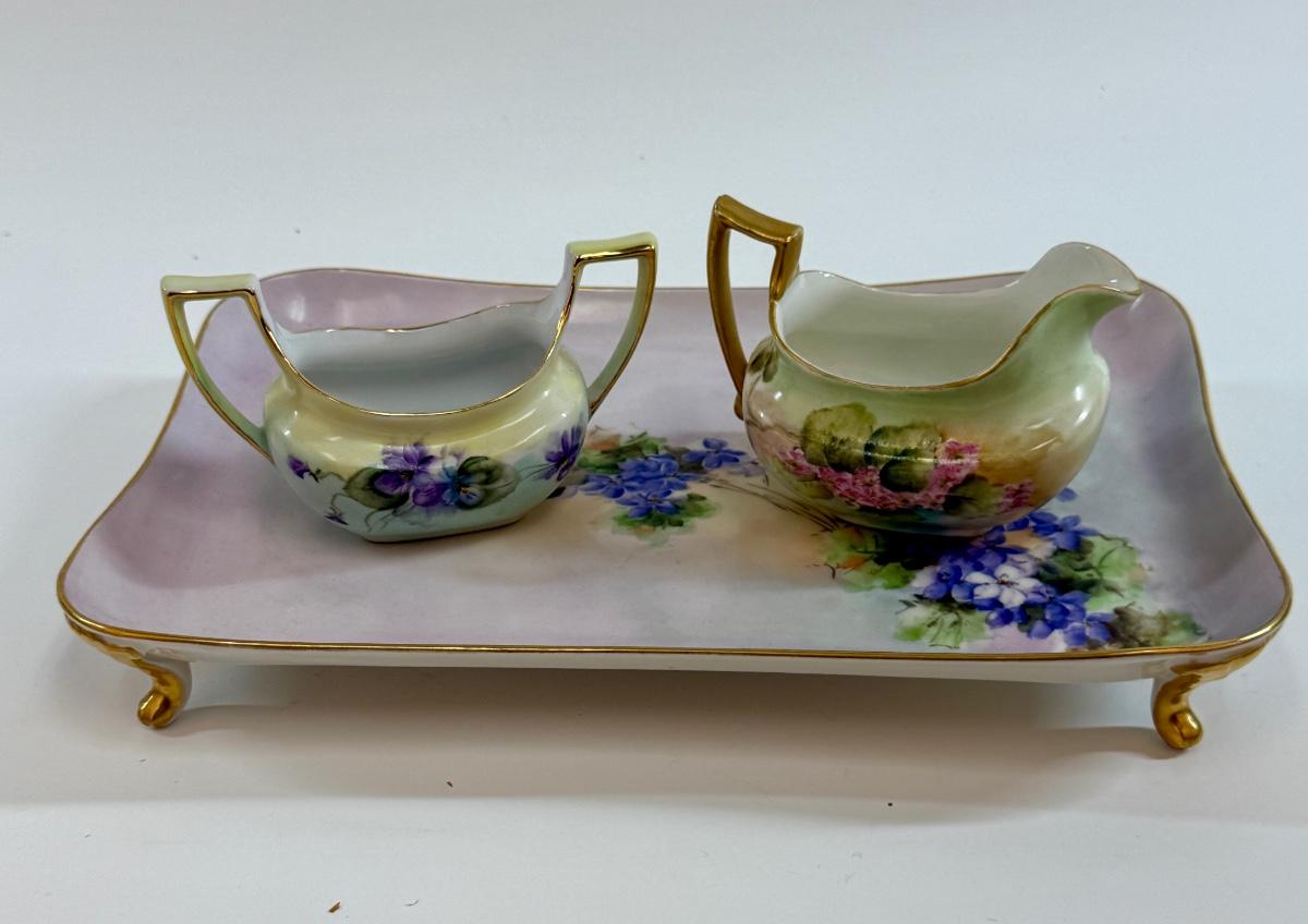 In good condition with no chips, cracks, or crazing. Tray is marked PL Limoges France, Creamer is marked T & V Limoges, France, and open sugar bowl without top is signed on the bottom by artist.