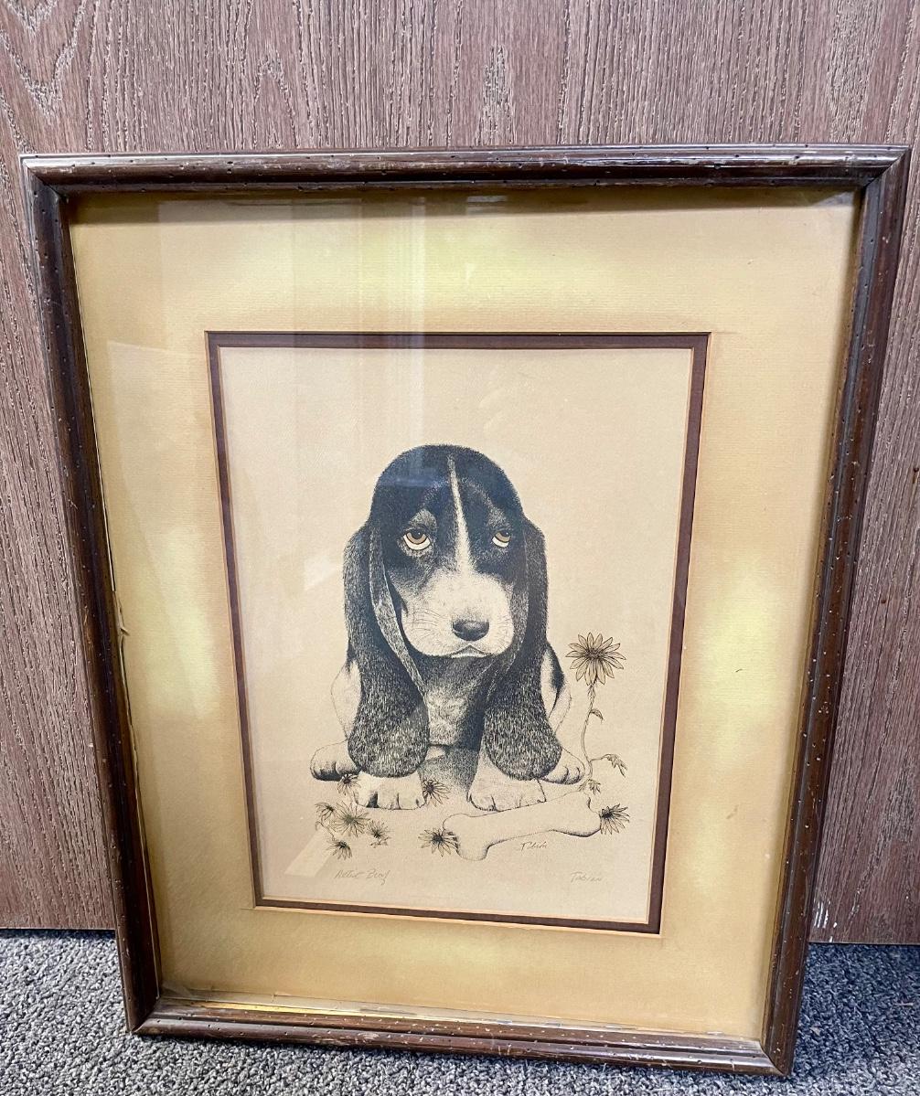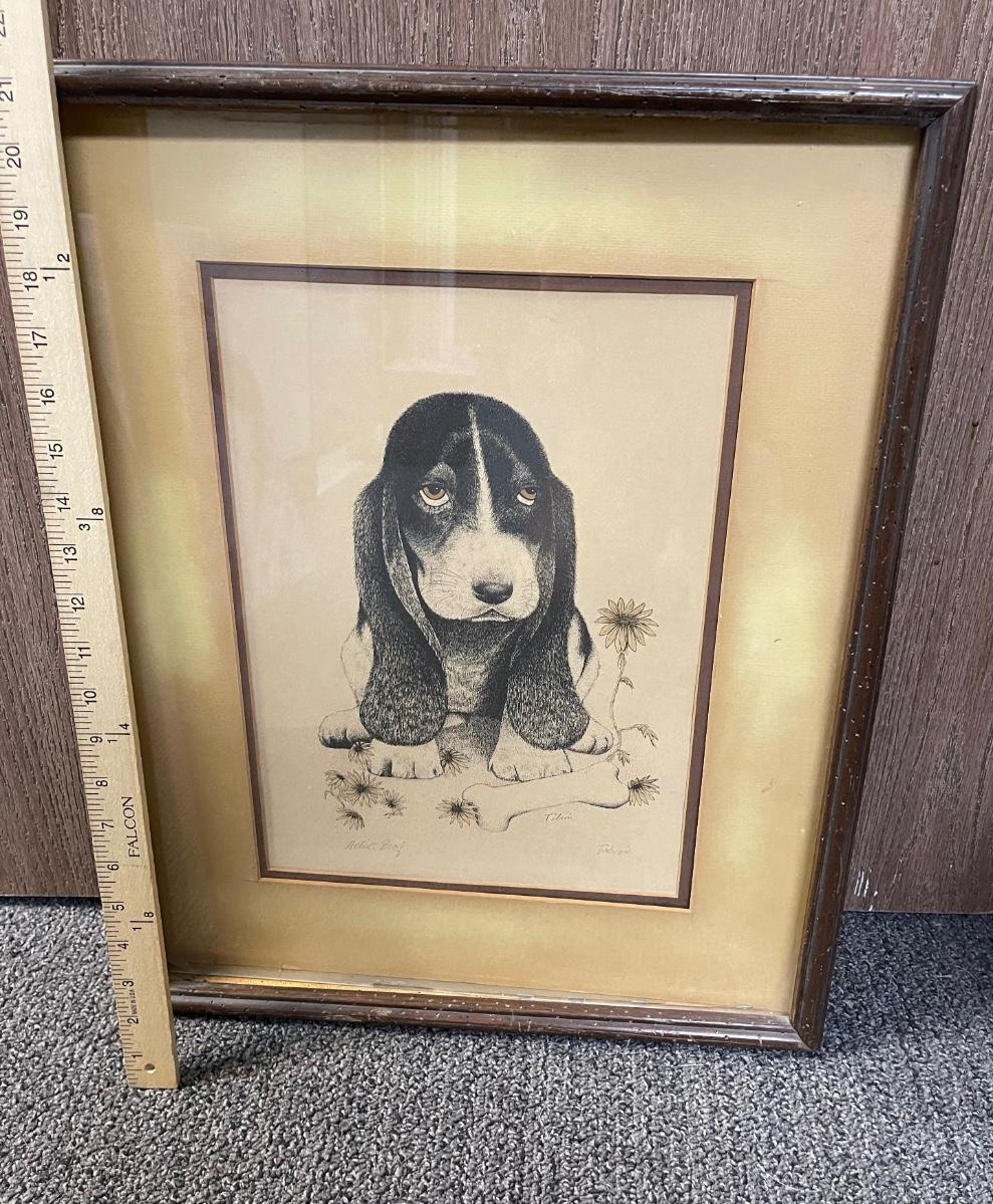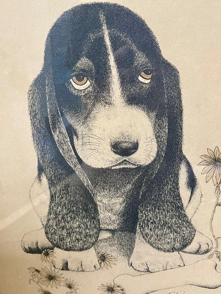 Artist Proof Framed Sketch of Basset Hound Puppy sitting in amongst daisies signed Tobion