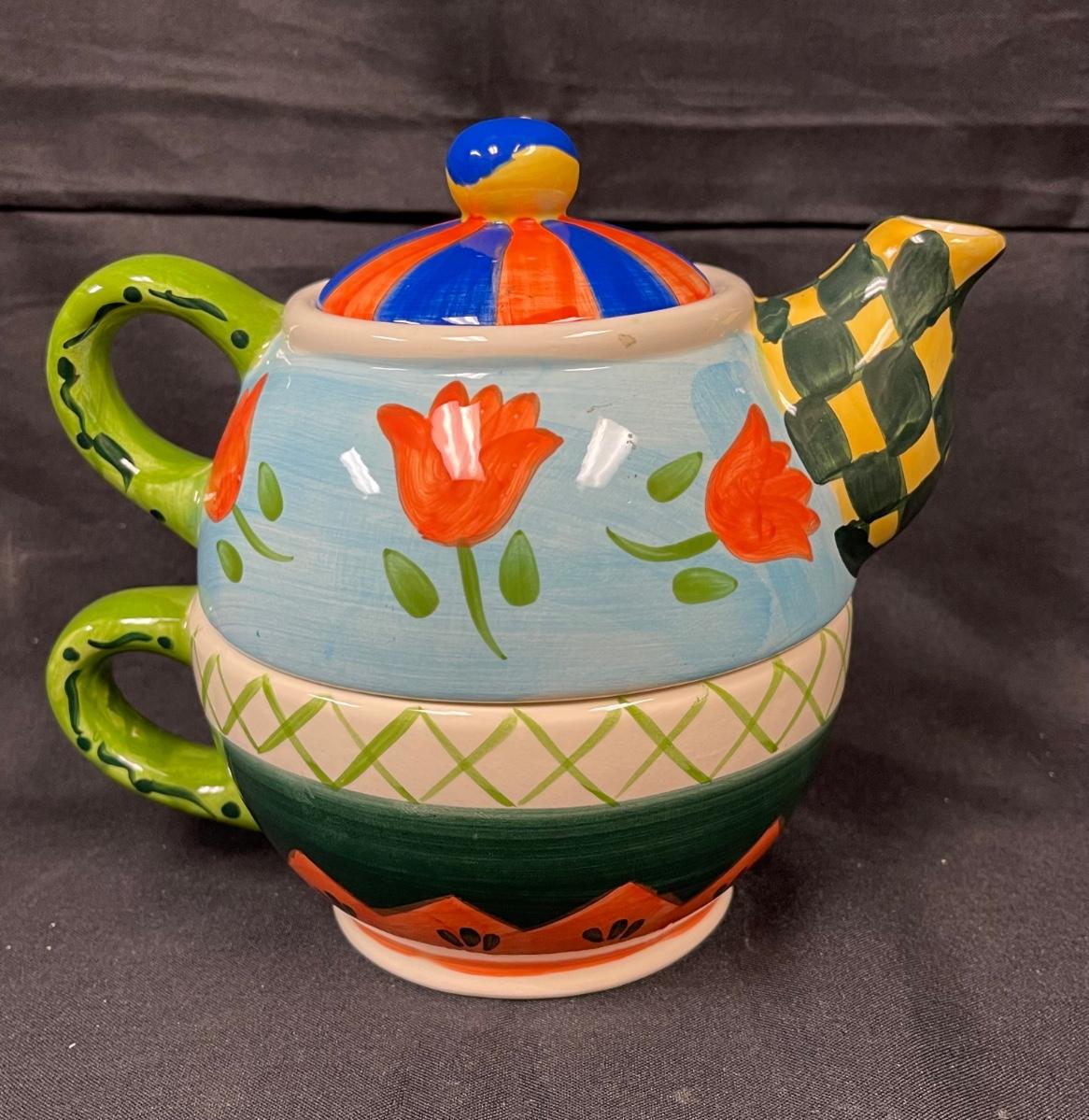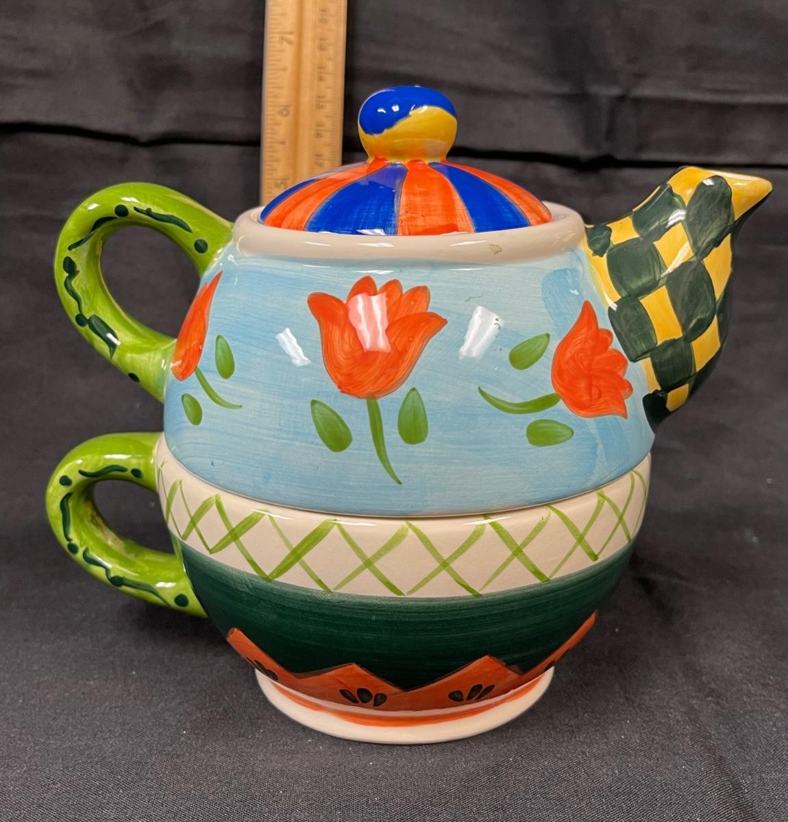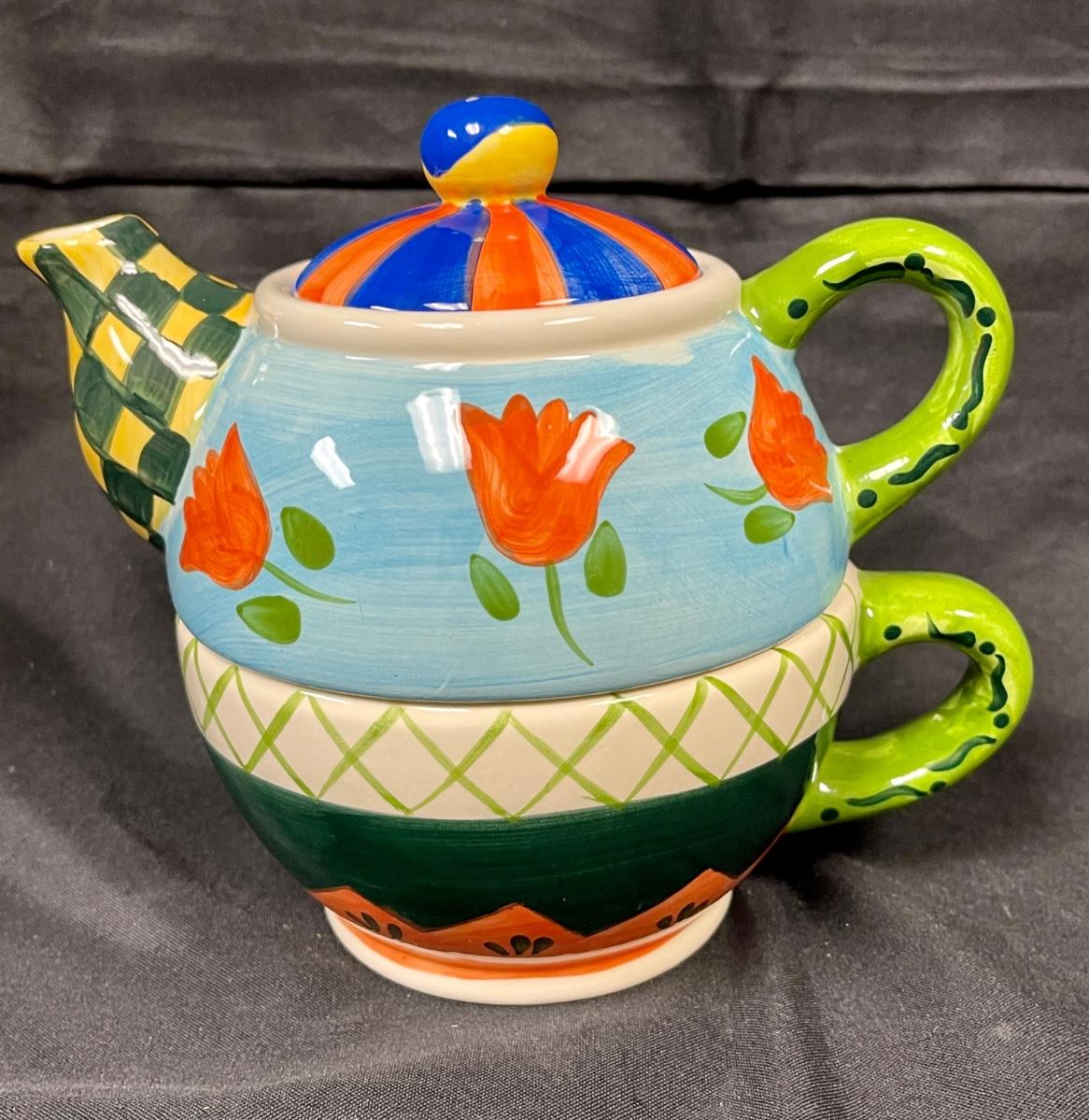 Colorful Stacked Tea for One Personal Single Teapot & Teacup. In good condition, would display nicely.