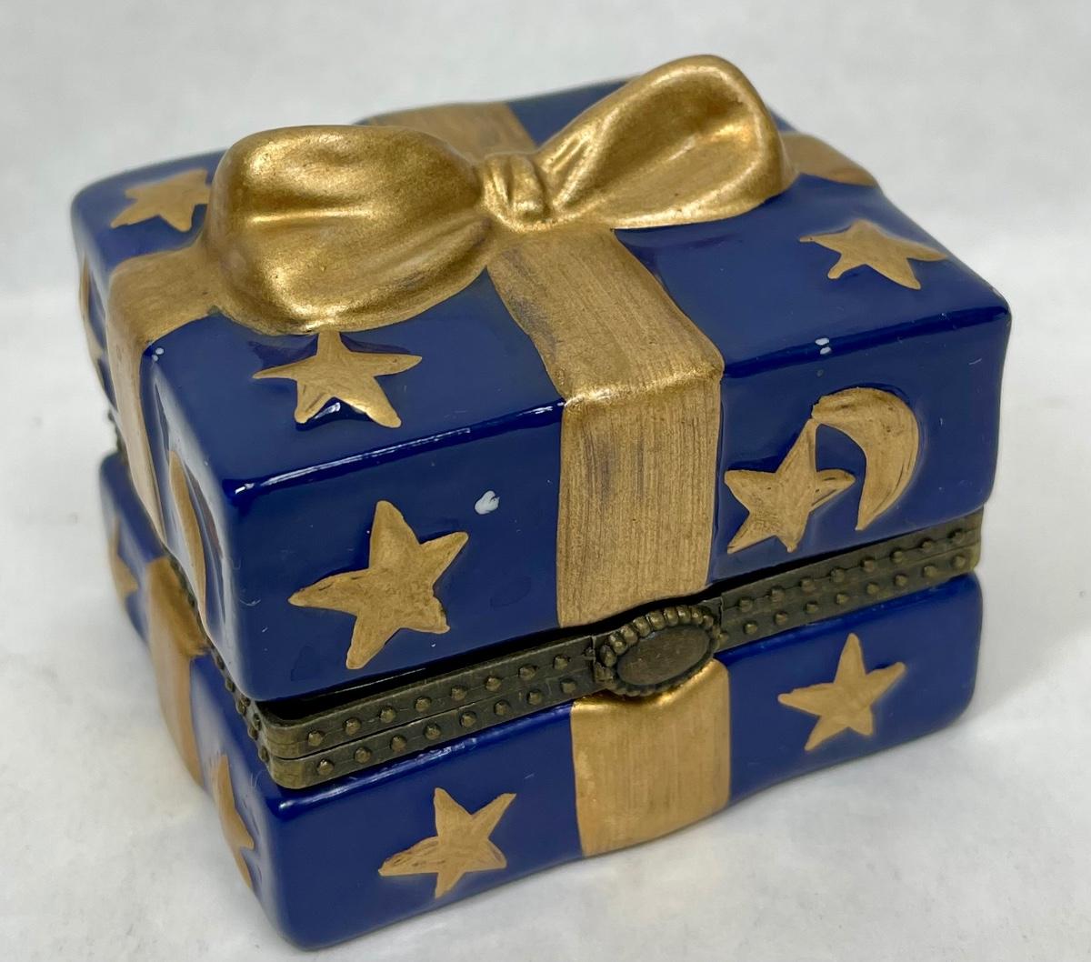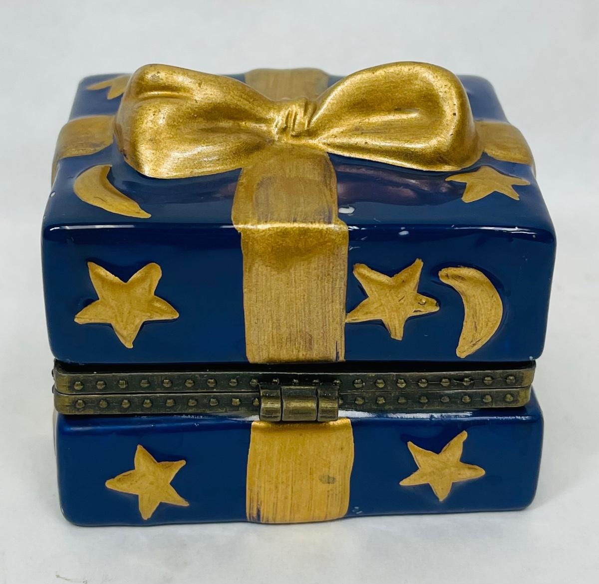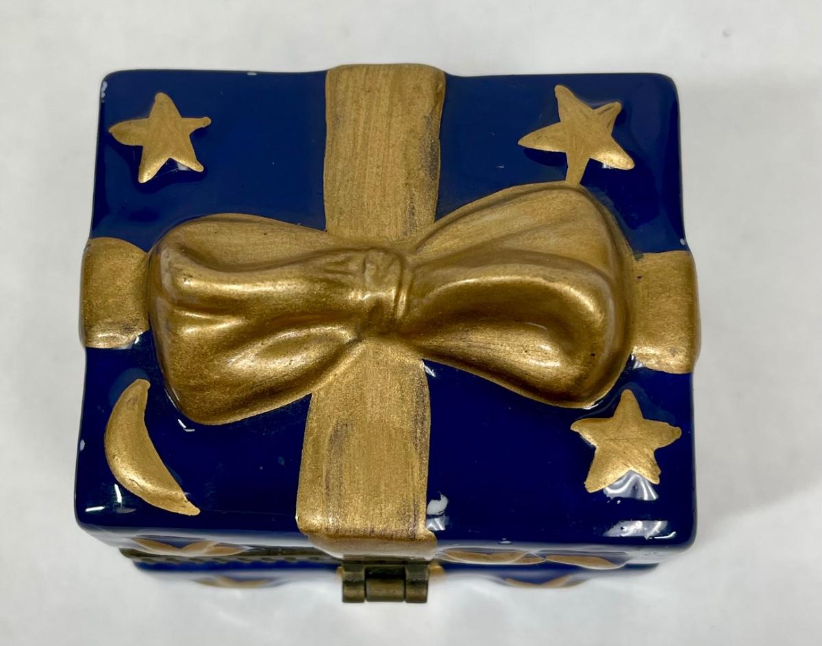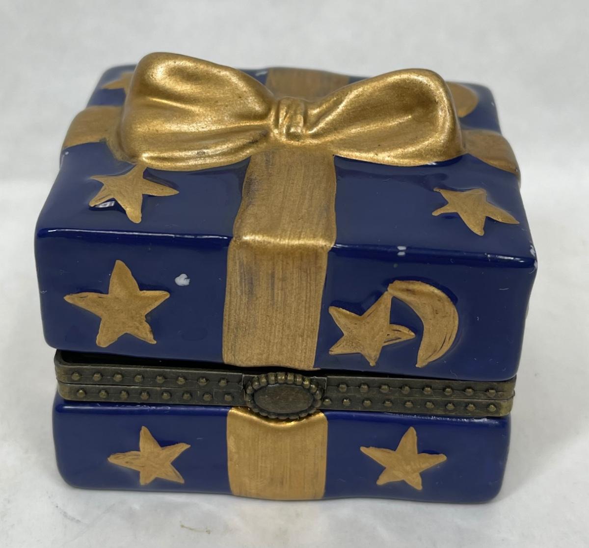 Ceramic Trinket Box Figural Wrapped Present Blue & Gold