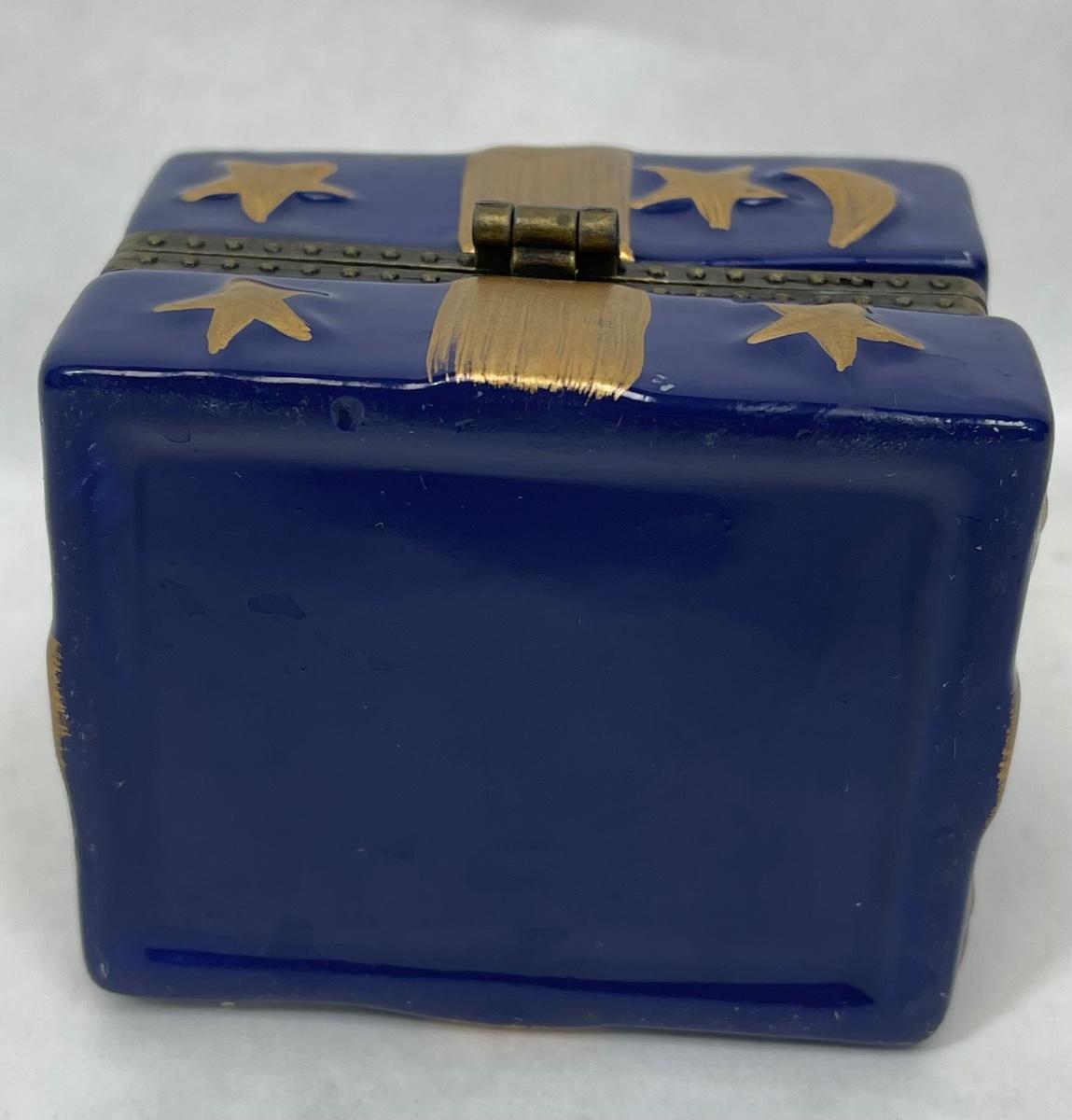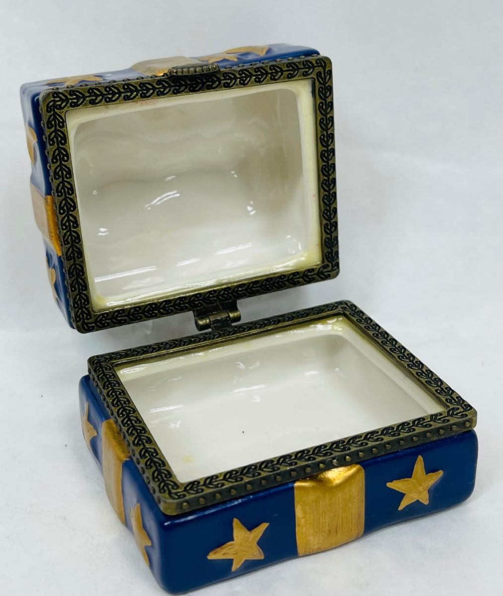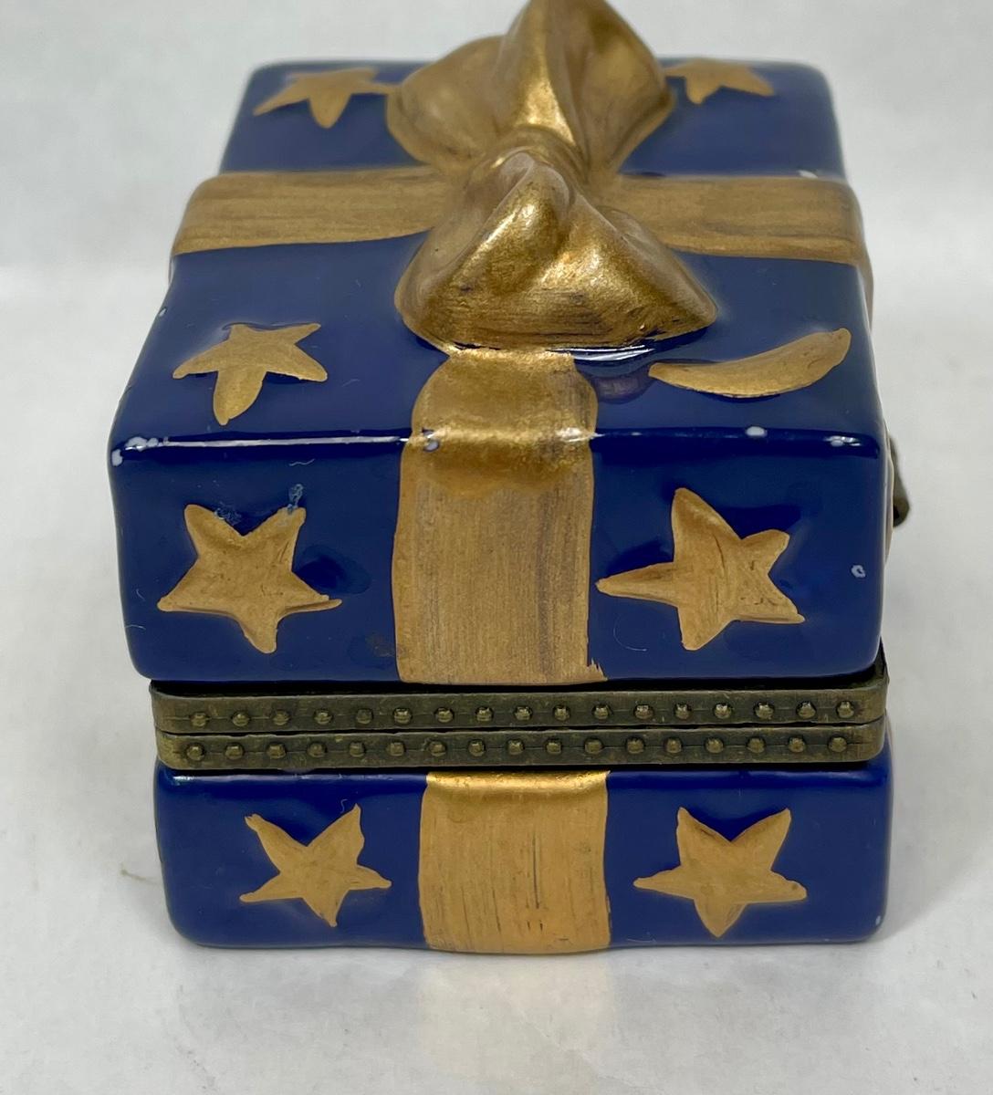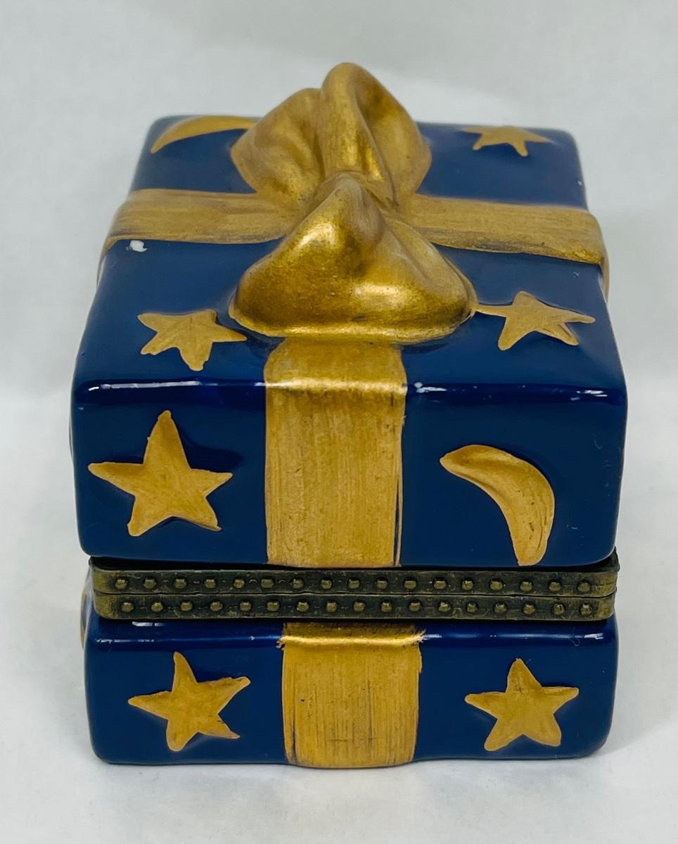 Ceramic Trinket Box Figural Wrapped Present Blue & Gold