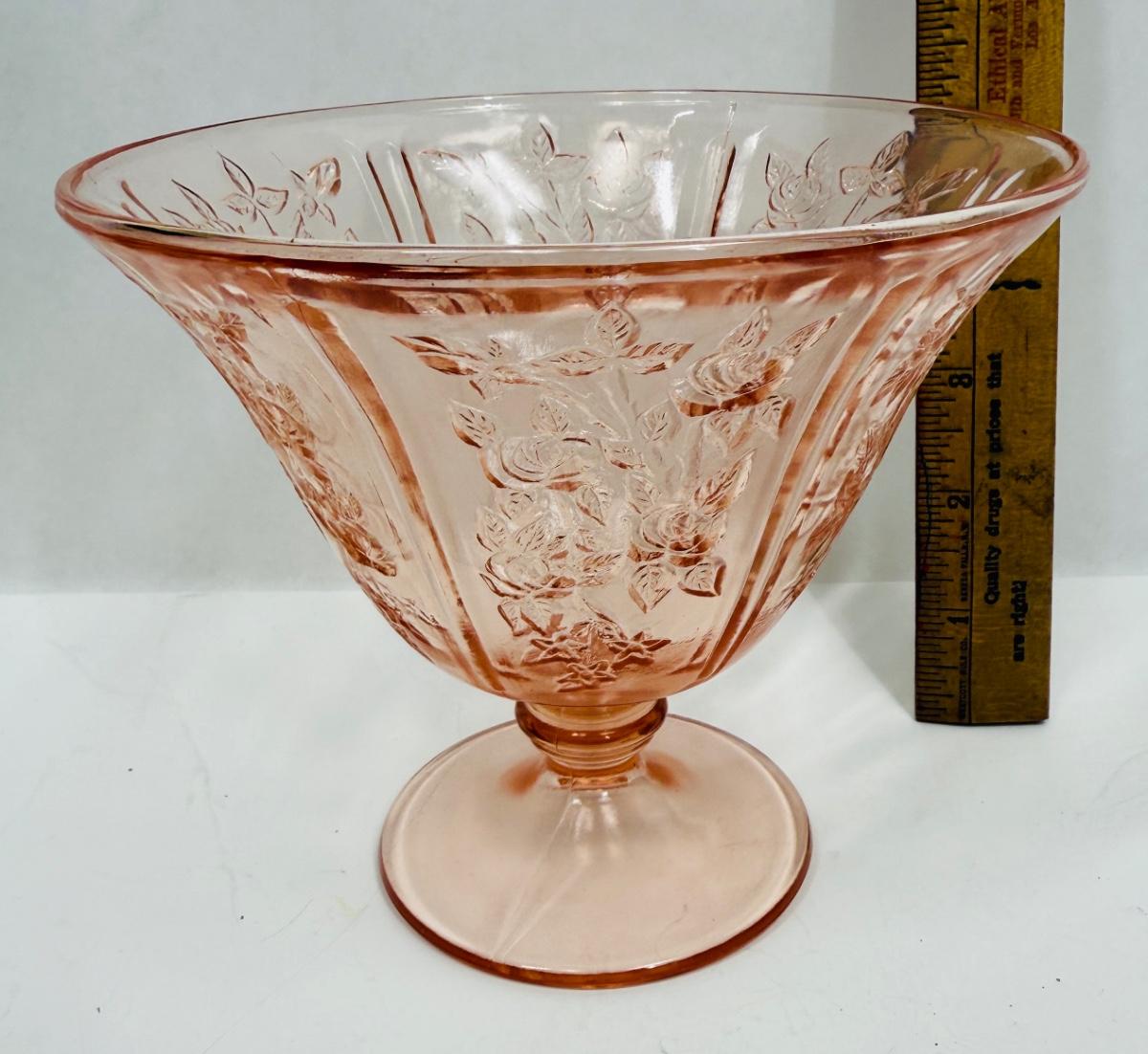 Vintage Sharon pattern pink glass candy dish, about 5" tall overall (bowl about 5 7/8" in diameter). Not sure if this is a 1930s original or one of the 80s - 90s reproductions, but it's certainly vintage in any case! Condition is very good, no chips or damage.