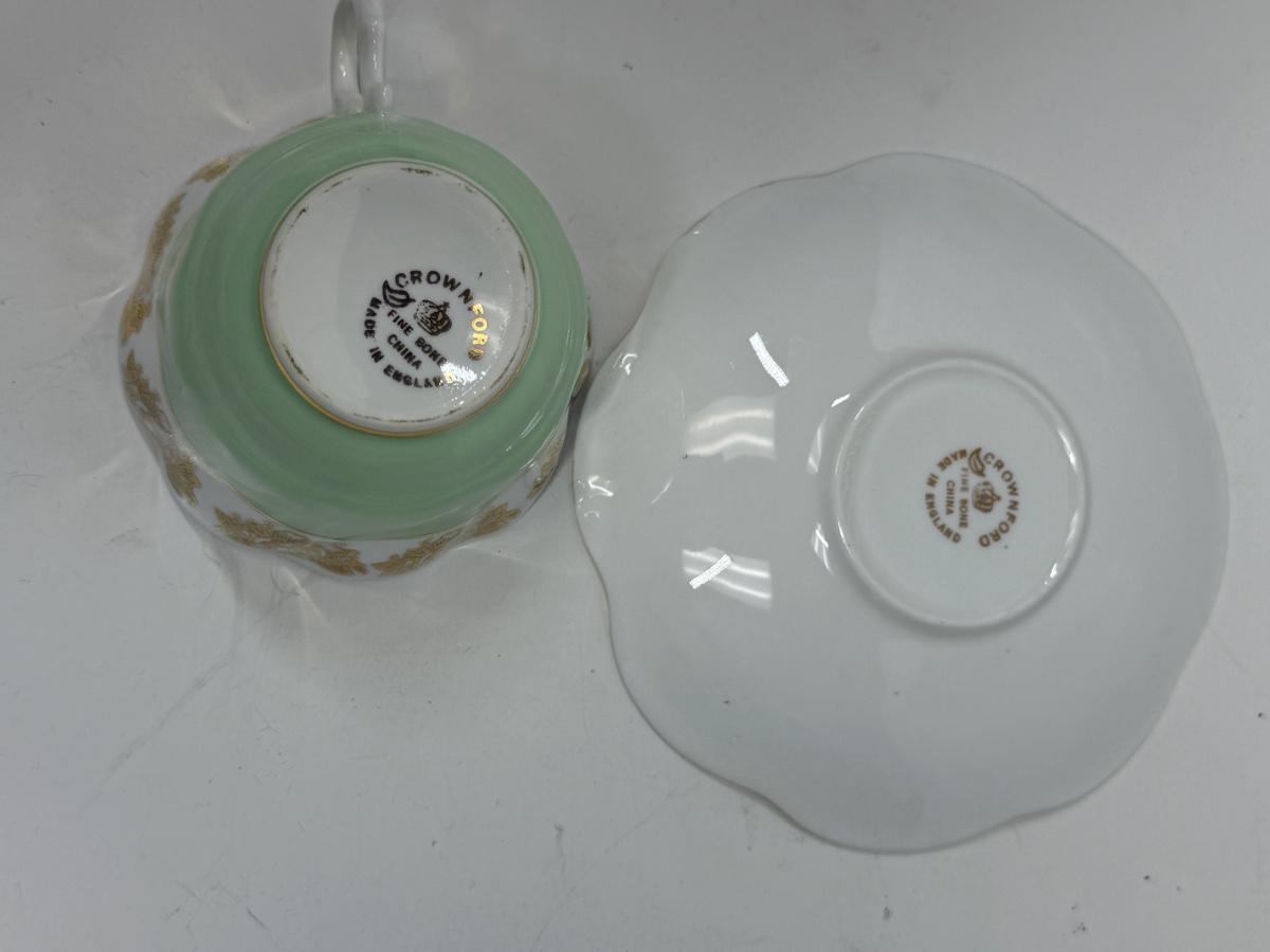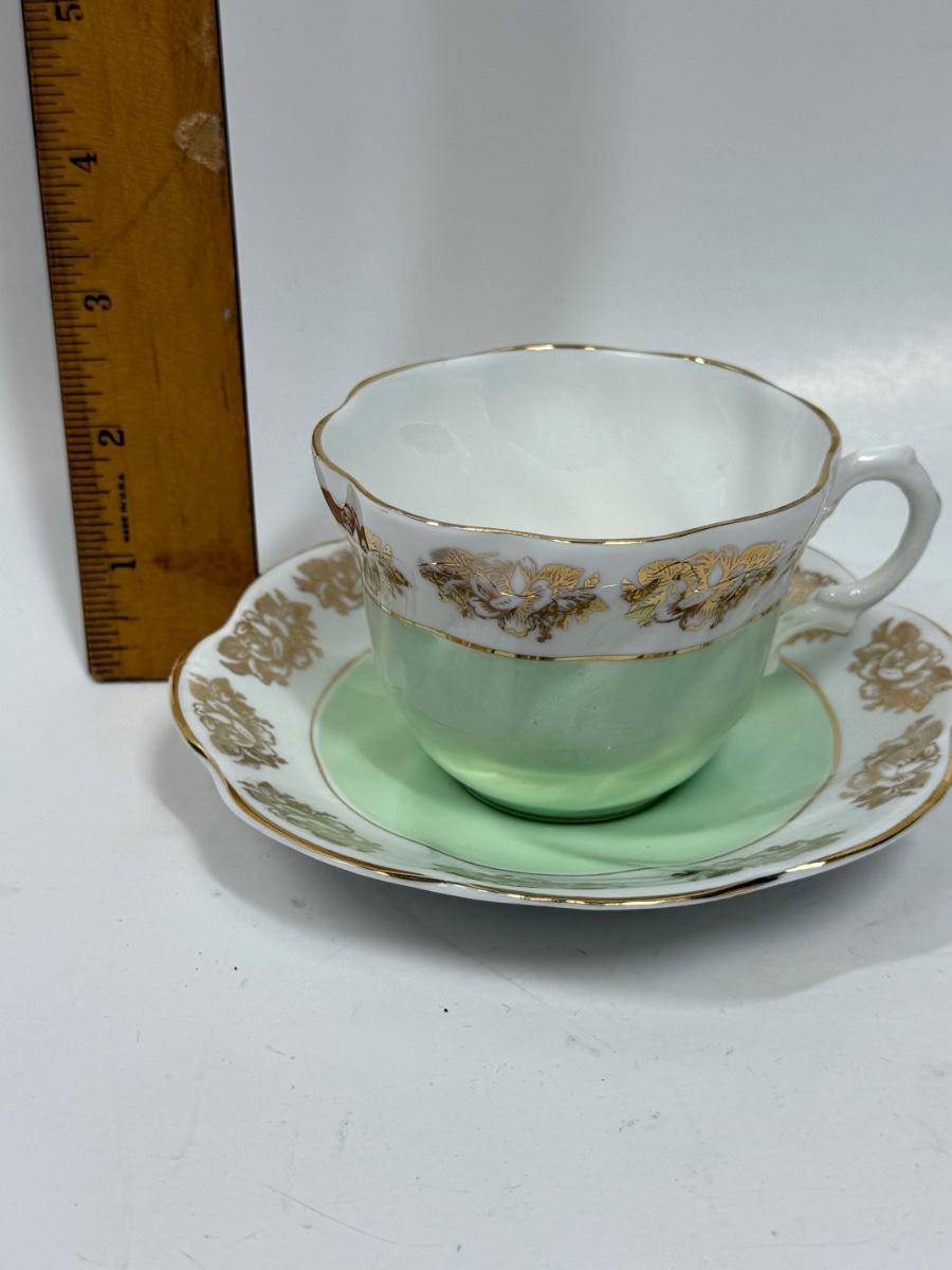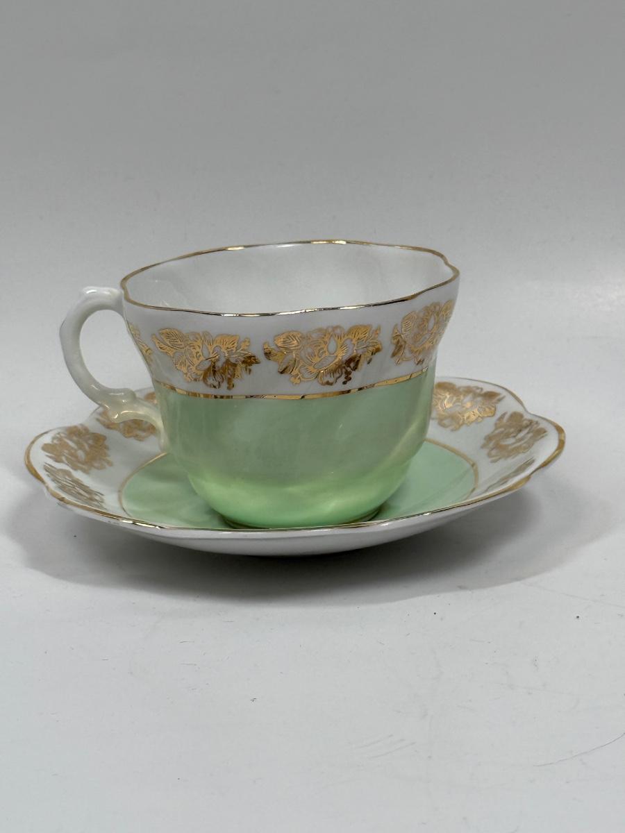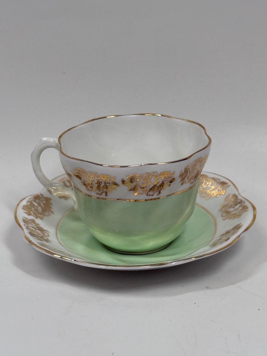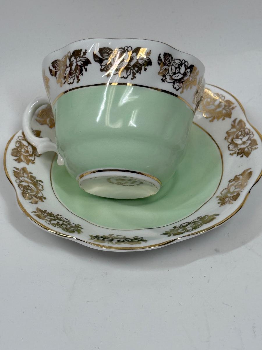Vintage Queen Anne Royal Stanford Mint Green & Gold Bone China Tae Cup and Saucer