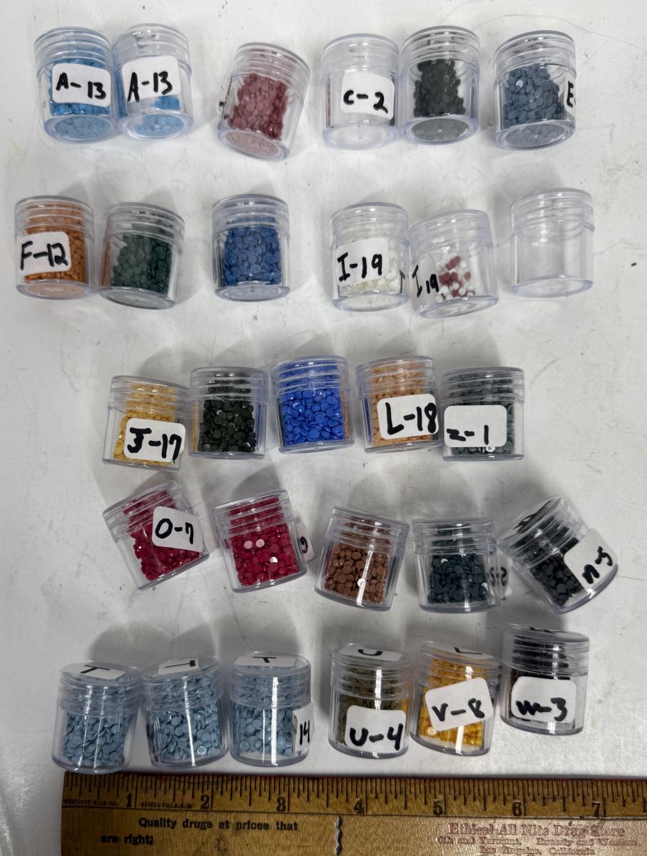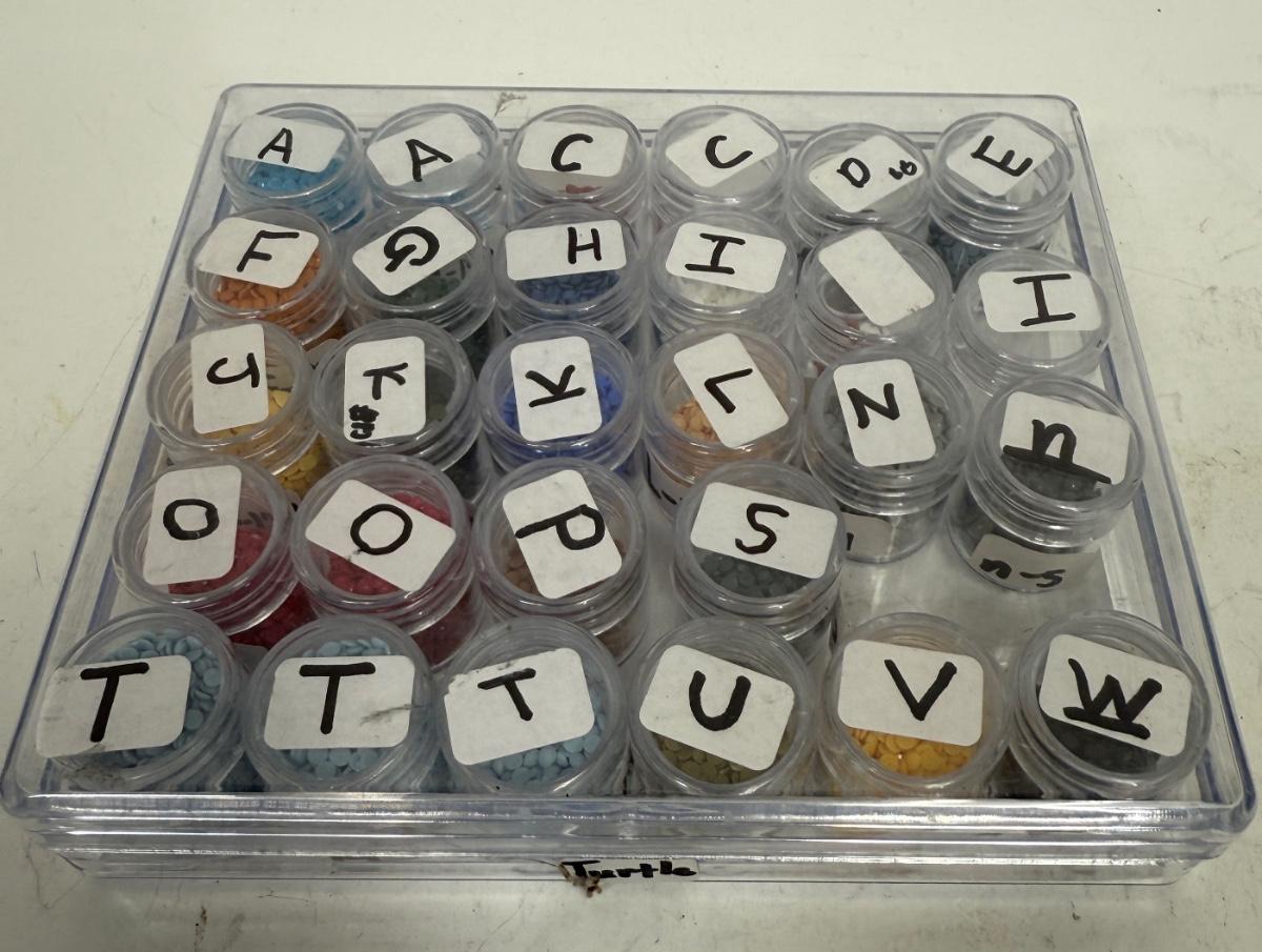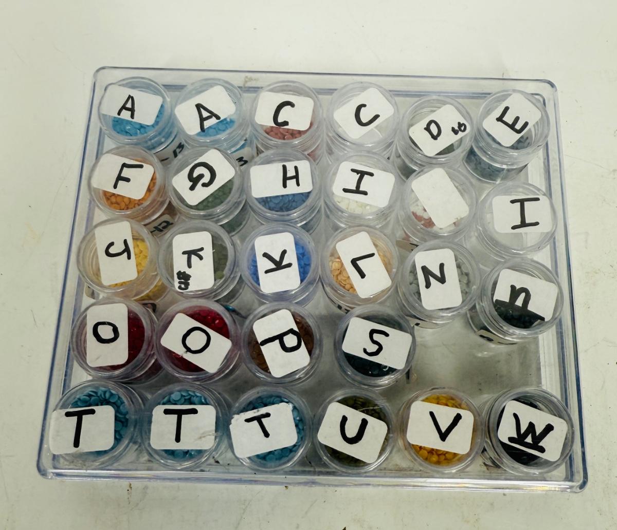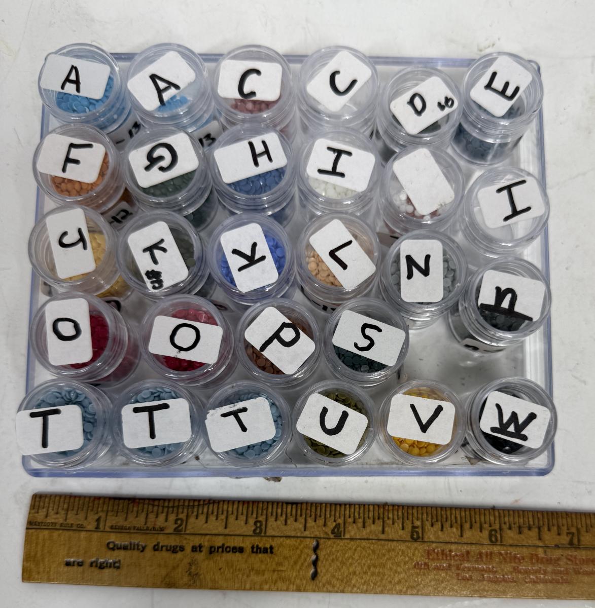 Vintage Seed Bead Storage Tray with individual lidded bottles labeled by previous owner