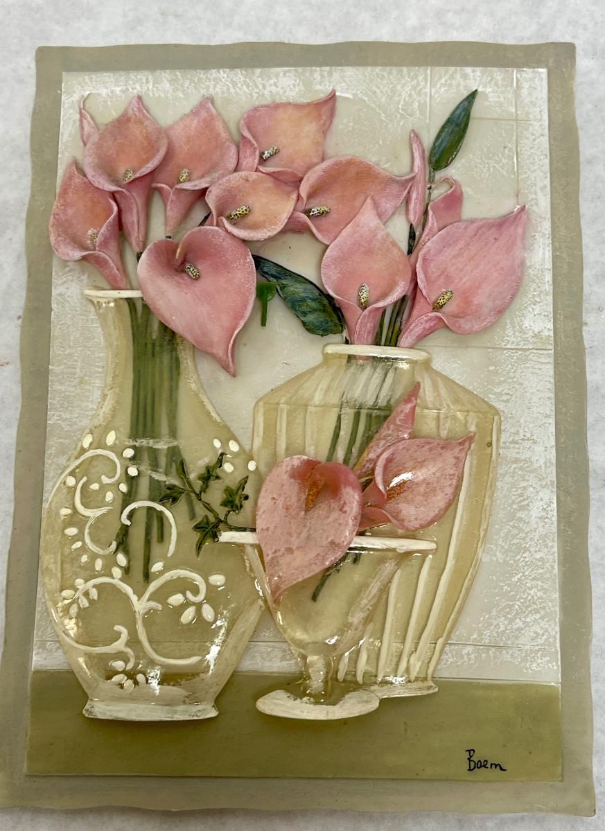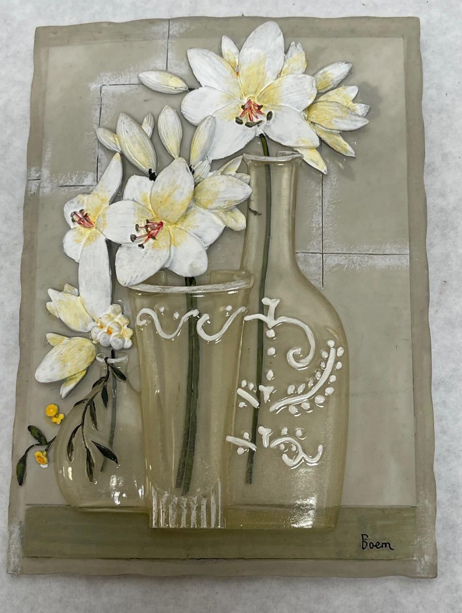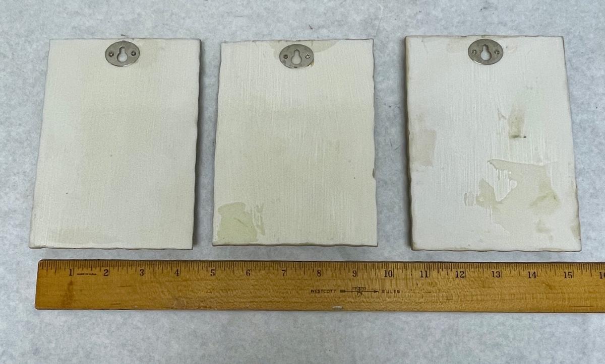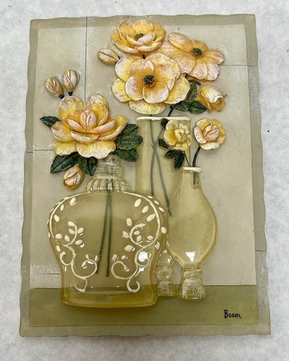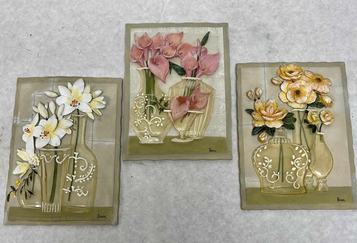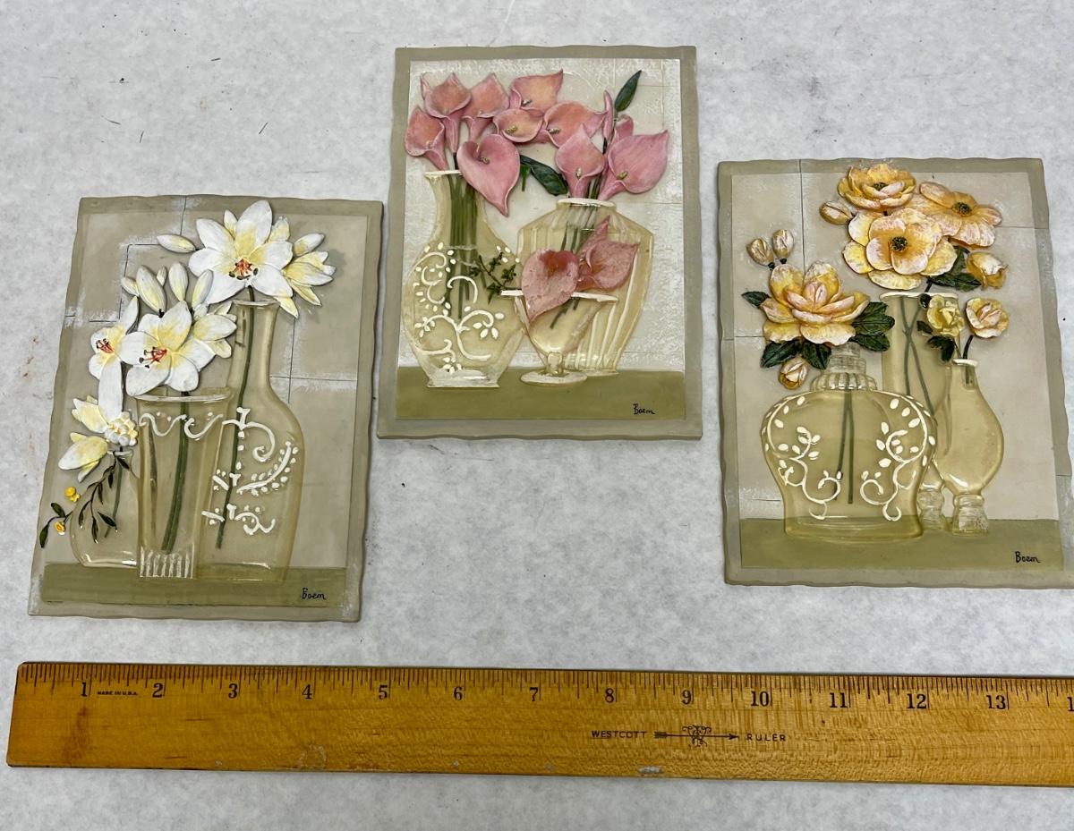 Set Of 3 Vintage 3D Wall Art Tiles by Boem Flowers Acrylic & Ceramic 1950s