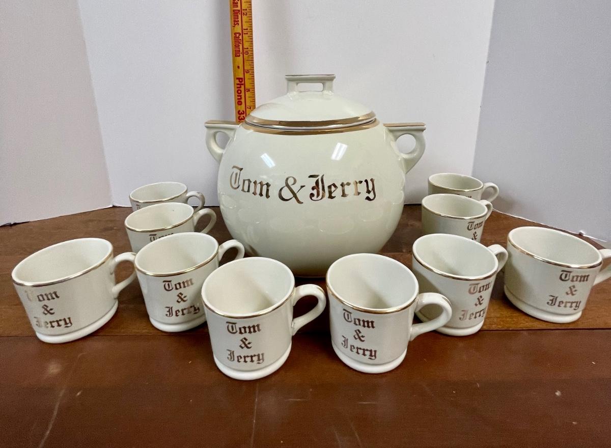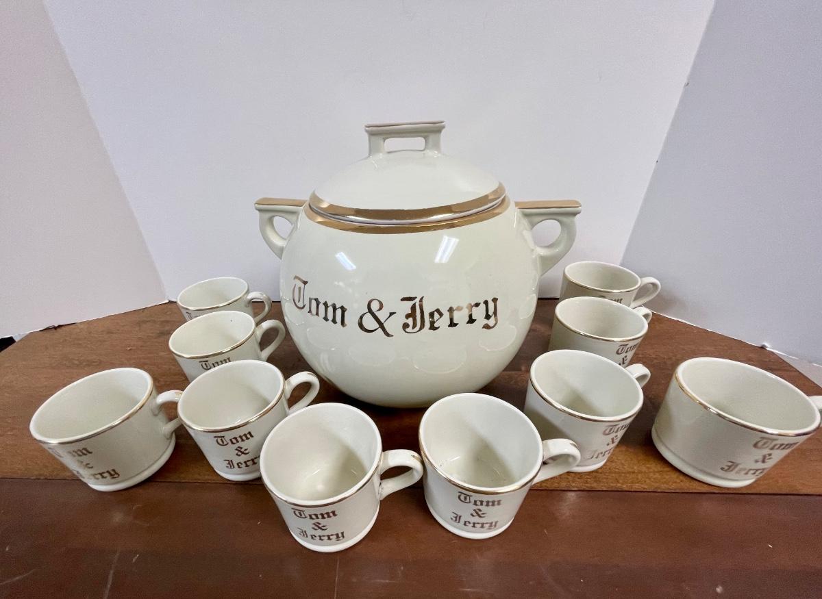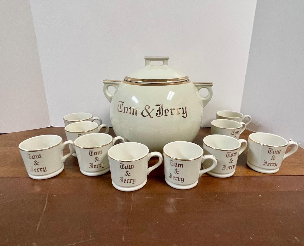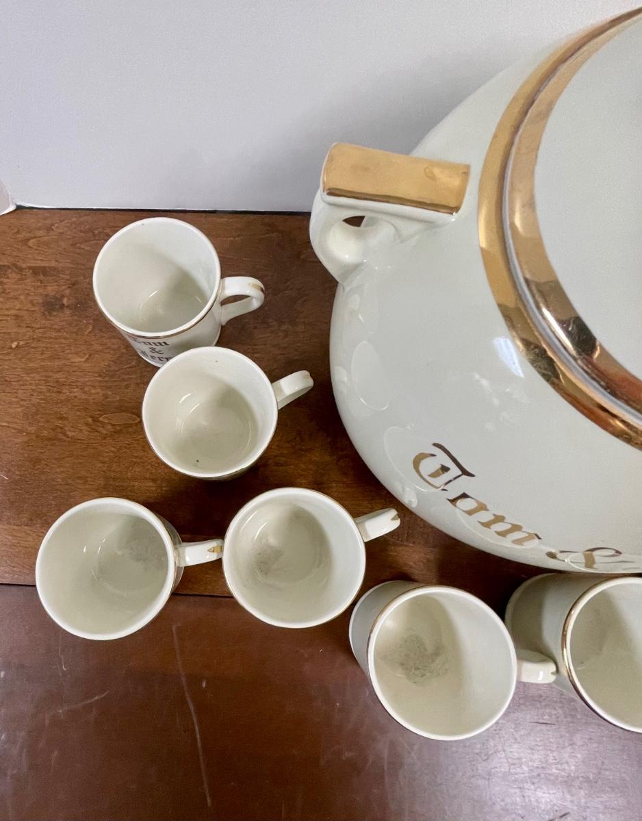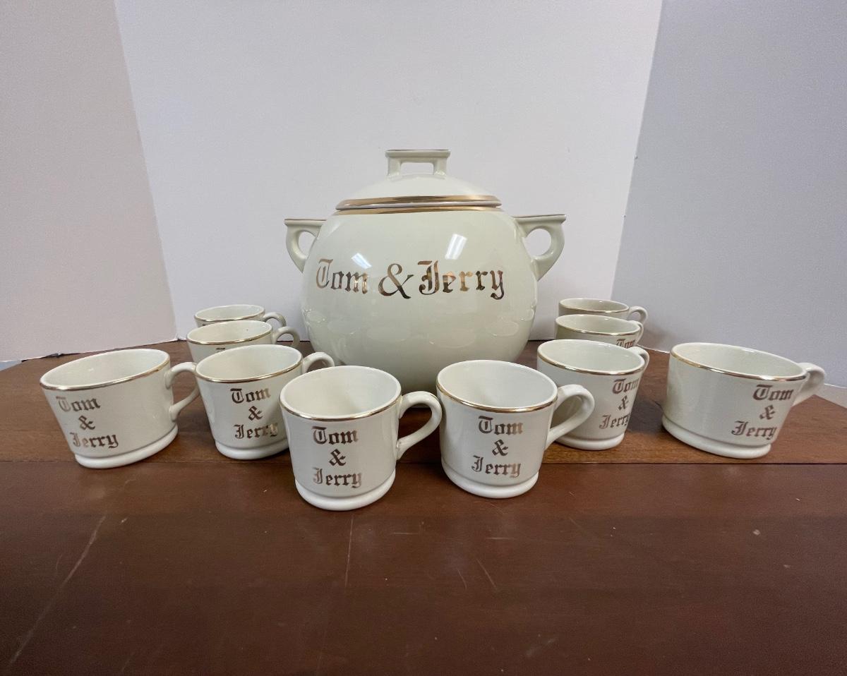 Vintage White and Gold Tom & Jerry Ceramic Bubble Lidded Punch Bowl with Cups