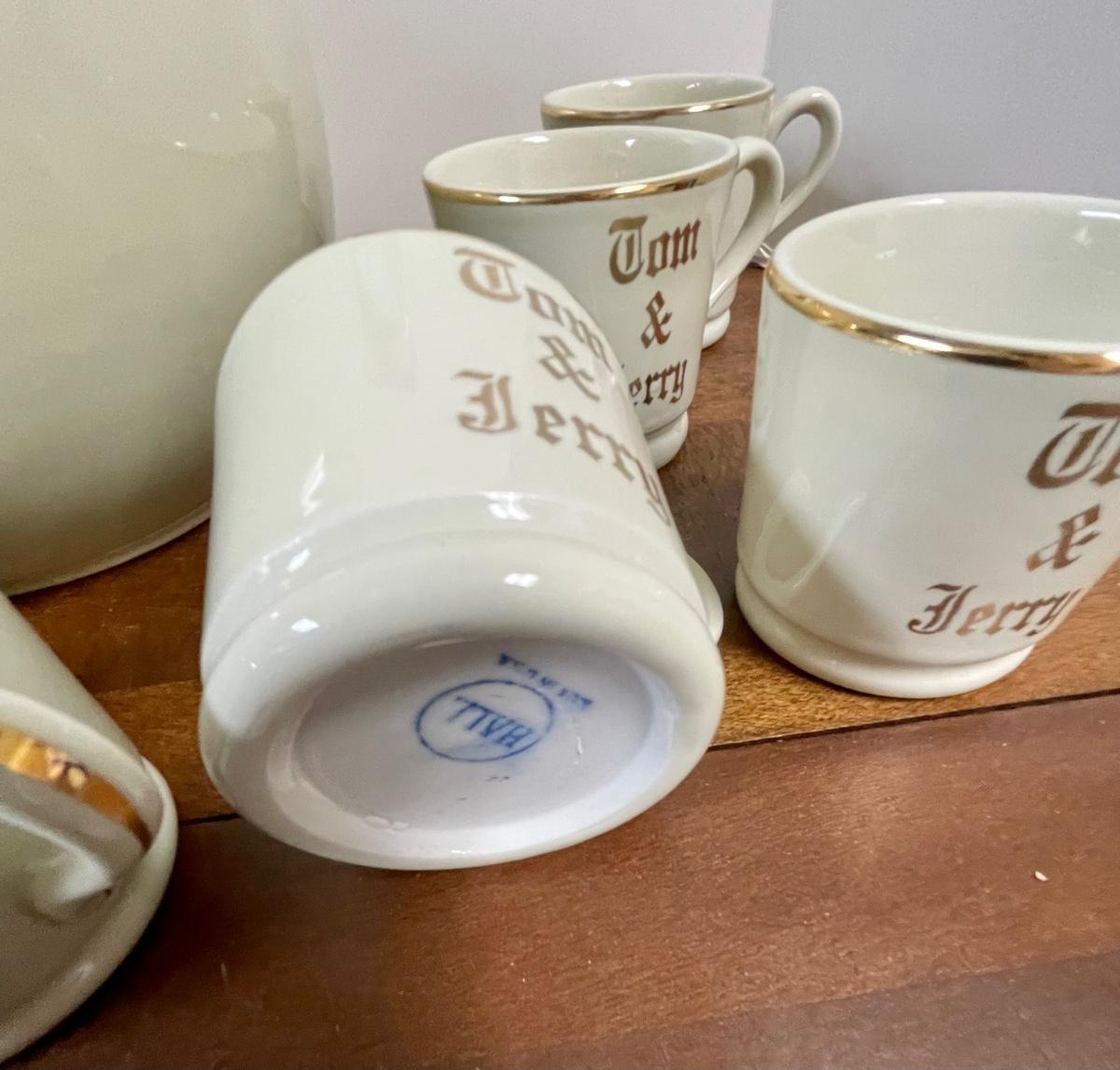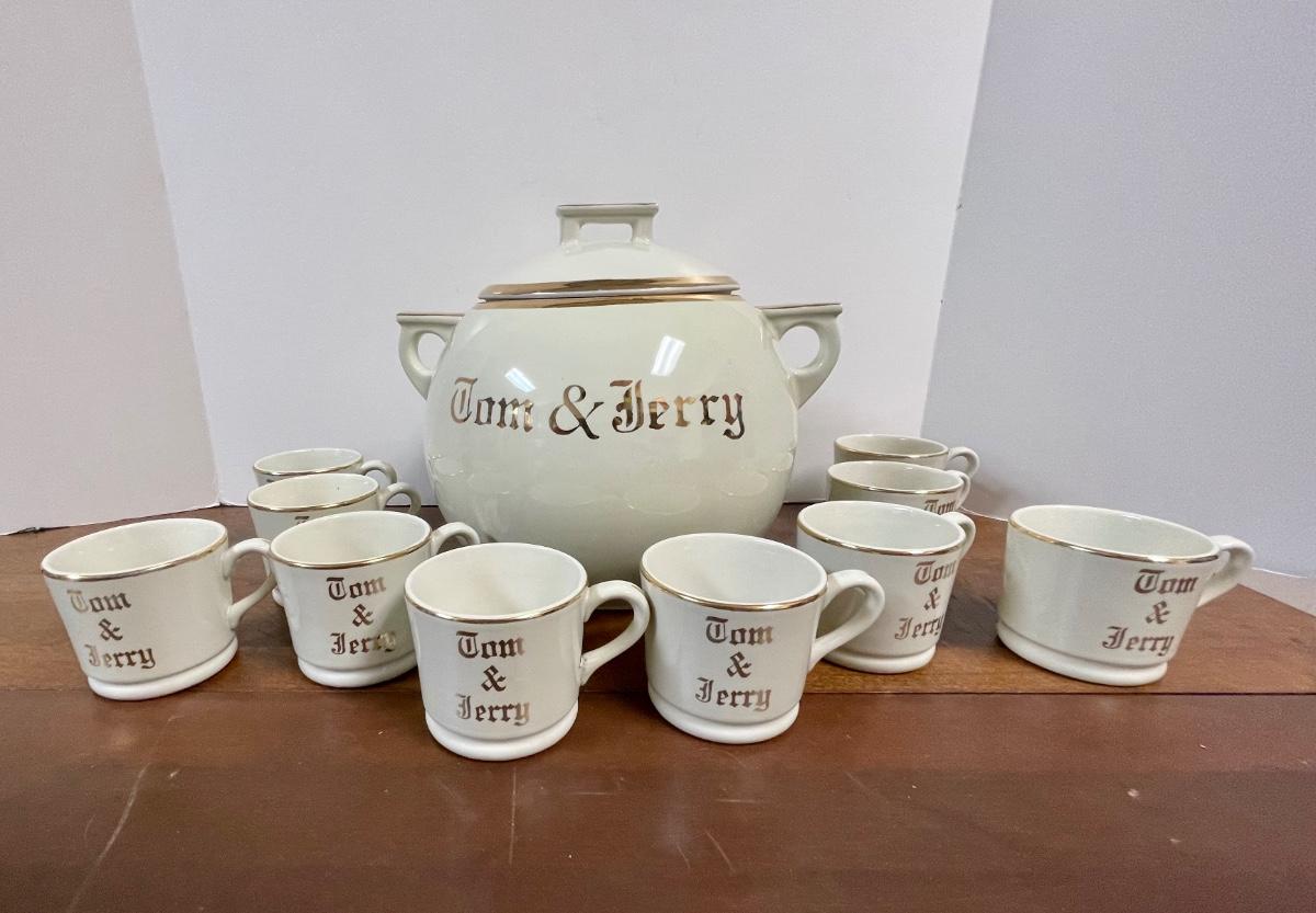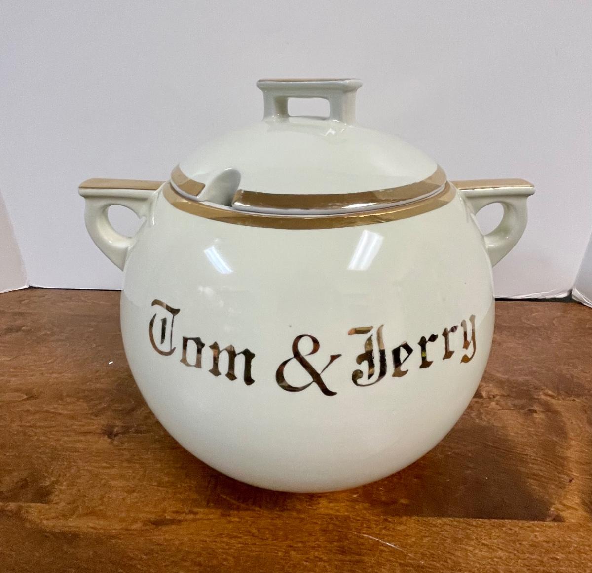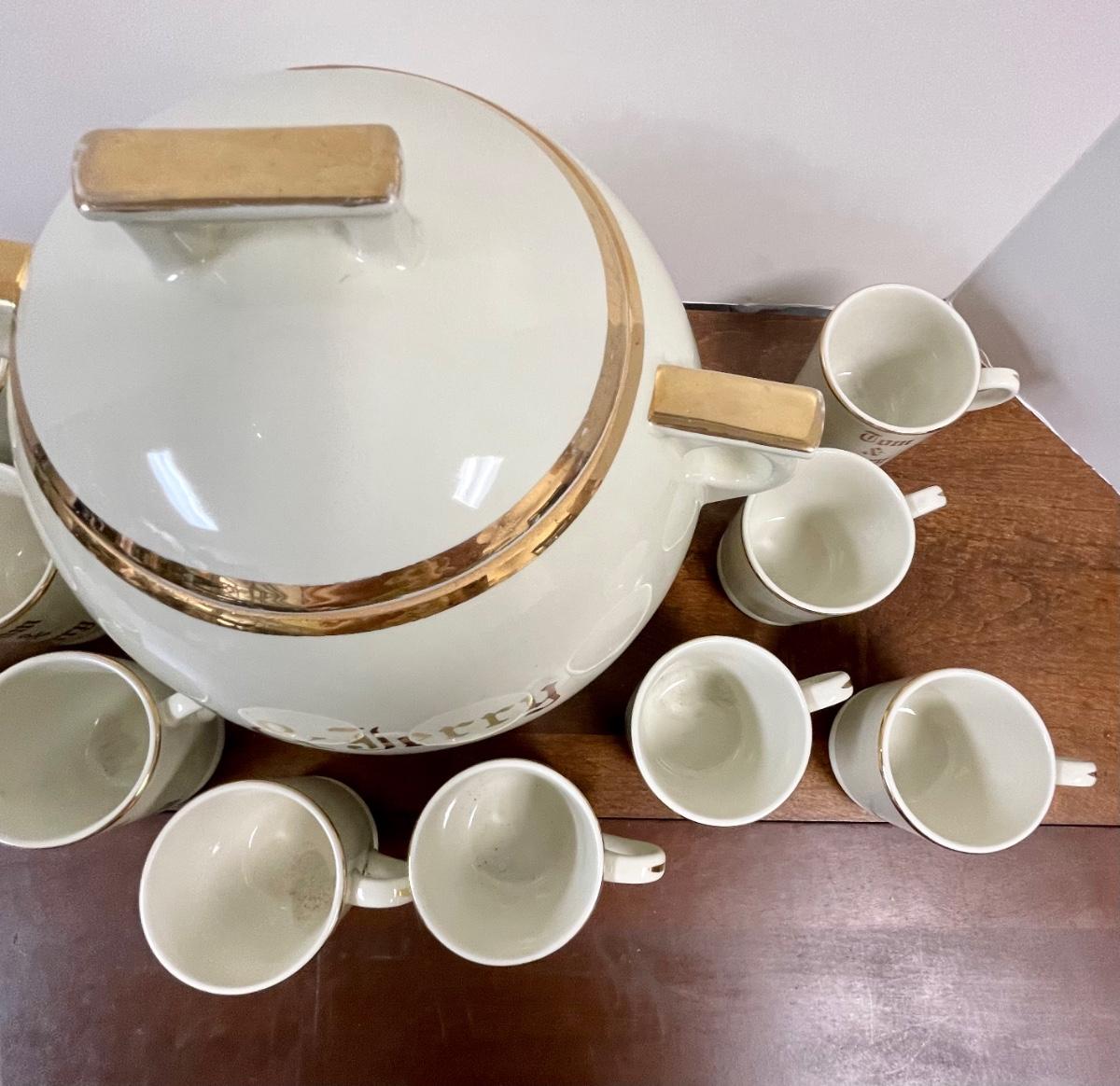 Vintage White and Gold Tom & Jerry Ceramic Bubble Lidded Punch Bowl with Cups