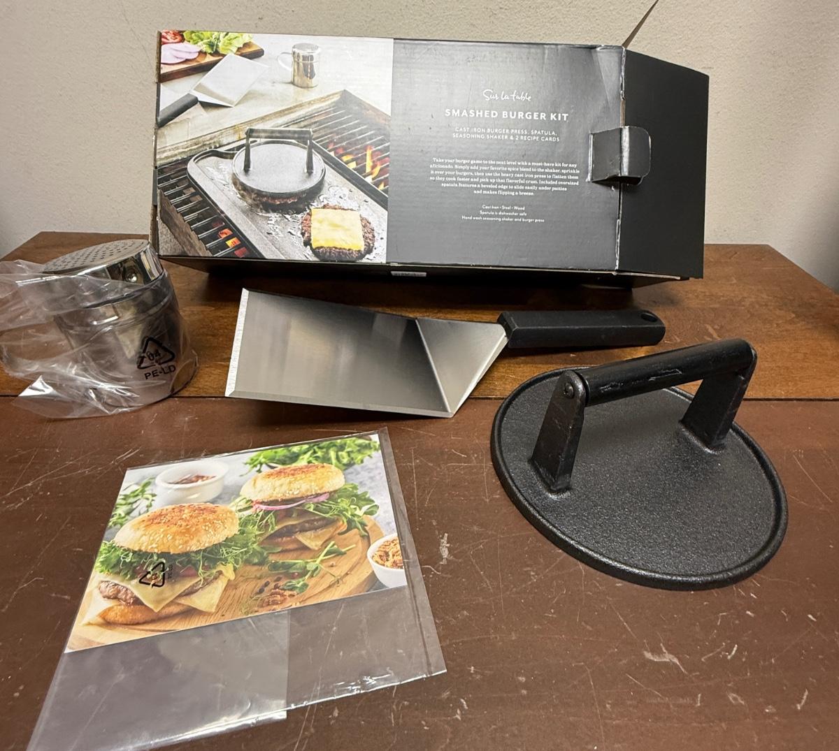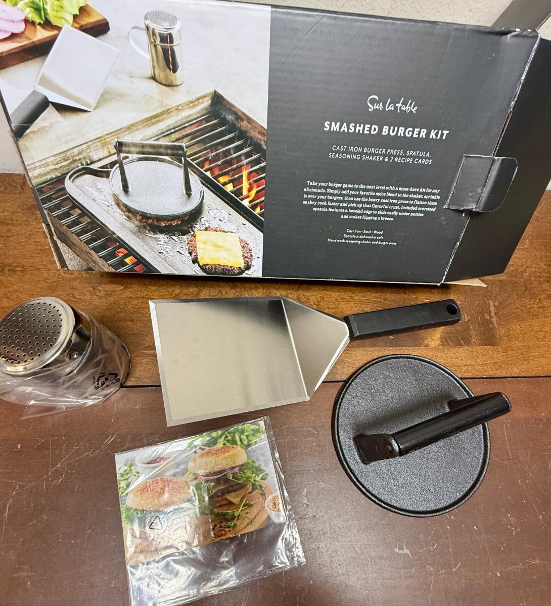 Sur la table Smashed Burger Kit - Cast Iron Burger Press, Spatula, Seasoning Shaker and 2 recipe cards.