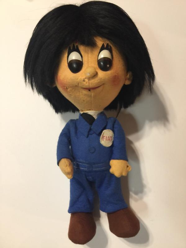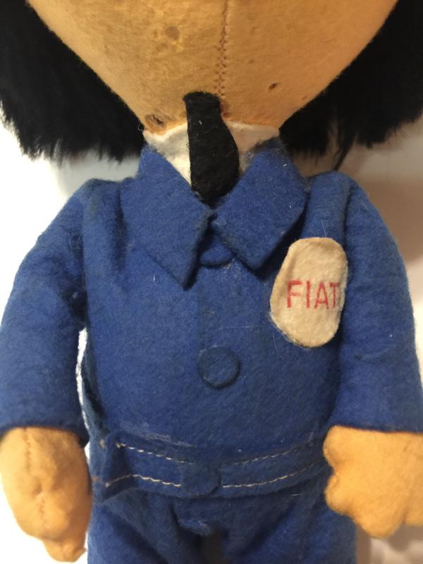 Fiat Doll - possibly from shooting a commercial or from a car show? To be honest I am not sure. This piece has baffled me for quite some time and I have been unable to discover its story. It is a very well-made doll. Plush and made of felt with I believe mohair for hair. It does have a few moth holes. This is far too well made to have not been for commercial reasons or purposes. However after doing research I believe this is probably the only one made. My guess is it was probably used to shoot a commercial or as a display at a car show. However I cannot find a commercial featuring this Doll or any reference to it. Which leads me to believe that it may have been created but never used. In any case is it very cool one of a kind, Fiat collectible, and a great item for any car collector or Fiat enthusiast.