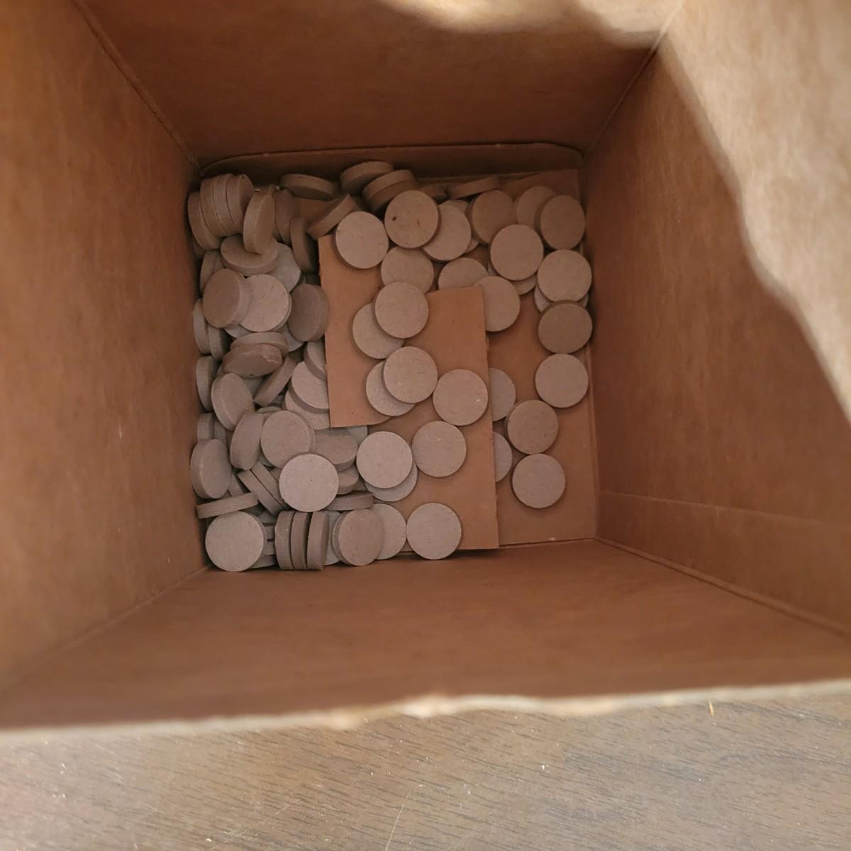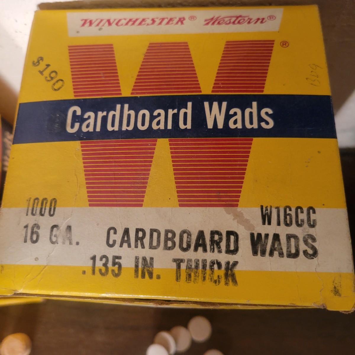 Two boxes of shotgun wads. One box is molded fiber wads for a 12 ga and is almost full. The other is cardboard wads for a 16 ga and is almost empty. Shipping available