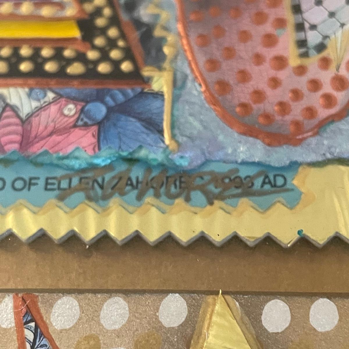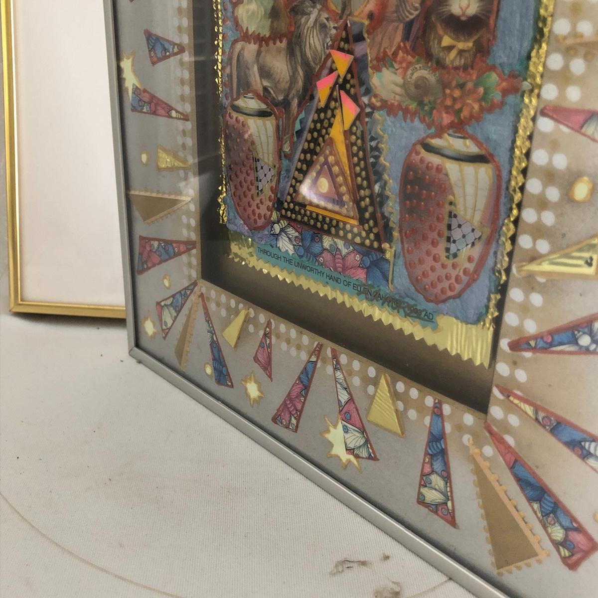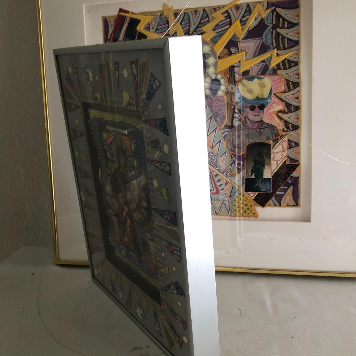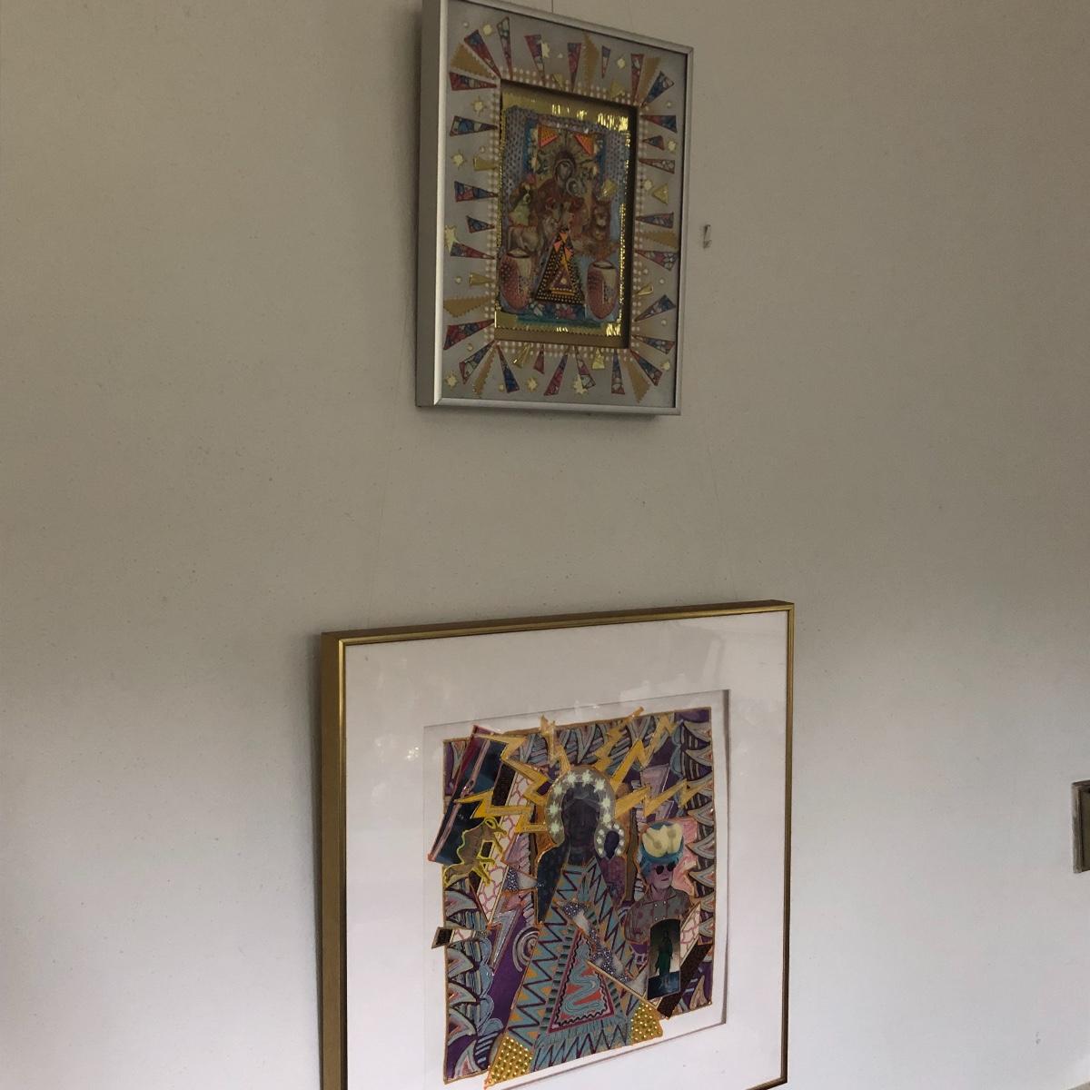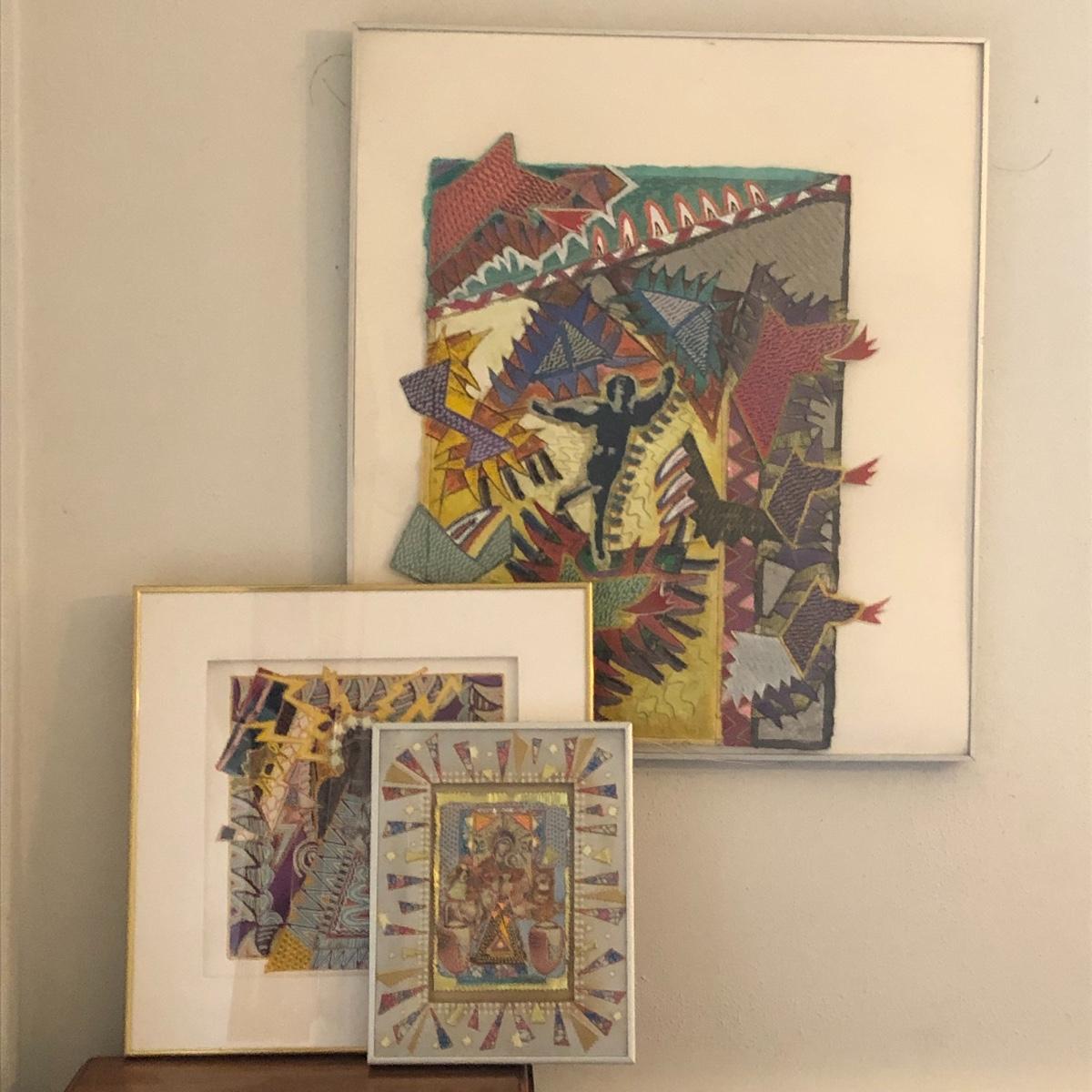 Three gorgeous pieces of fiber art by local artist Ellen Zahorec. All are framed in a shadow box style, two frames are silver colored, the other gold; gold frame measures 20” square.