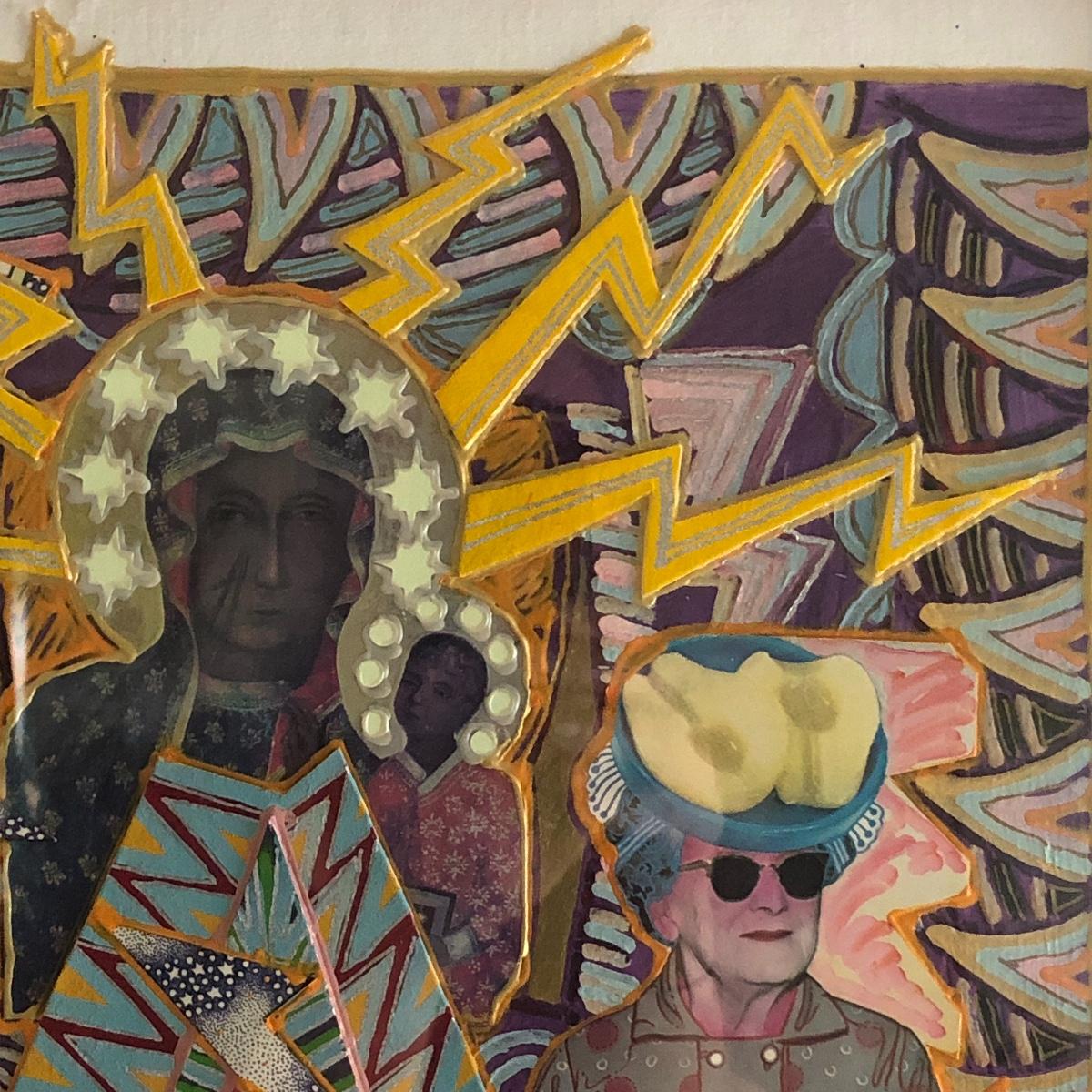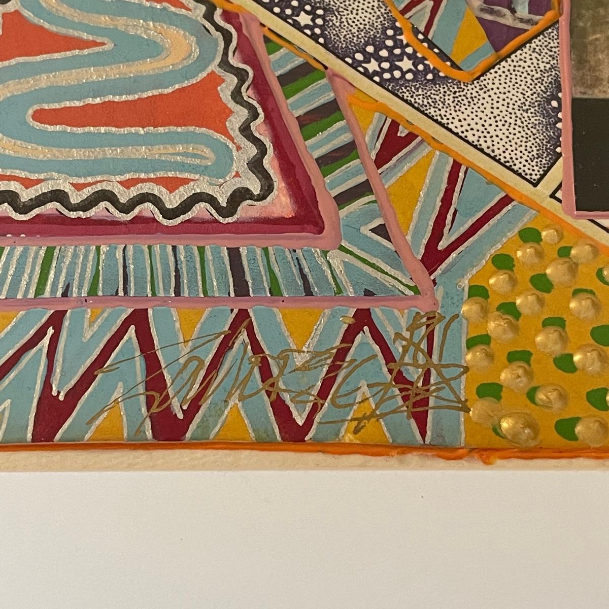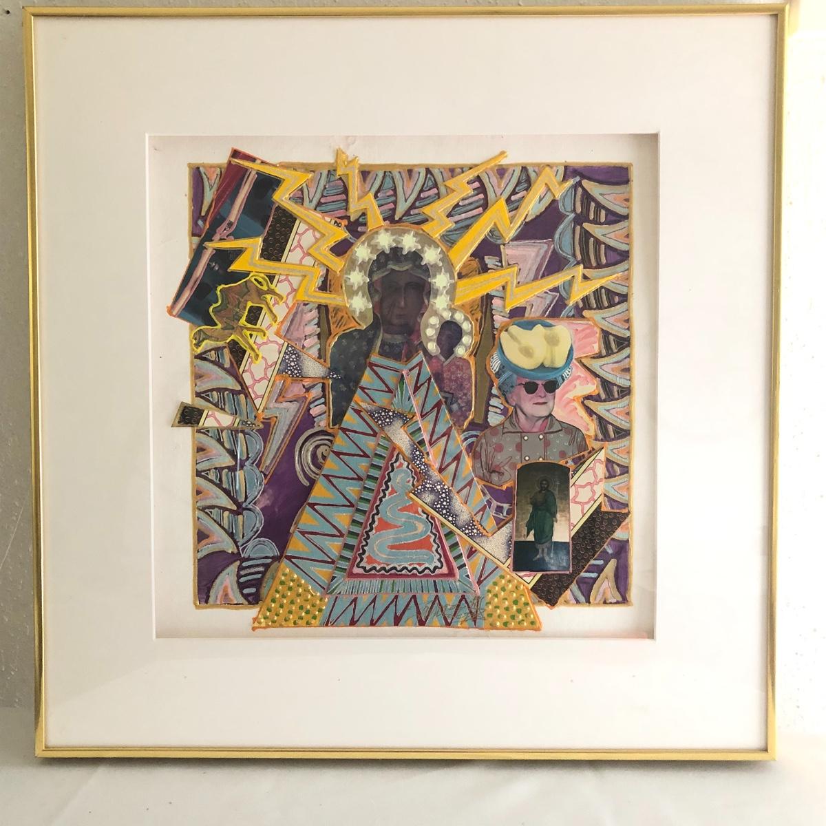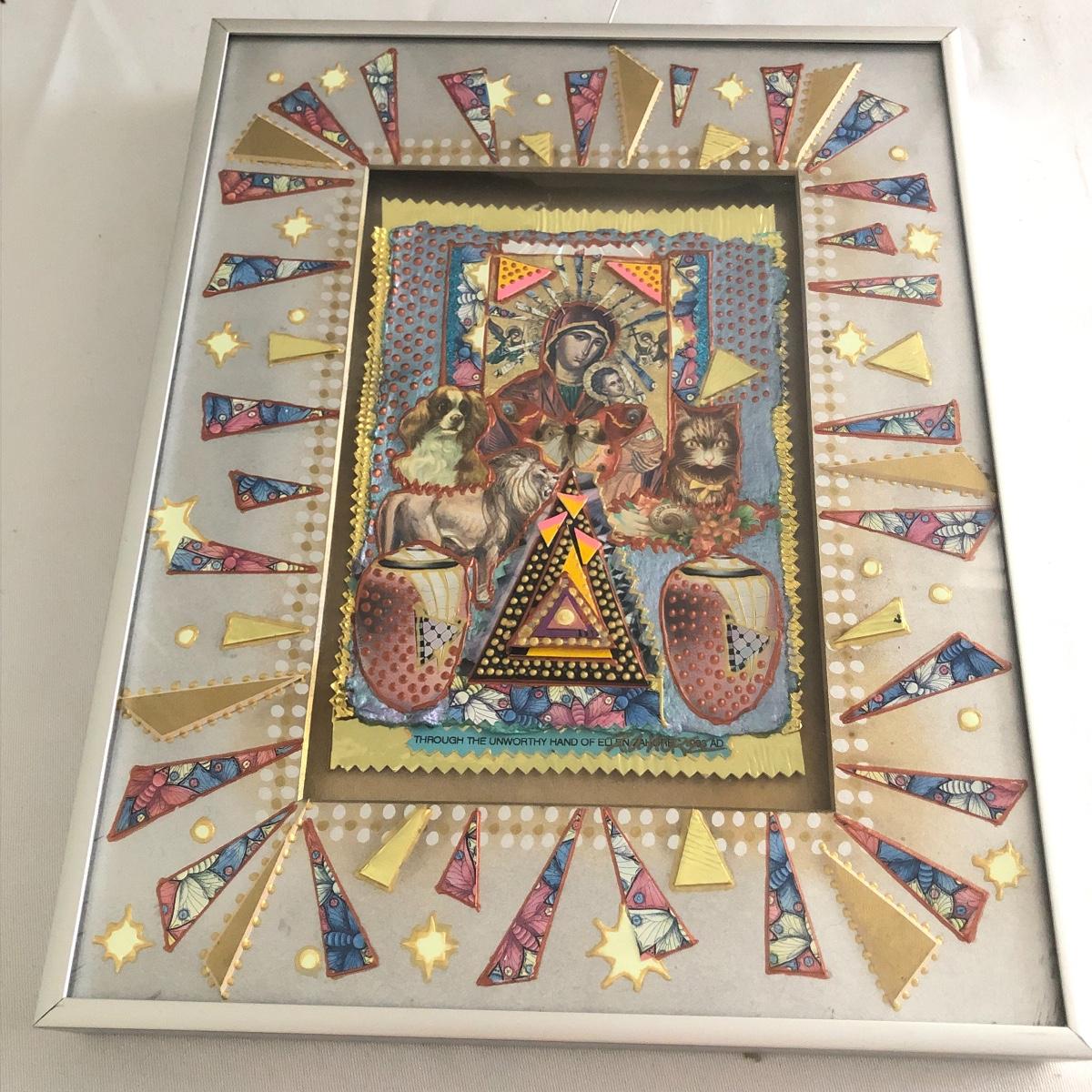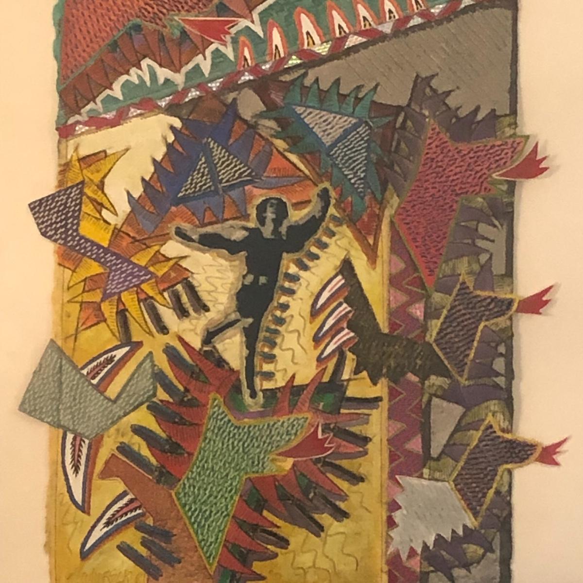 Three gorgeous pieces of fiber art by local artist Ellen Zahorec. All are framed in a shadow box style, two frames are silver colored, the other gold; gold frame measures 20” square.