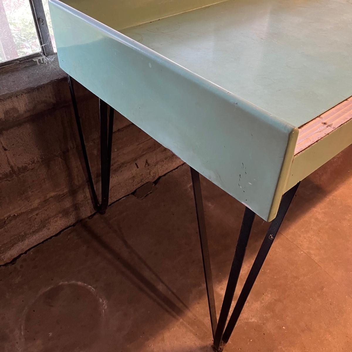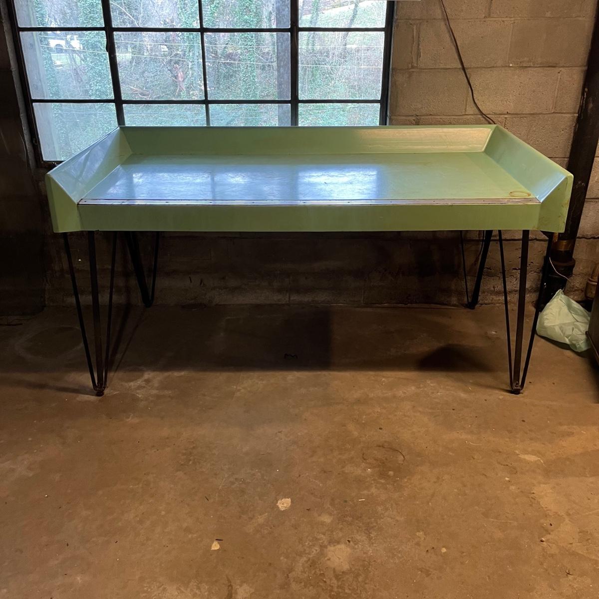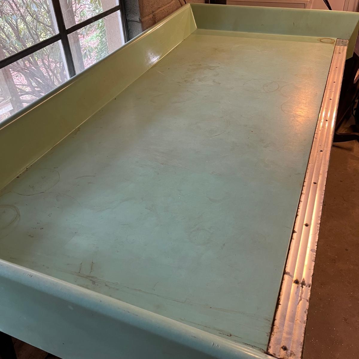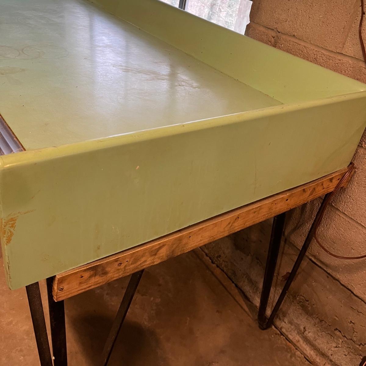 Lot includes a large fiberglass laundry folding table with iron legs. Could be used for clay or a potting table. Table has some stains and measures 35” x 73” x 38.5”. Bring help to move as item is substantial.