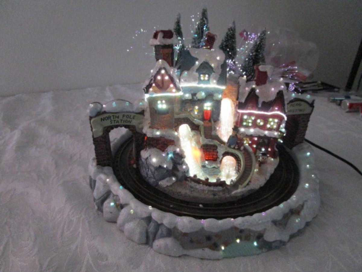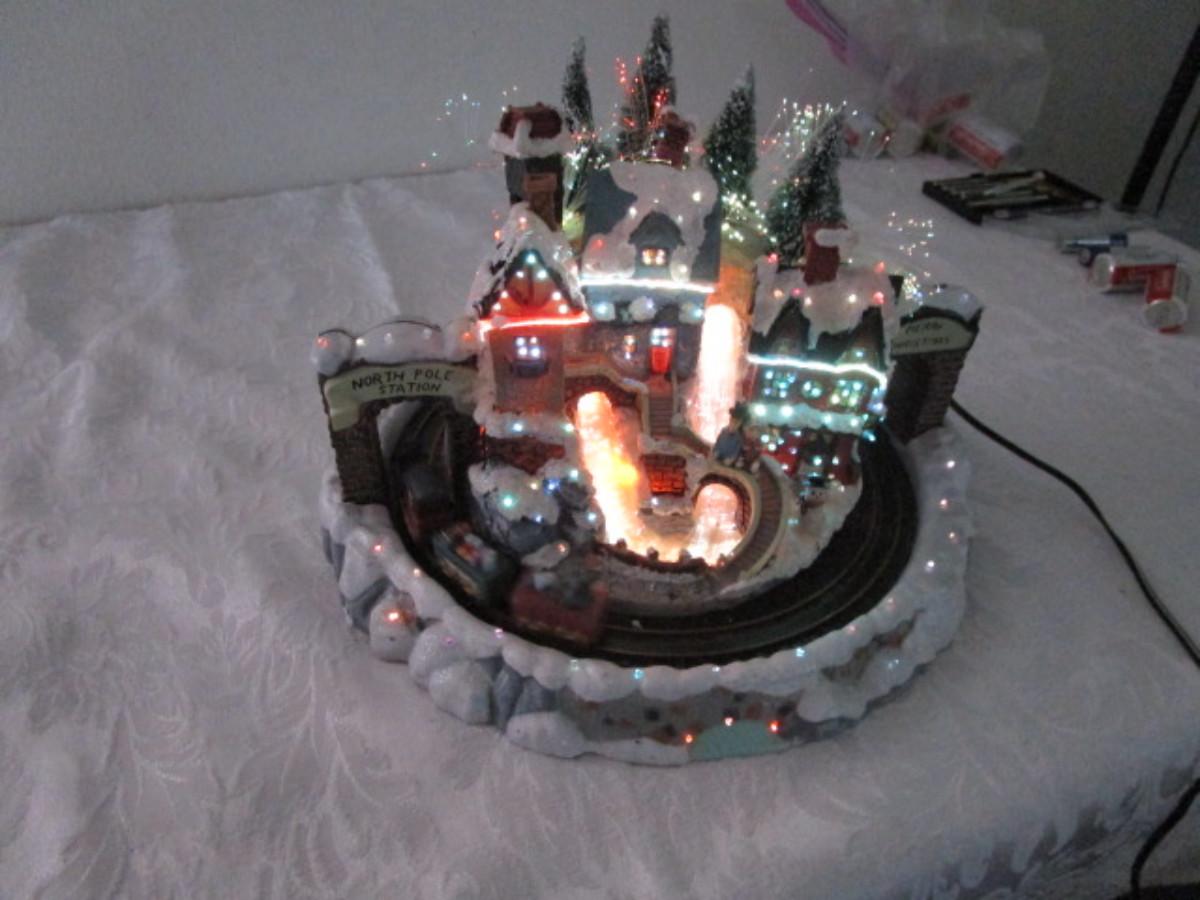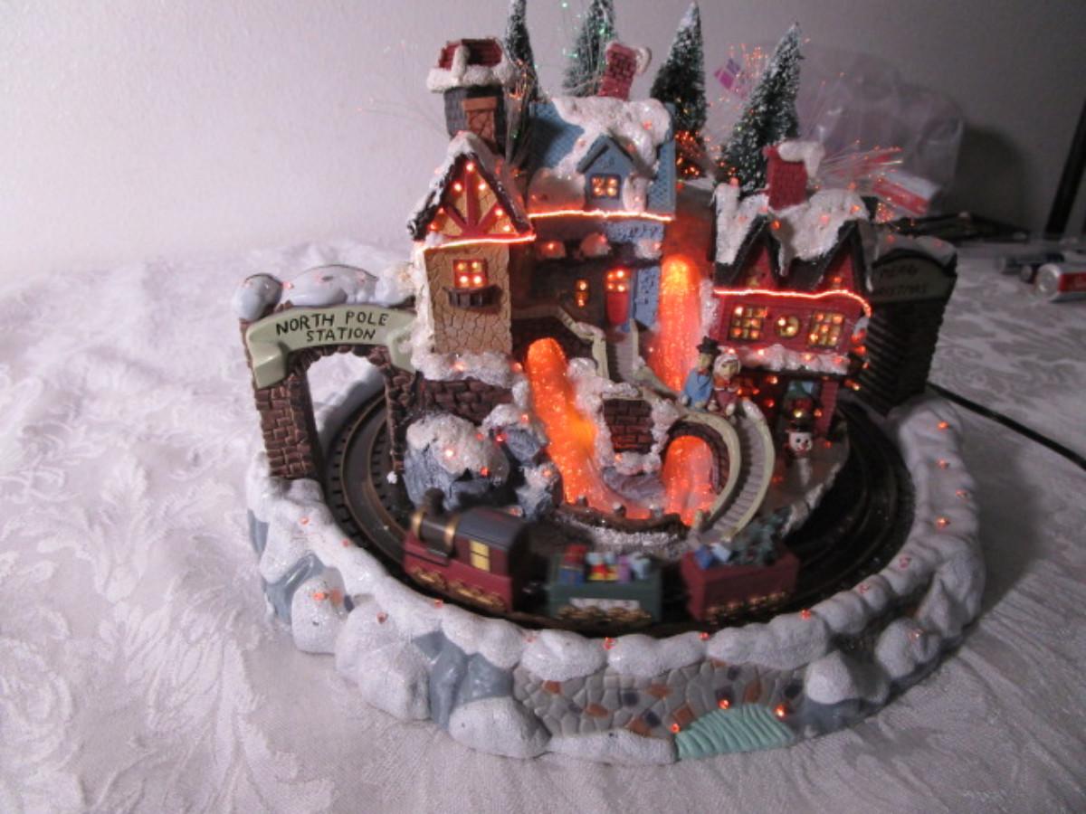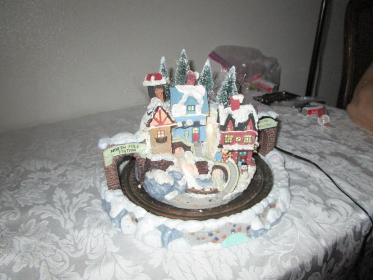 Train goes around the village, has AC power adapter; 11" in diameter x 8" tall.
