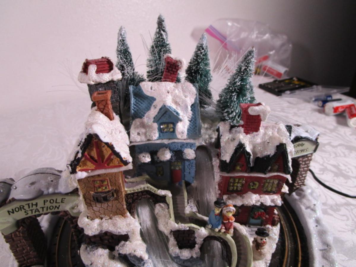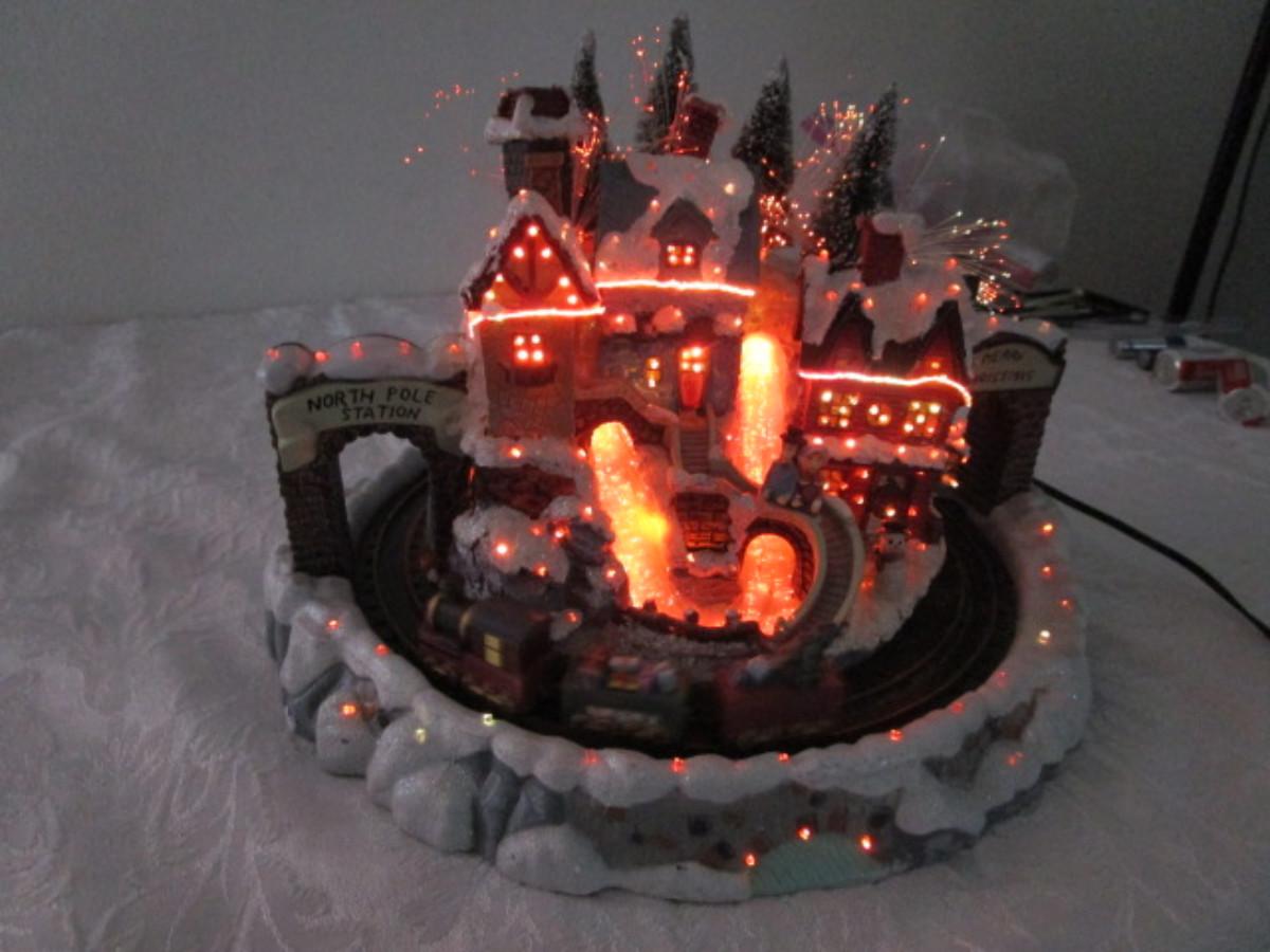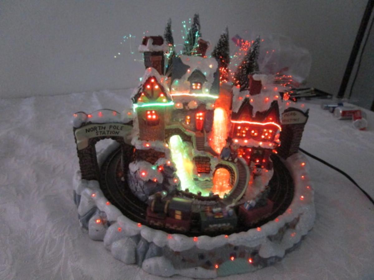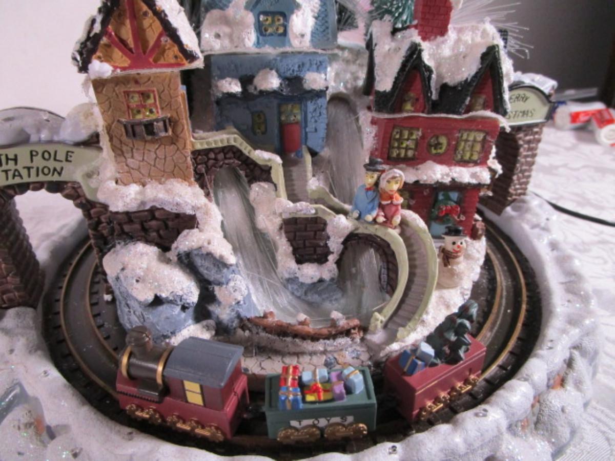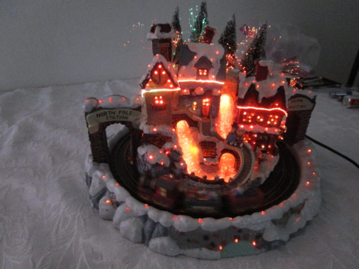 Train goes around the village, has AC power adapter; 11" in diameter x 8" tall.
