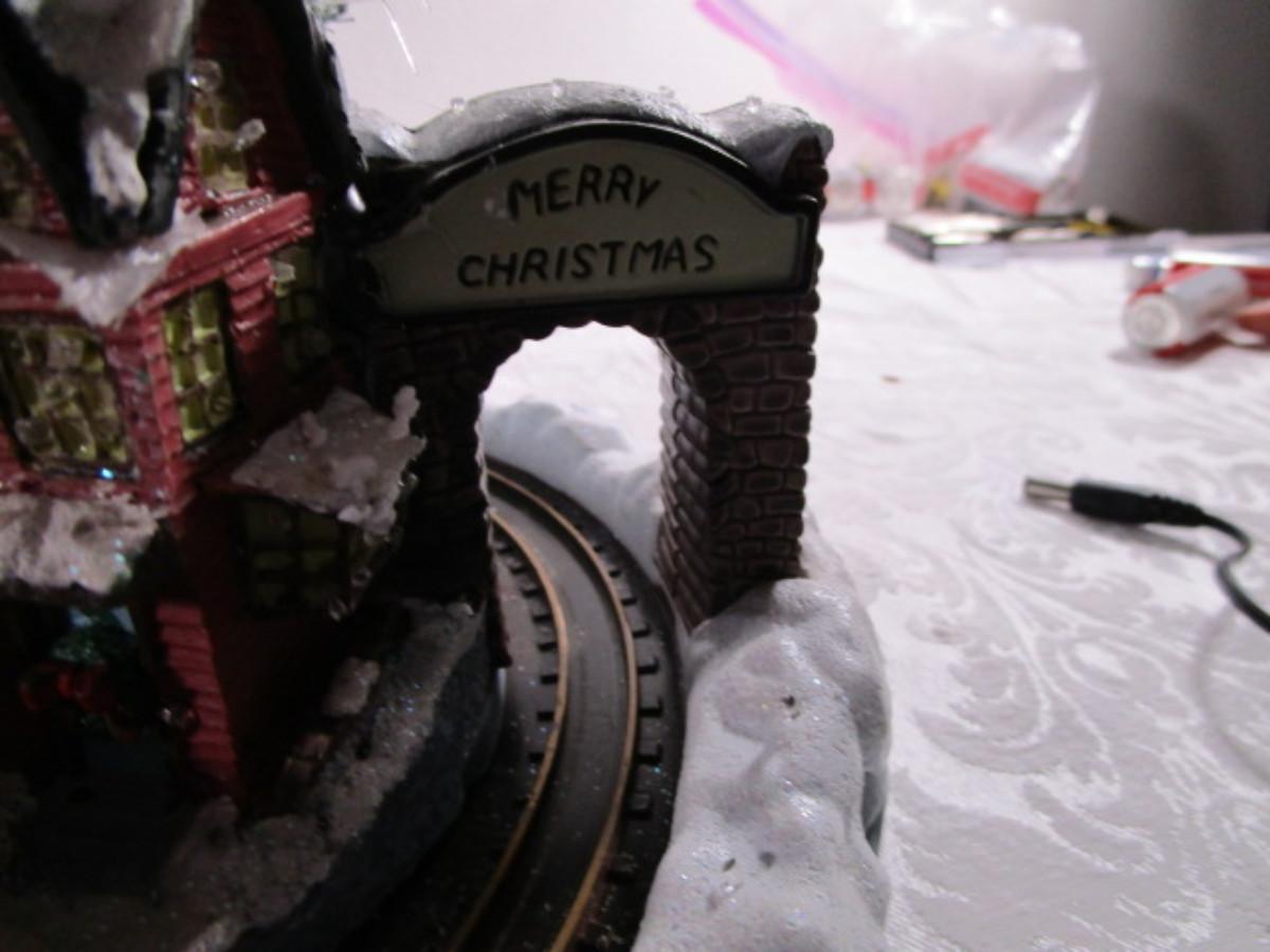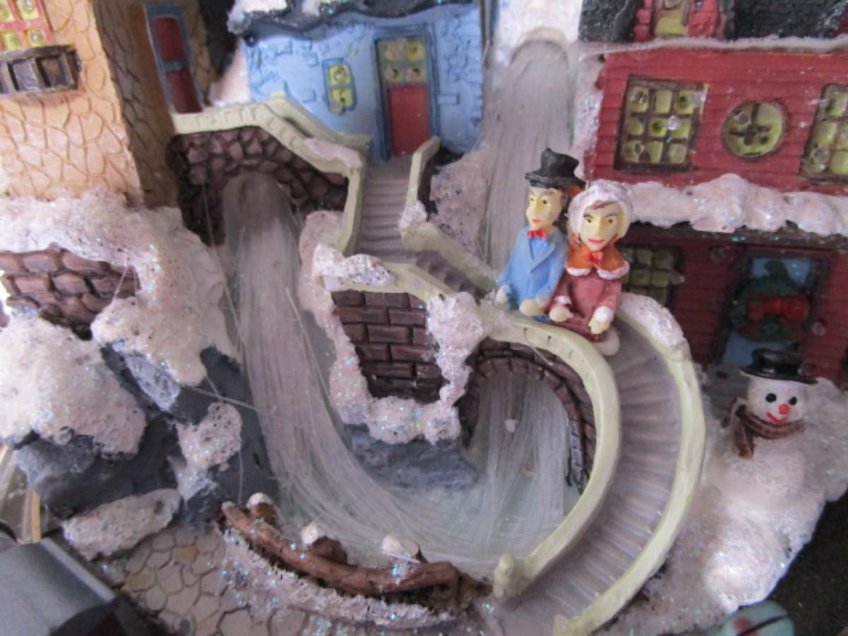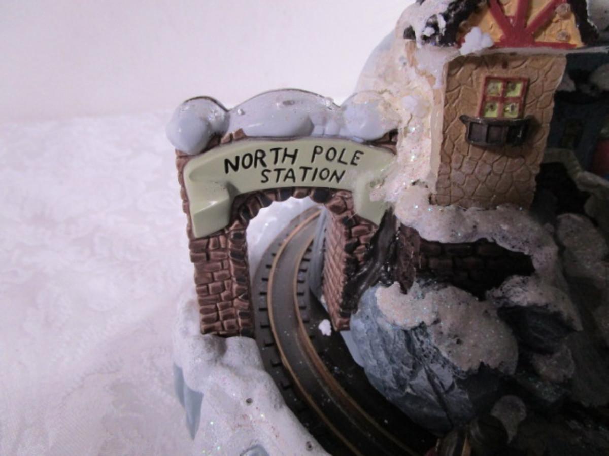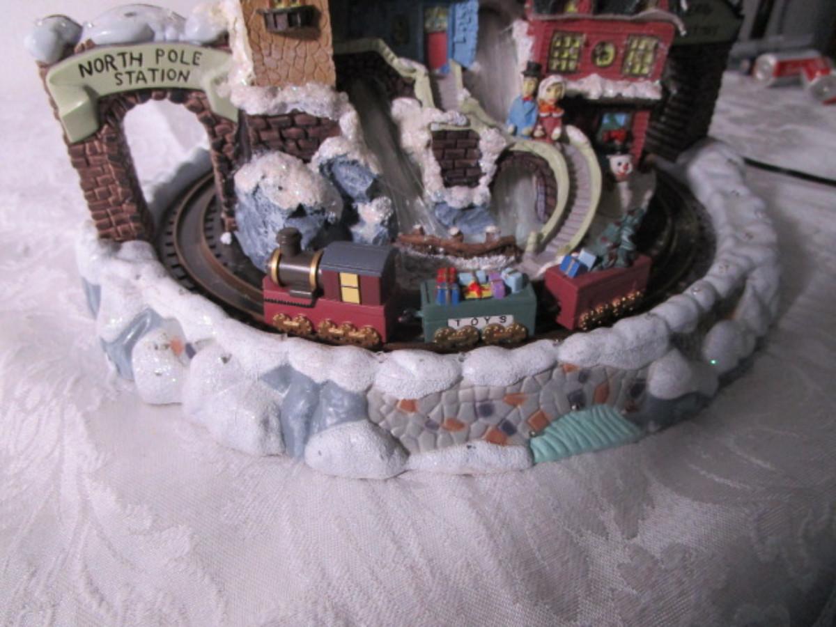 Train goes around the village, has AC power adapter; 11" in diameter x 8" tall.